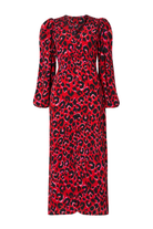 Red with Pink and Black Pop Leopard Blouson Sleeve Midi Tea Dress