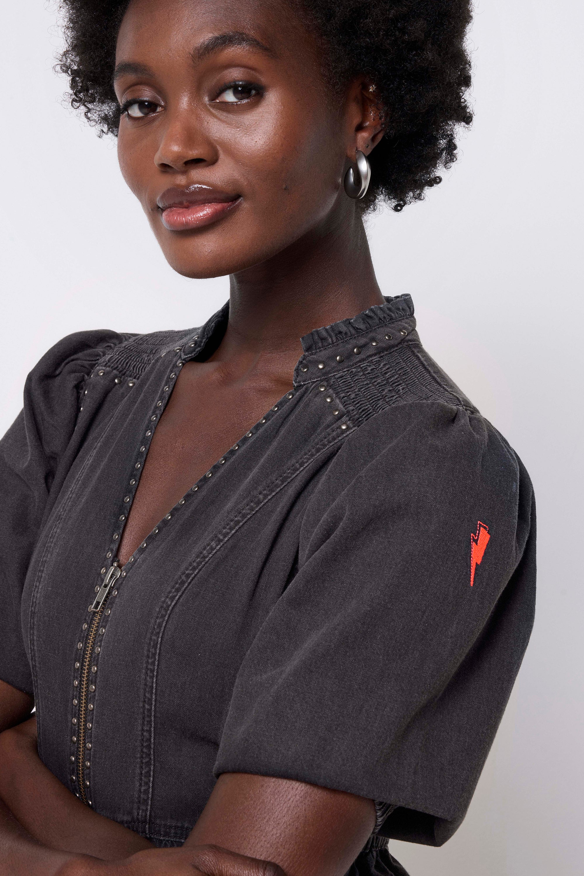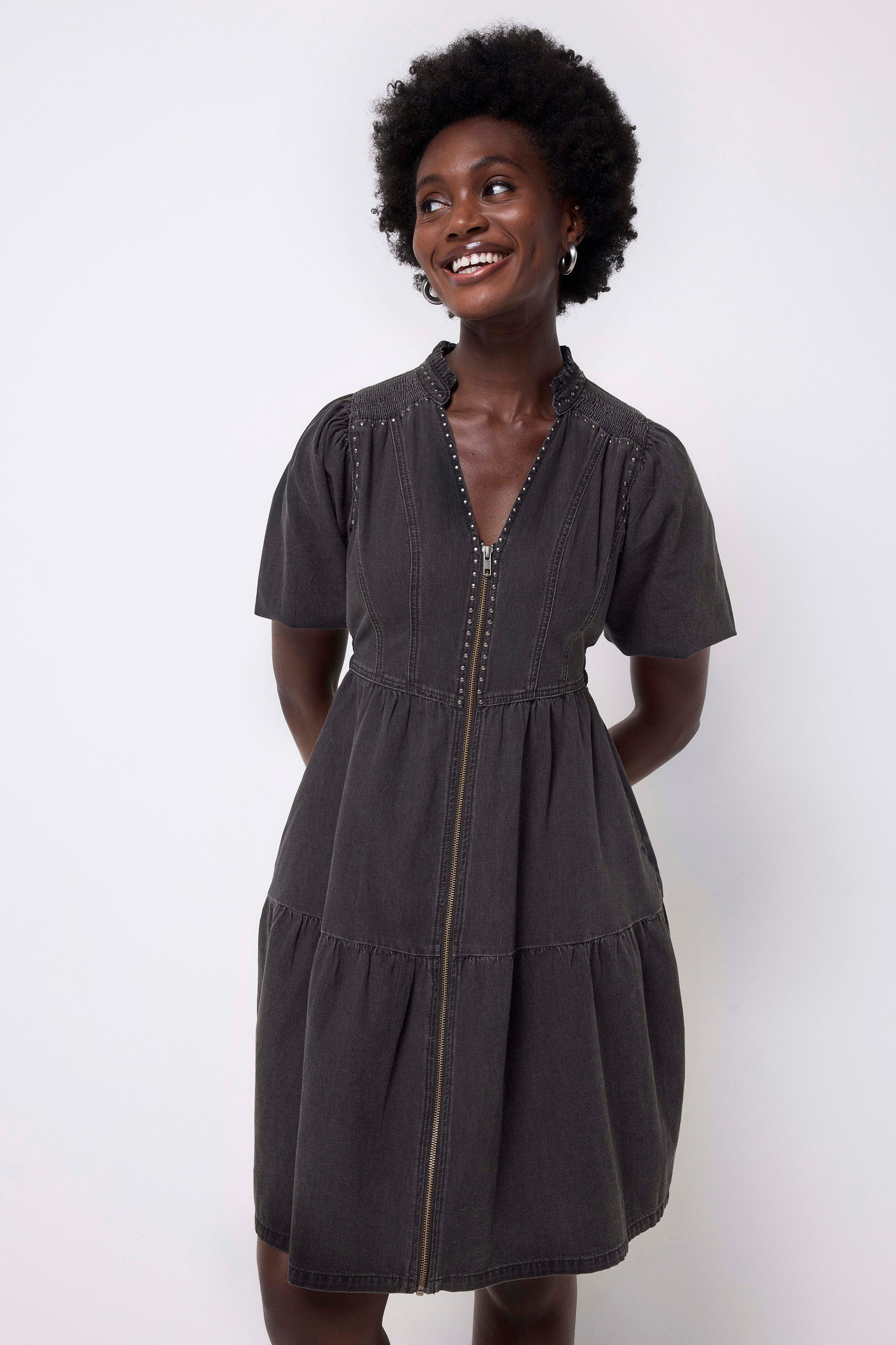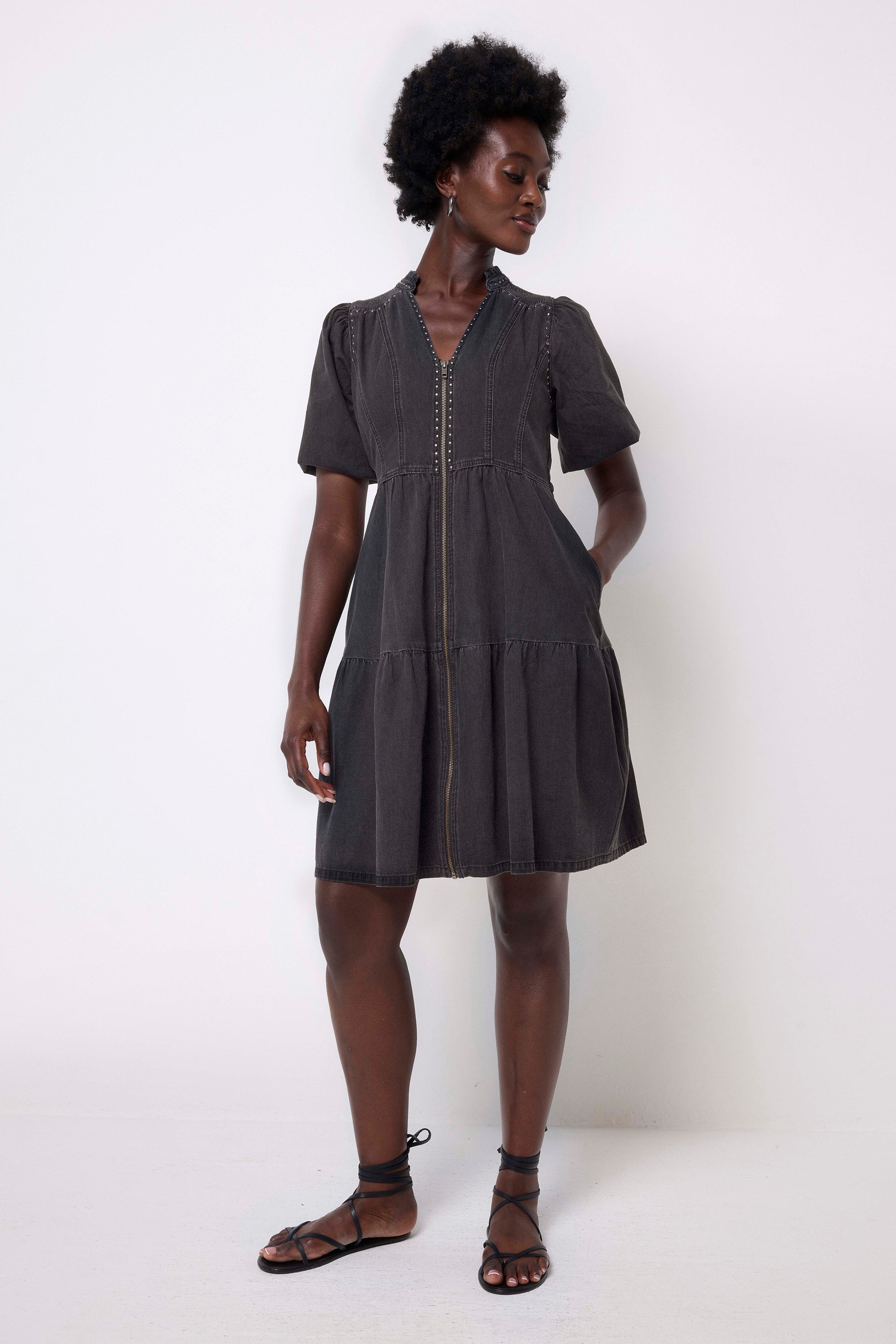 Washed Black Studded Zip Detail Tiered Short Denim Dress