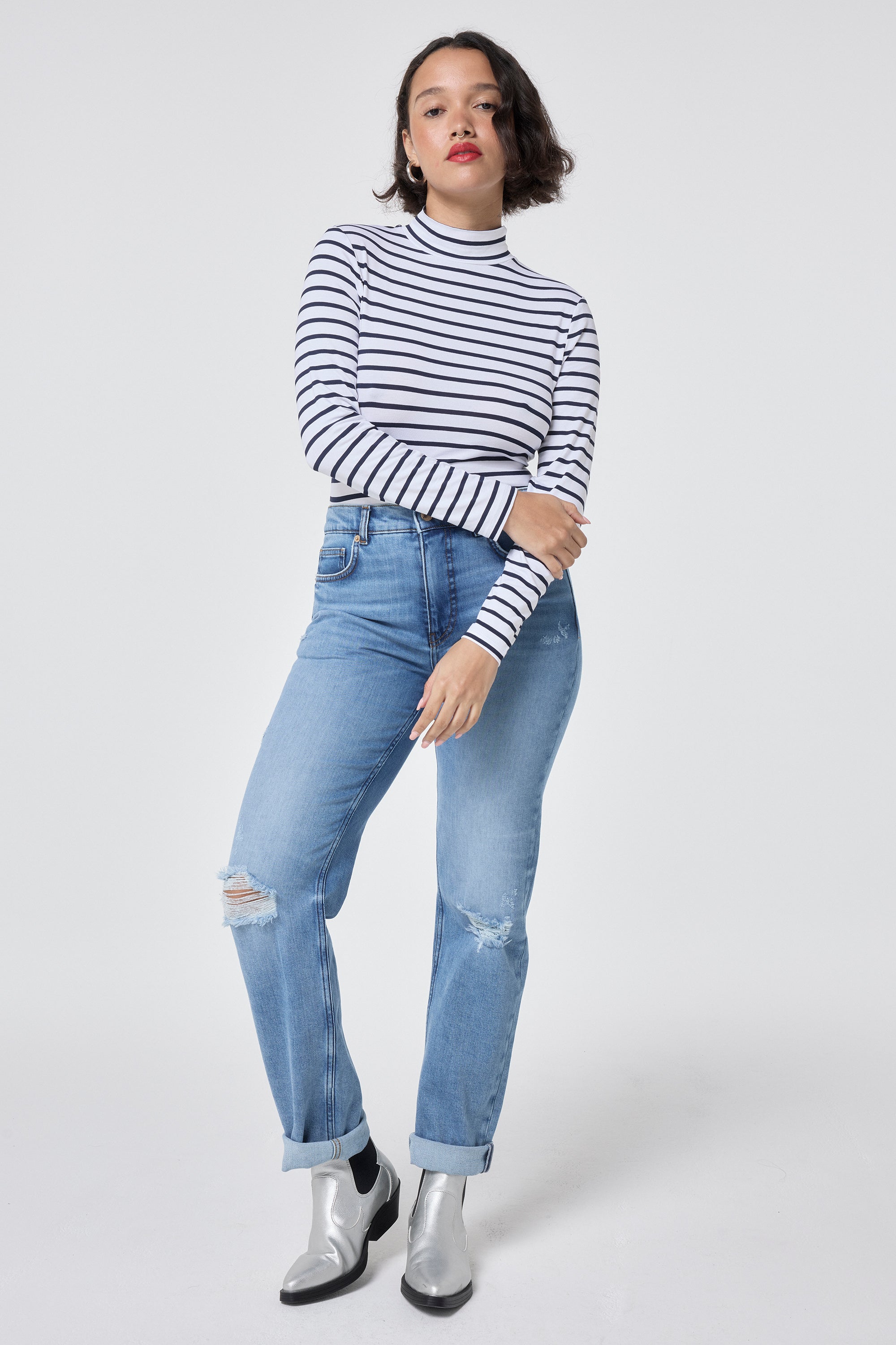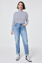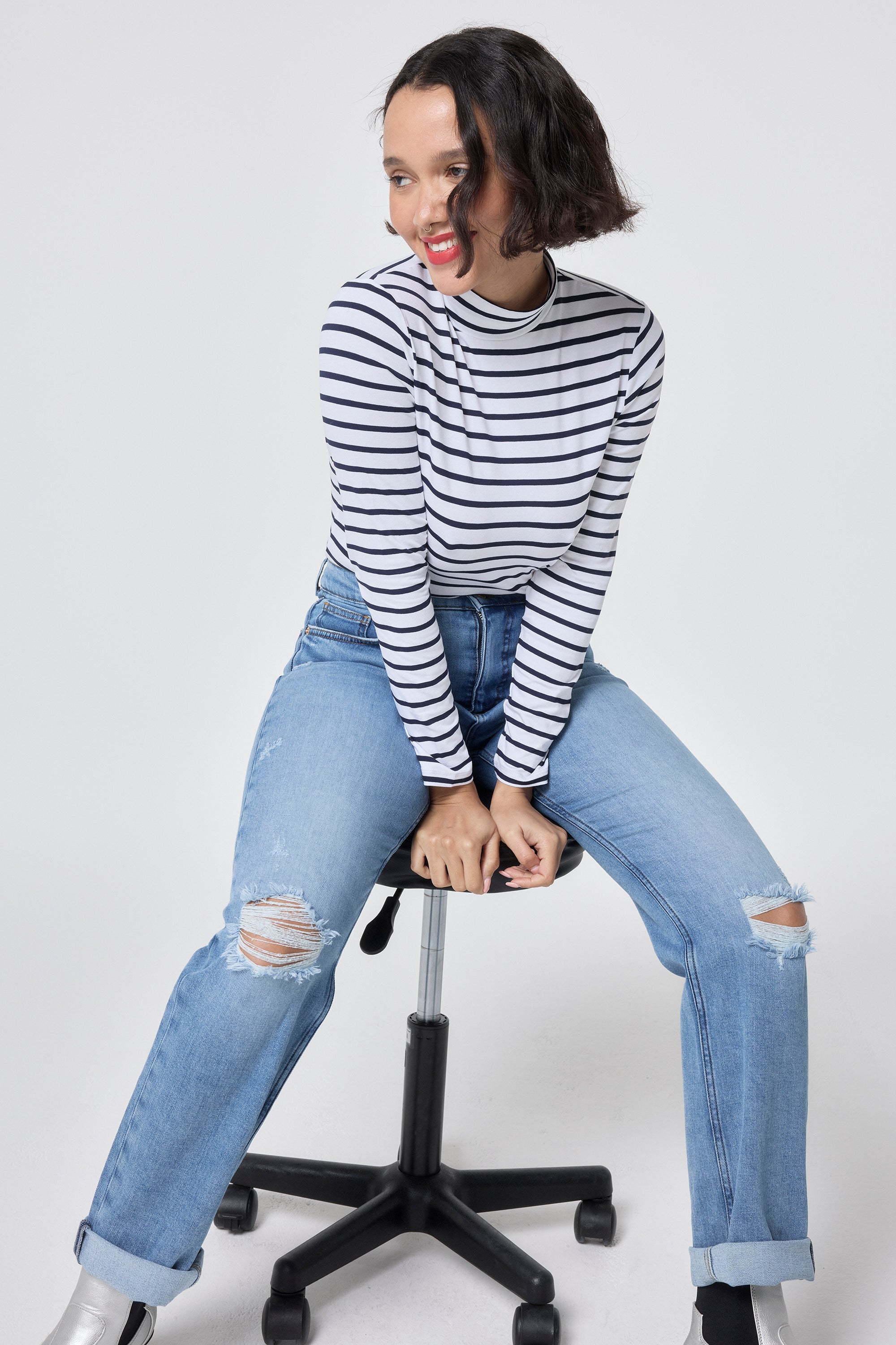 Make a statement in our ivory with navy stripe long sleeve top. Complete with a high neck and long sleeves, this comfortable piece will be the perfect addition to your wardrobe. We'll be pairing ours with dark denim and trainers for a casual yet stylish outfit.