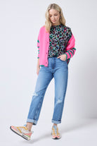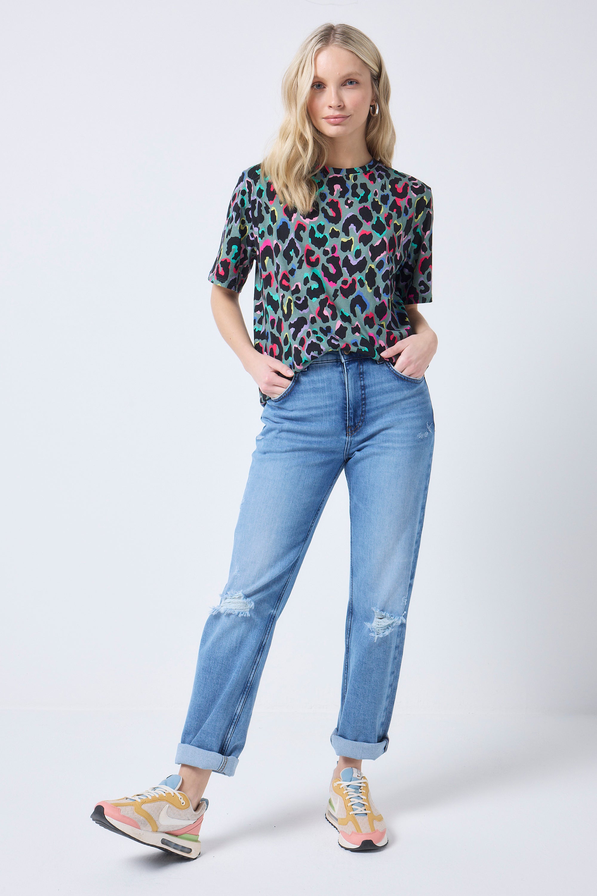 Our khaki with rainbow shadow leopard and lightning bolt print will become your off-duty staple. It's stylish, comfy and filled with superpowers. Complete the look with a pair of flattering Scamp & Dude jeans.