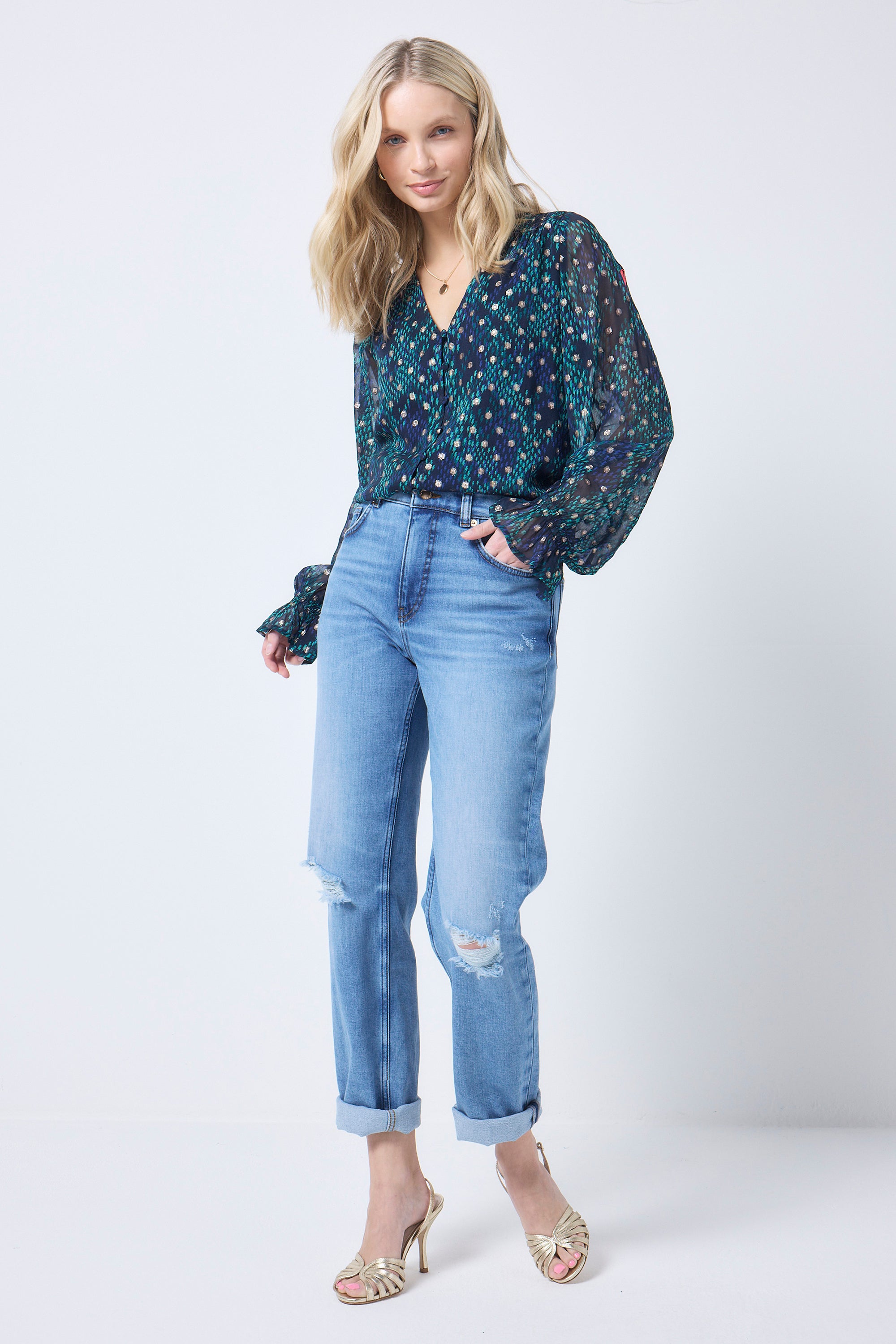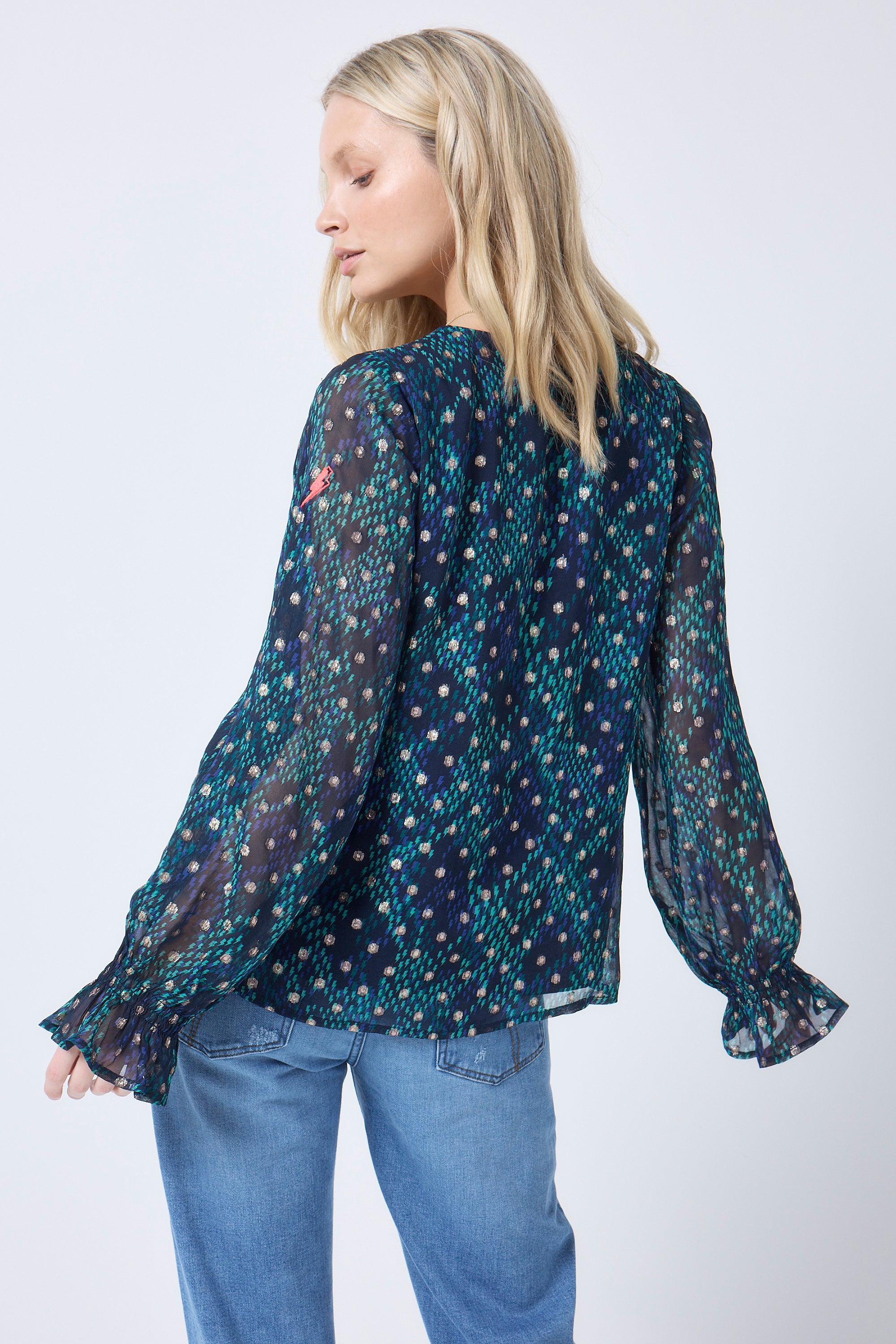 - Full length blouson sleeves with shirred fluted cuffs