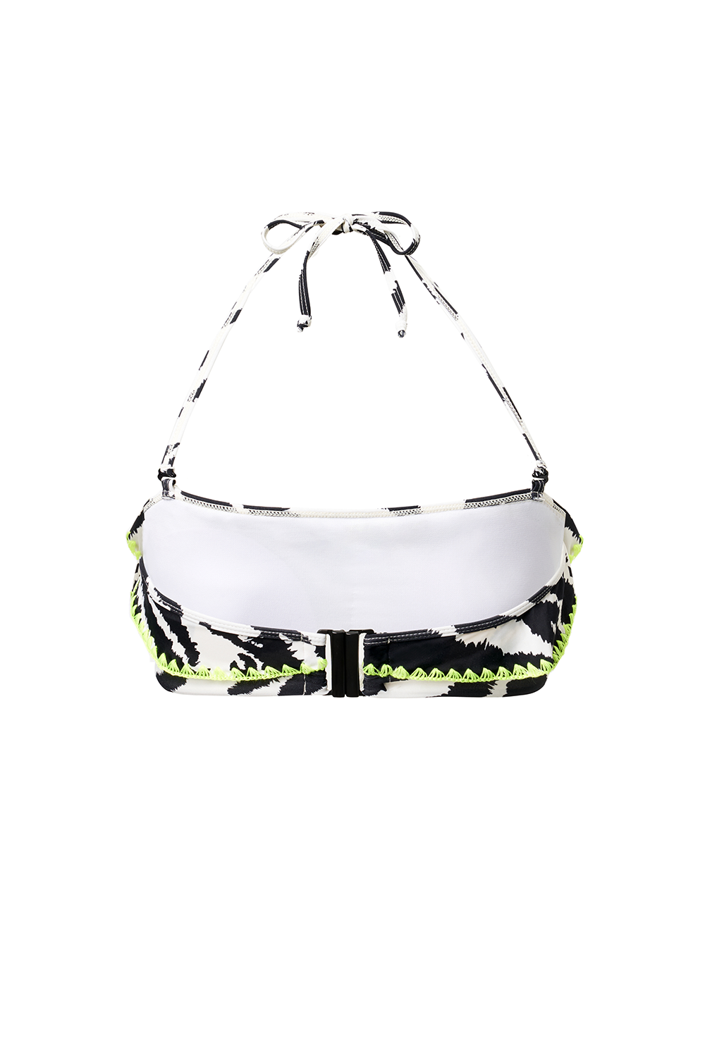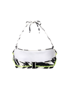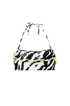 Soak up the sun with our ivory bandeau bikini top, adorned with a daring tiger and lightning bolt print. Designed with soft, stretchy fabric for supreme comfort, the removable adjustable tie straps allow for a personalised fit and neon yellow stitching adds a striking touch. Perfect for a sun-drenched beach day, this top promises a stylish adventure by the sea.