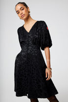 Feel confident in our black jacquard leopard tea dress. Featuring a timeless v-neck, short puff sleeves and cut to a mini length, style yours for the day with trainers or evening plans with heels.