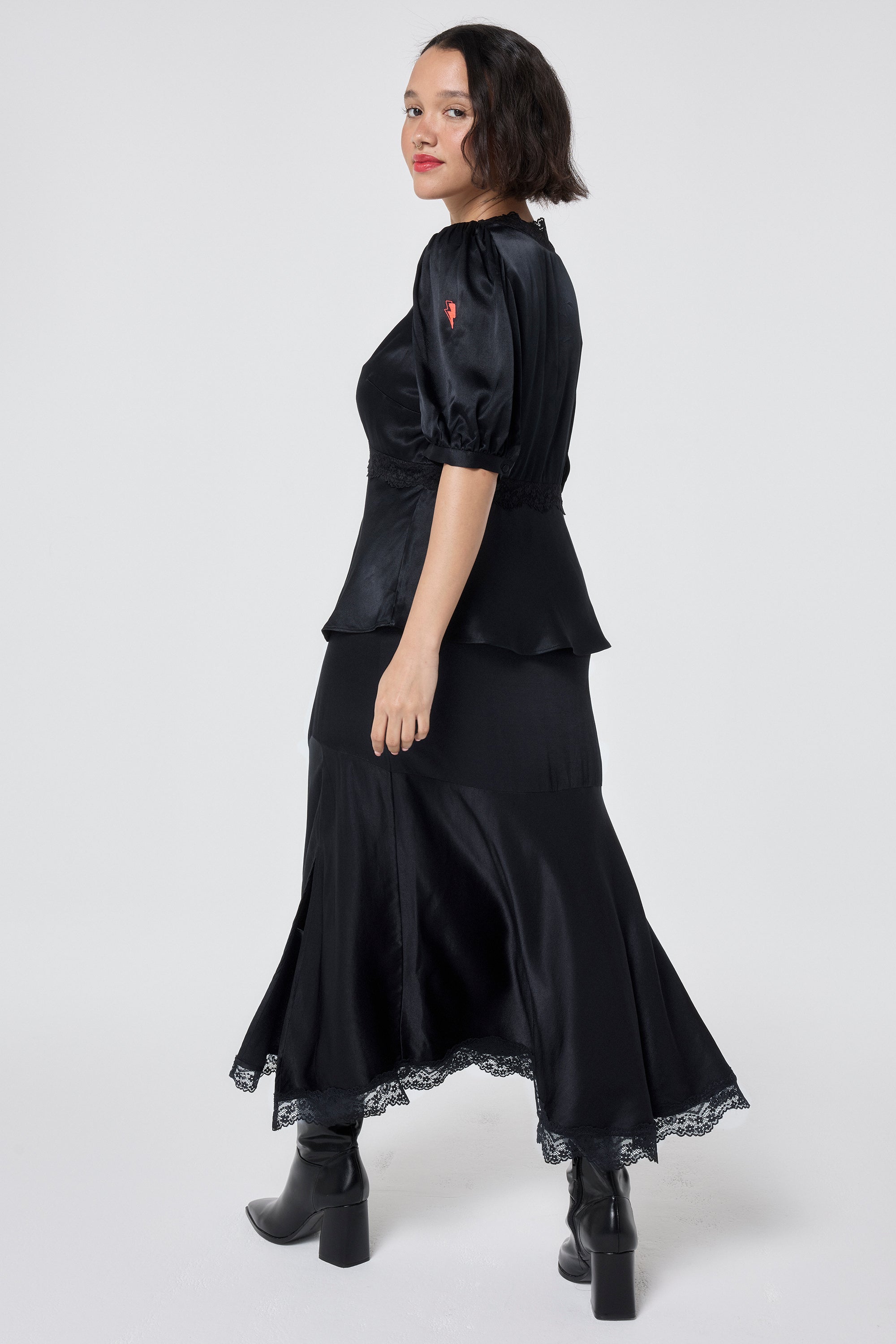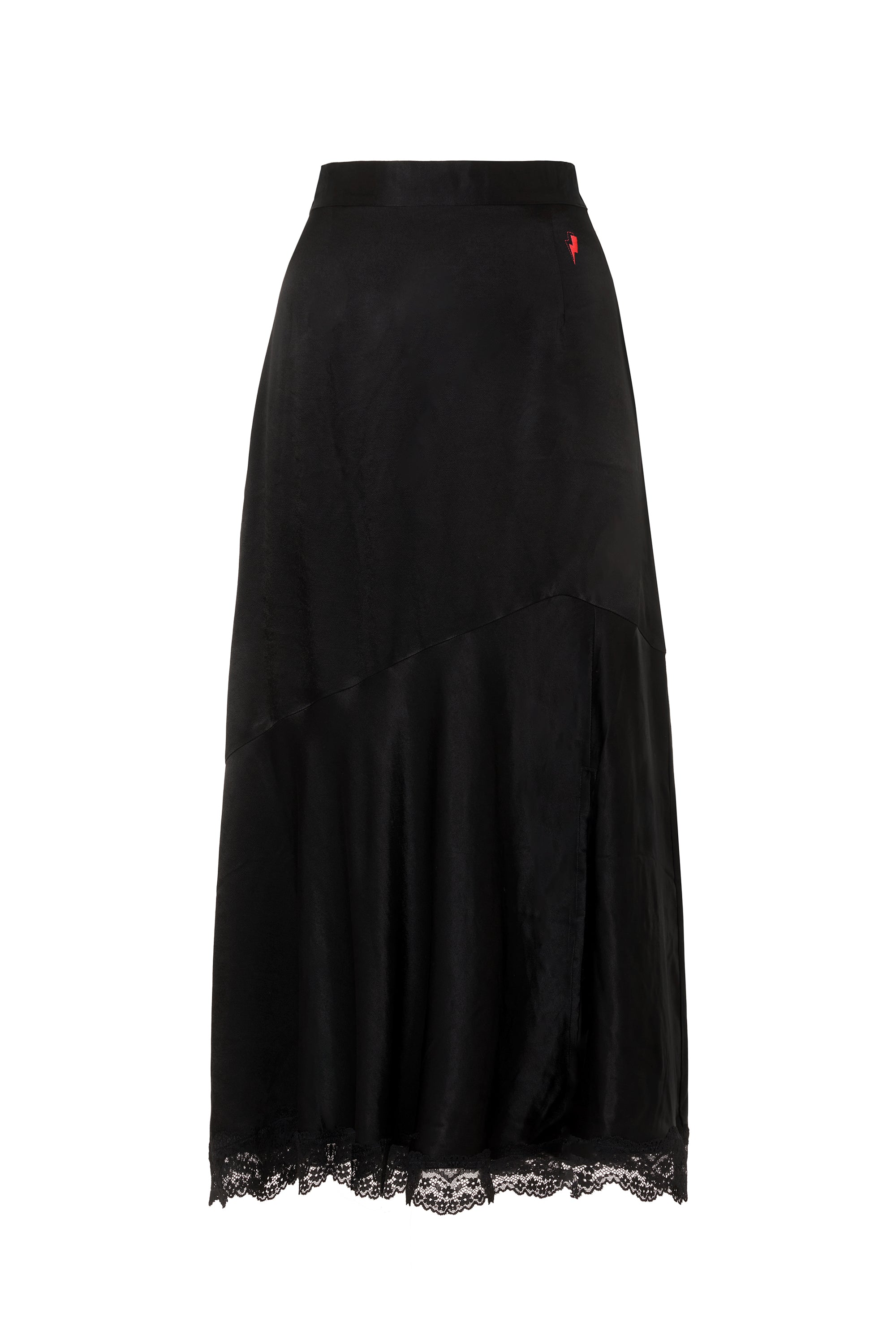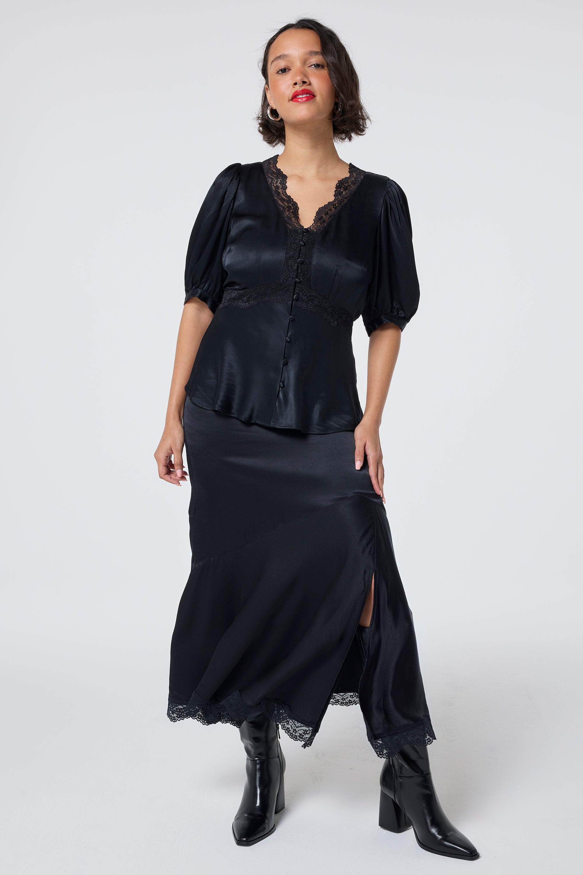 Our black lace trim satin slip midi skirt is the perfect statement maker. Designed with an elasticated waist at the back for comfort, wear yours with a chunky knit and boots for the day or heels for the night.