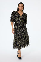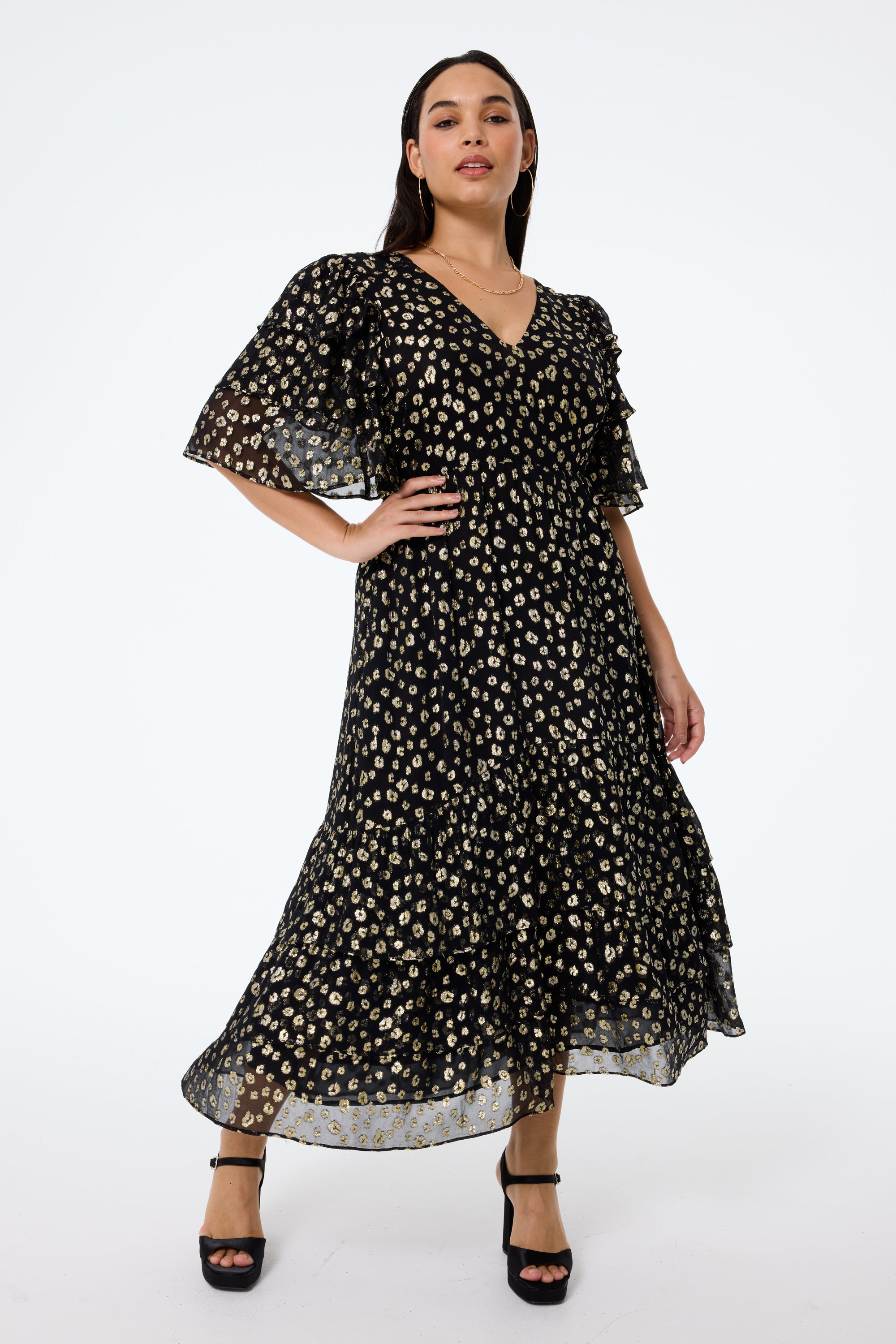 Team our black with gold spot leopard midi dress with a cross body bag and heels for an effortless occasionwear look. This gorgeous ruffle sleeve tiered dress will catch everyone's eye.