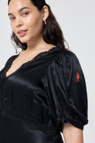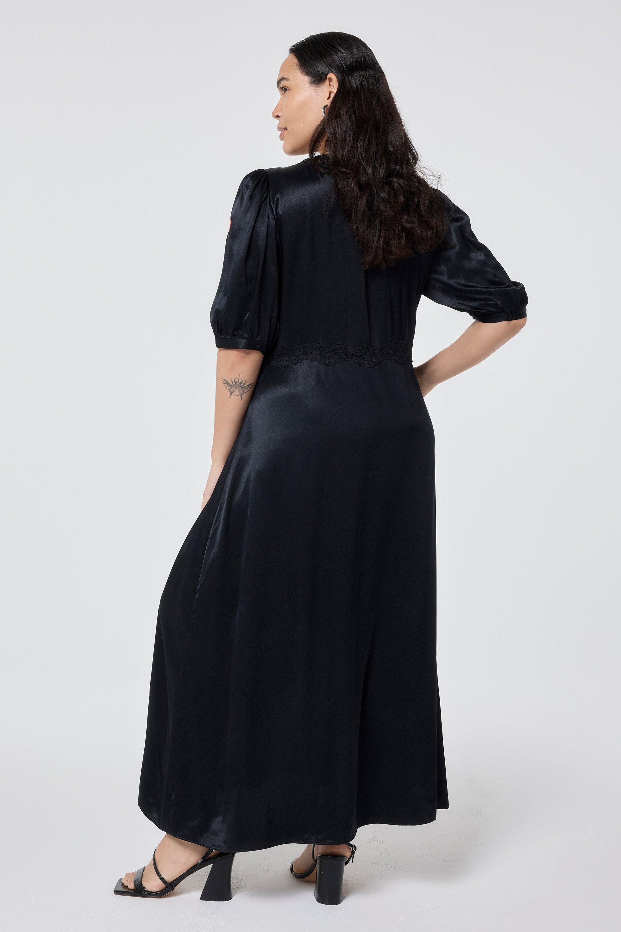 Bold and beautiful, this black with lace trim satin dress will make a joyful addition to your wardrobe. Featuring a universally flattering v-neck, short puff sleeves and classic midi length, style yours with trainers for the day and heeled boots for evening plans.