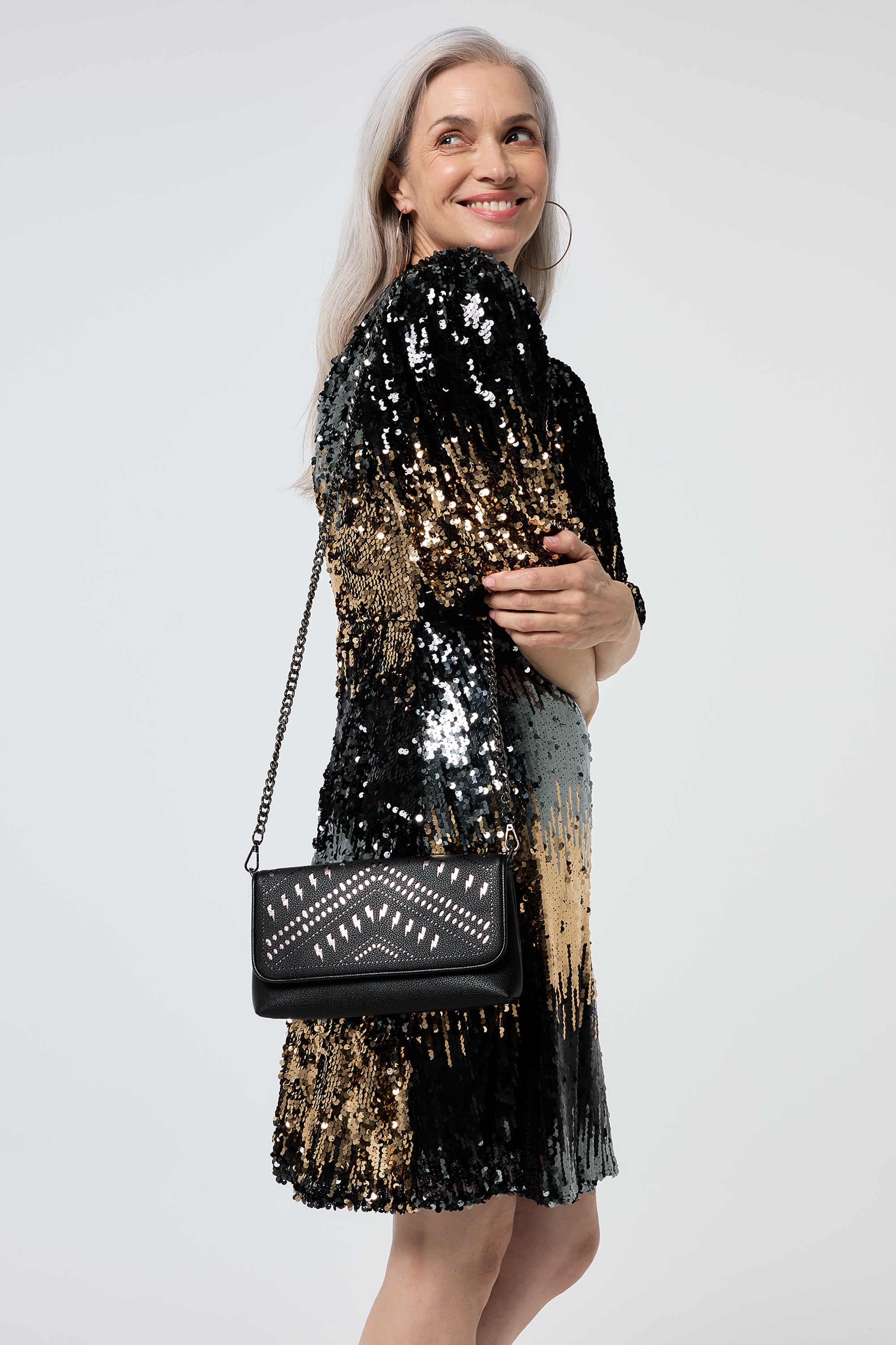 Secure, stylish and easy to wear. This black with pewter lightning bolt bag will complement your everyday wardrobe with ease. Ideally sized, this sleek bag is detailed with gunmetal hardware and laser cut design. Finished with an internal zipped pocket and chain cross body strap.