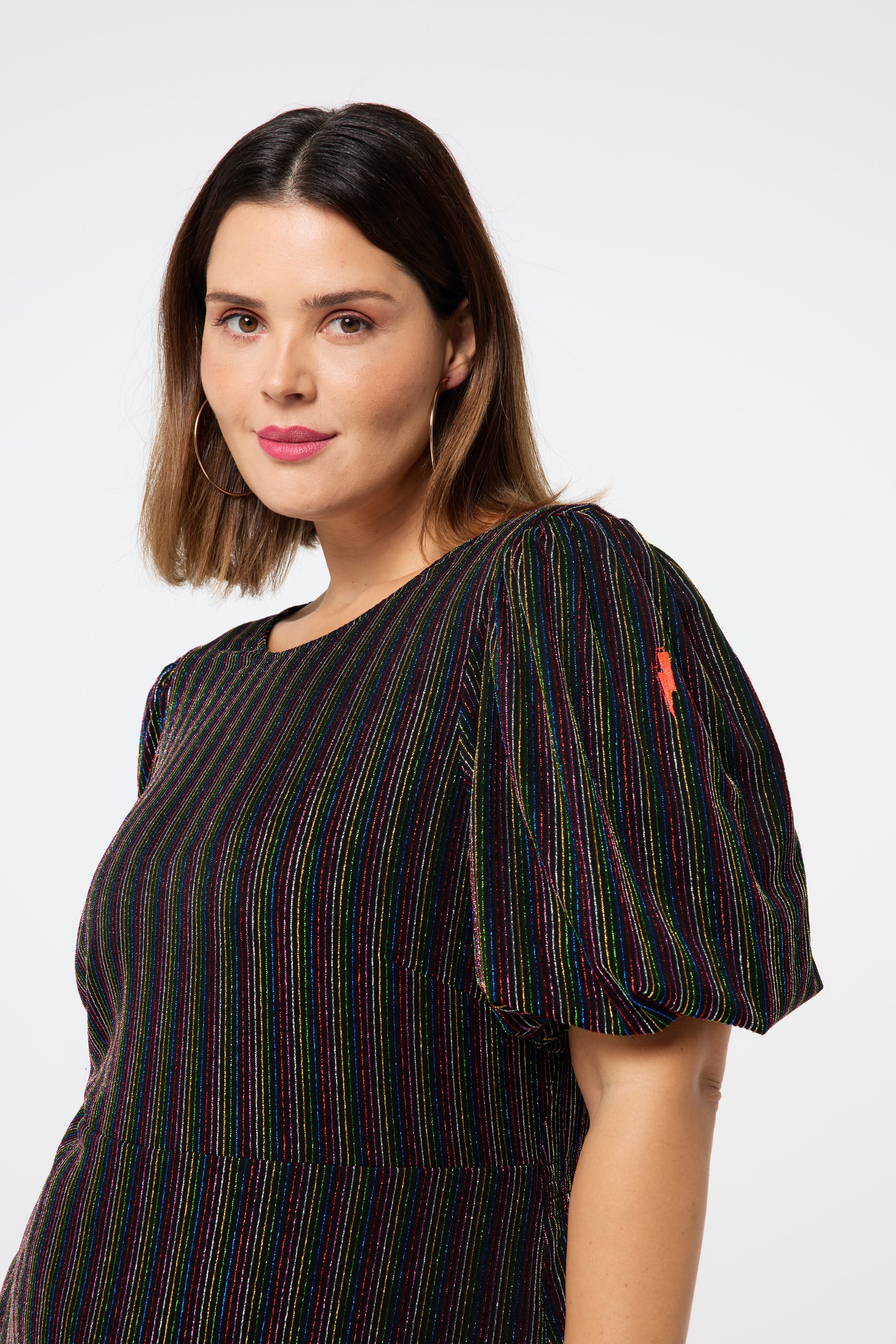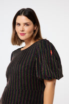 Black with Rainbow Lurex Stripe Puff Sleeve Midi Dress