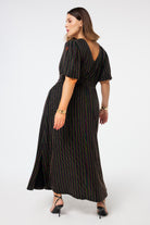 Bold and beautiful, this black with rainbow lurex stripe midi dress will make a joyful addition to your wardrobe. Lined with a soft jersey viscose fabric, the midi length dress features a universally flattering v-shaped back and short puff sleeves.
