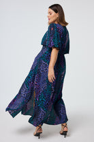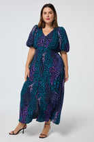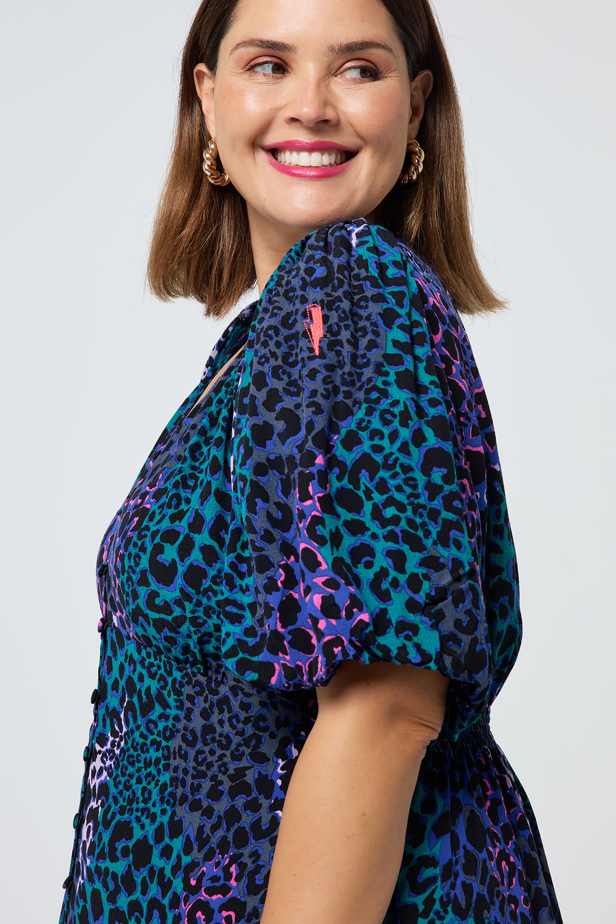 Blue with Green Spliced Leopard Puff Sleeve Midi Tea Dress