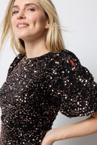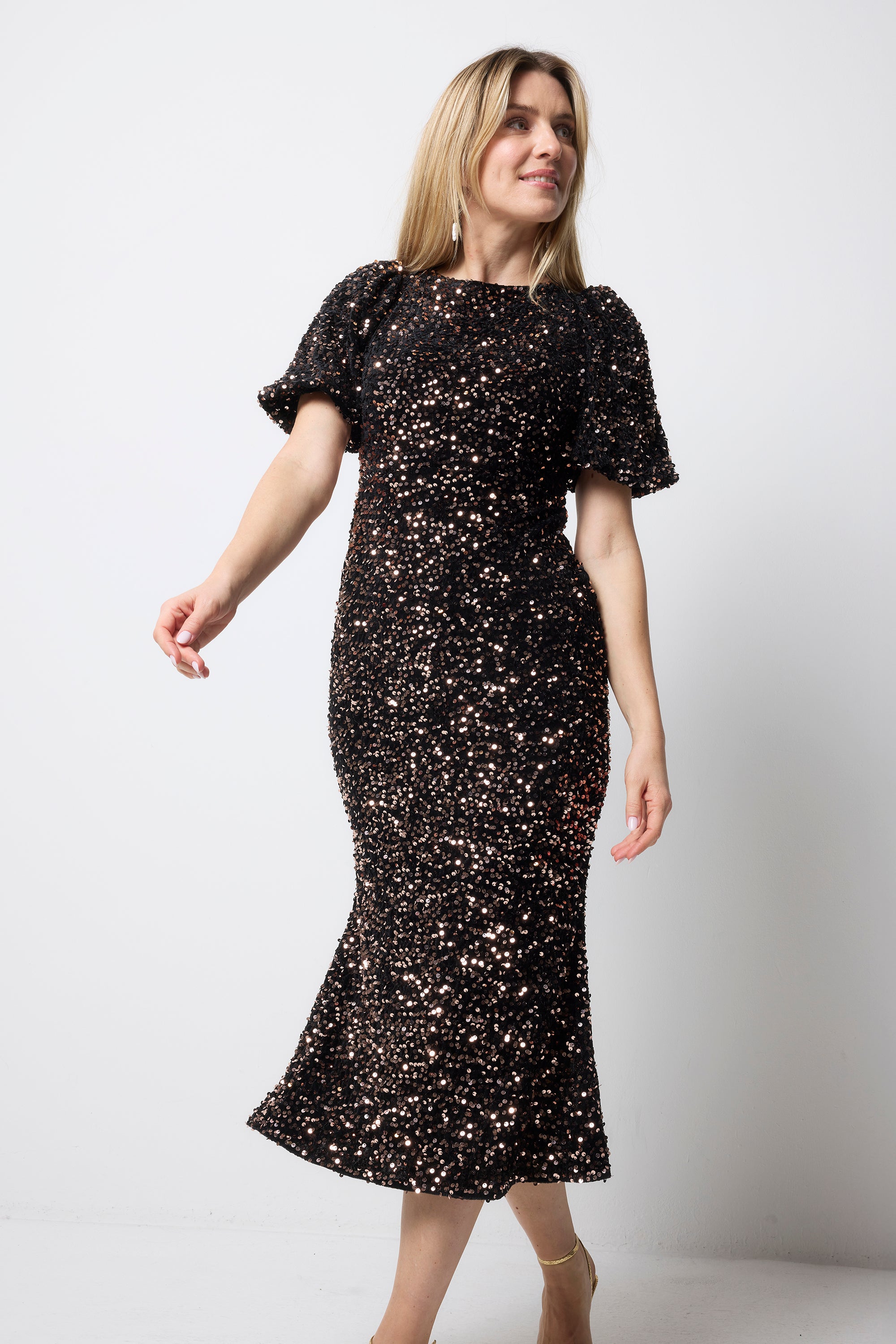 Shine bright in our sparkling bronze sequin puff sleeve midi dress. Made with a stretch velvet fabric for comfortable wear and elegantly embellished with sparkling sequins to steal the show. Teamed with heels and a statement bag, this sequin midi dress is a gorgeous choice for a festive party or formal event.