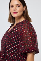 Red with Black and Gold Foil Chiffon Tiered Maxi Dress