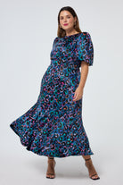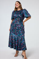 Bold and beautiful, this teal with rainbow shadow leopard and lightning bolt midi dress will make a joyful addition to your wardrobe. Made in a soft satin fabric, the midi length dress features a peplum hem skirt and short puff sleeves.