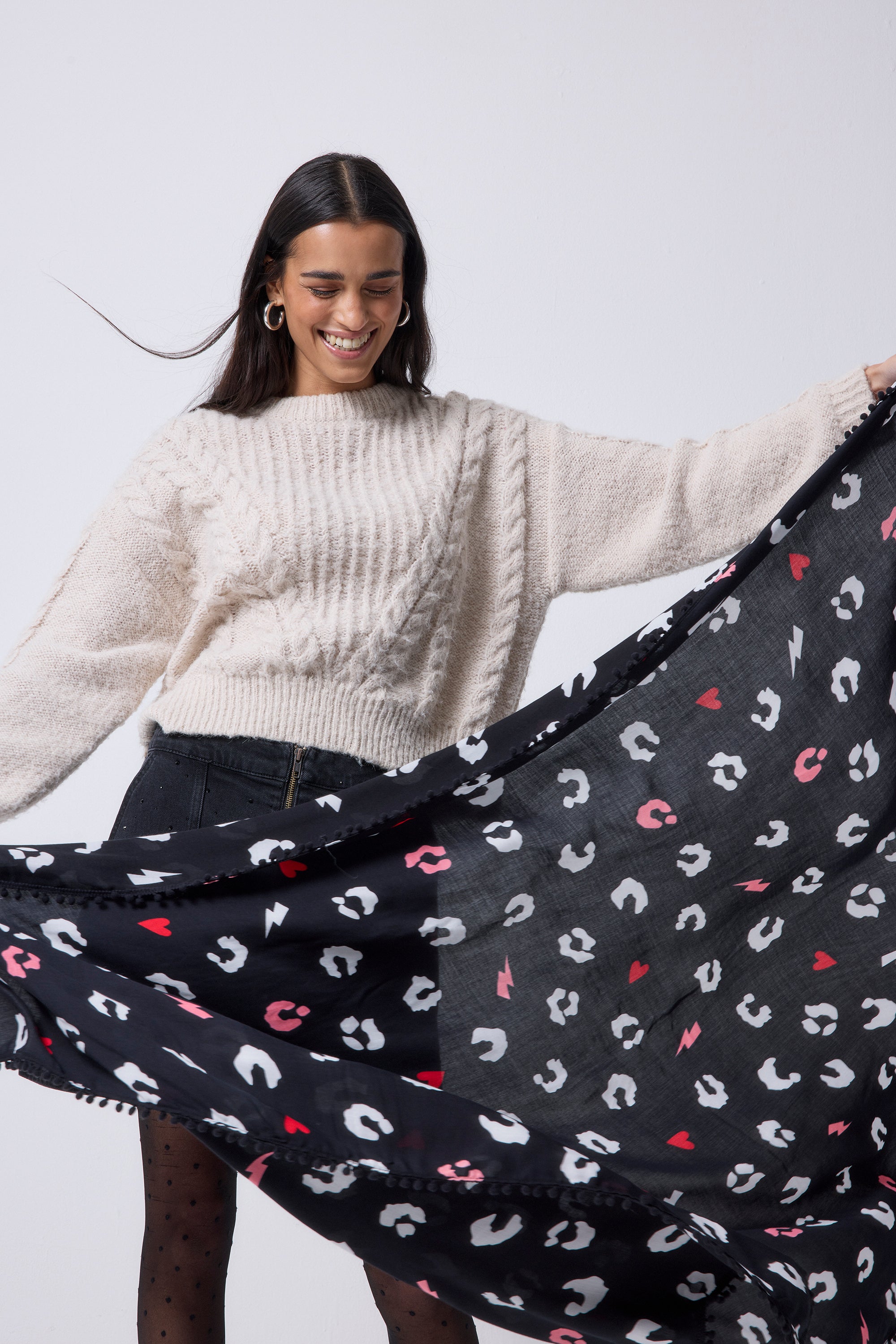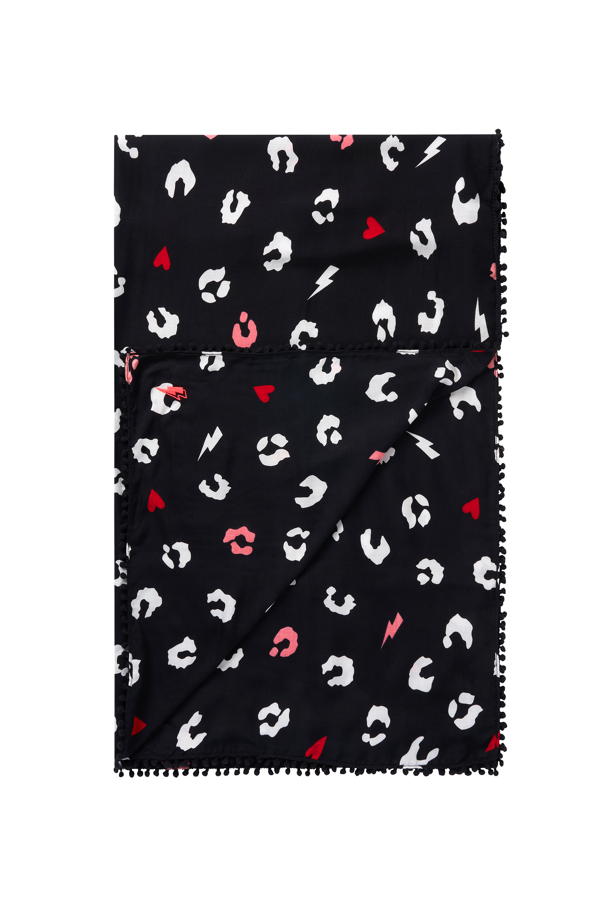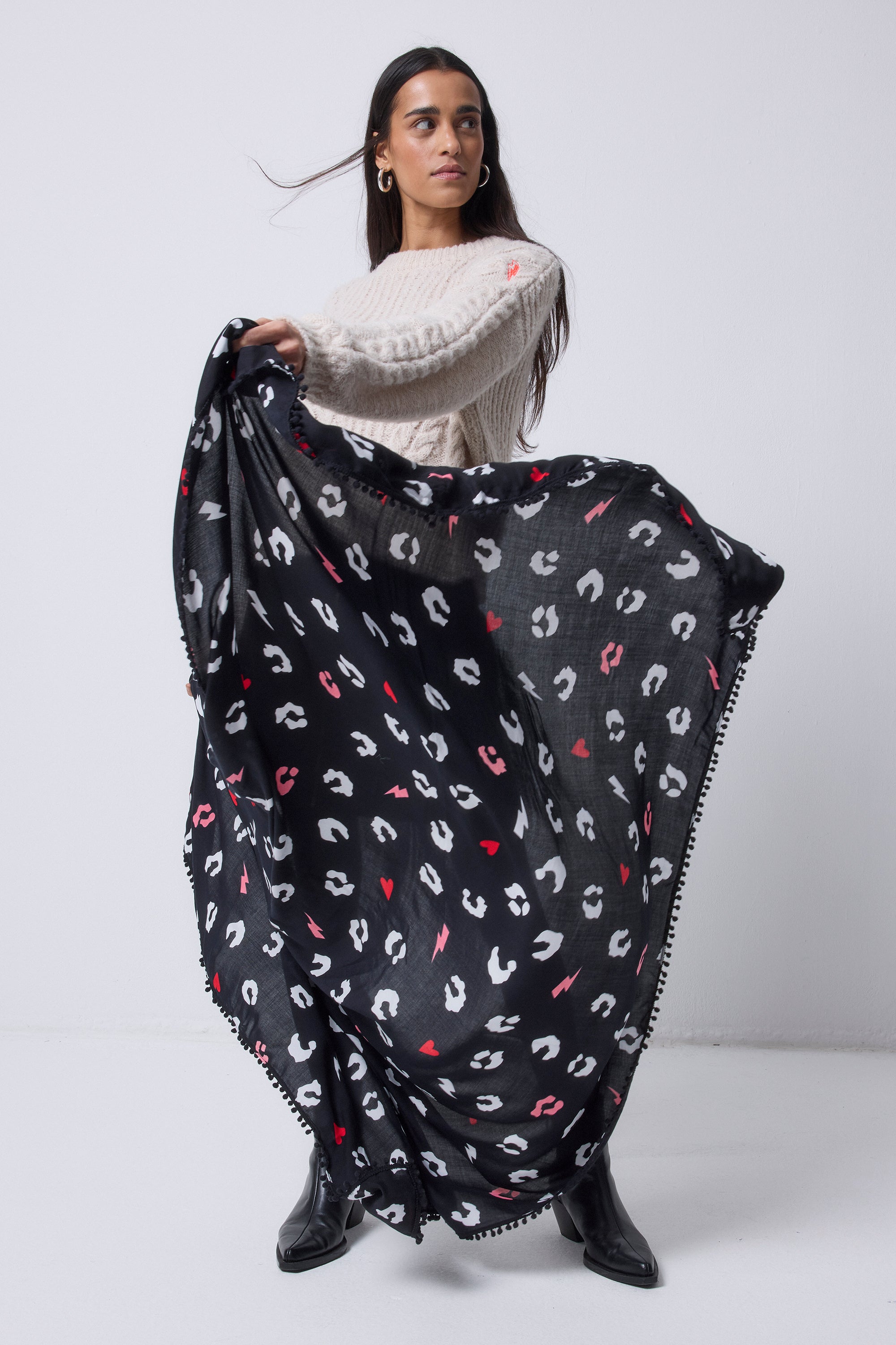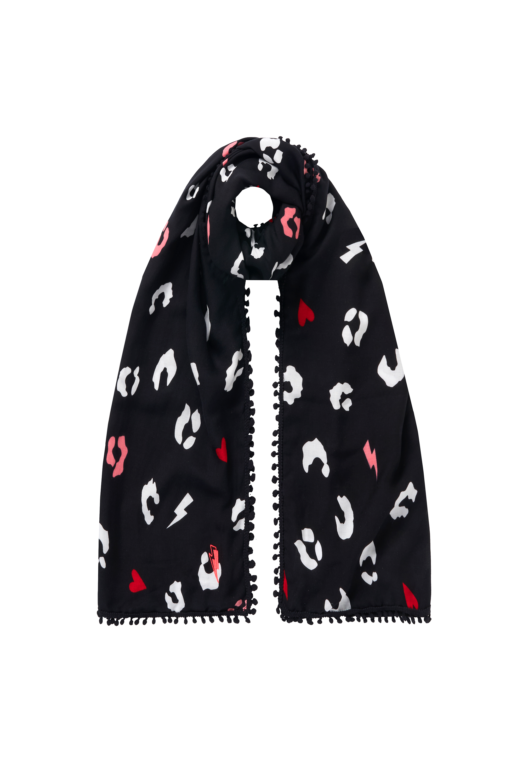 A super-soft, superpower-infused scarf in our black with white love leopard and lightning bolt print. Featuring a black pom pom trim and neon pink embroidered lightning bolt.