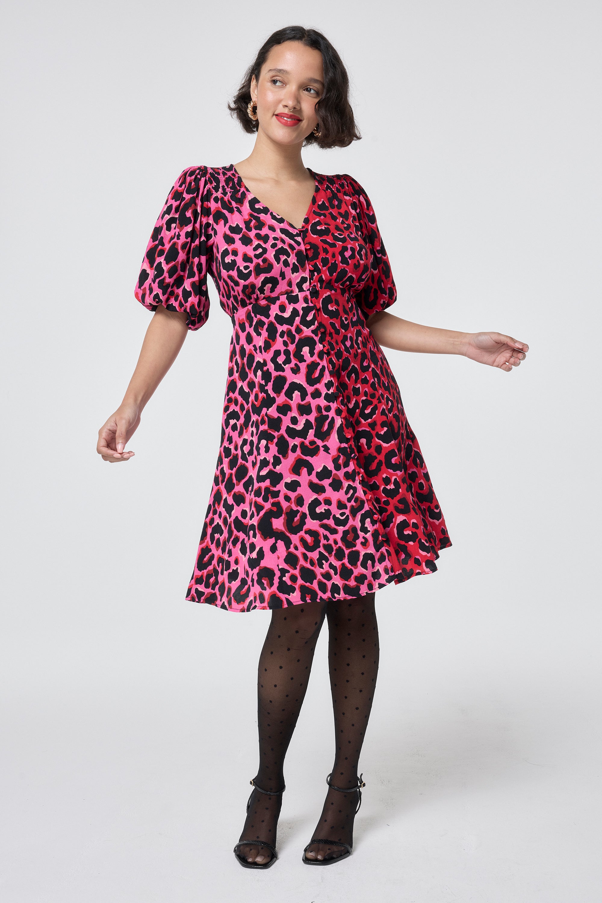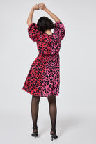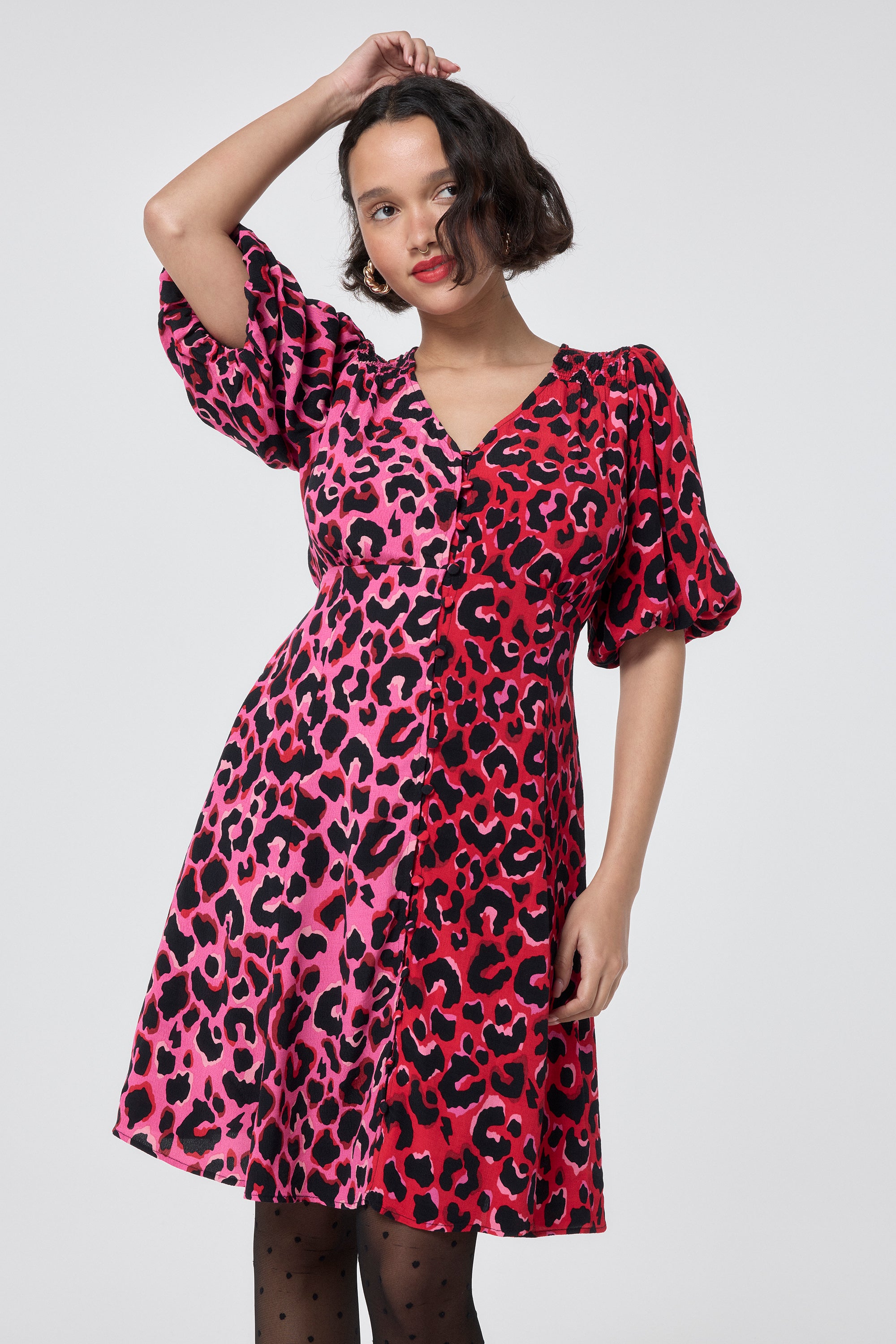 Red with Pink and Black Mix and Match Pop Leopard Puff Sleeve Short Tea Dress