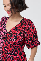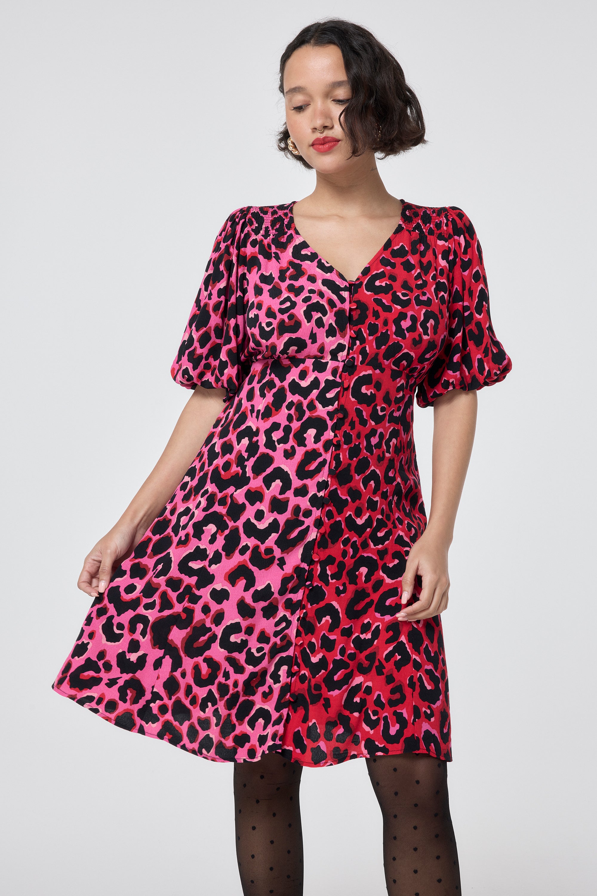 Feel confident in our red with pink and black mix and match leopard and lightning bolt tea dress. Featuring a timeless v-neck, short puff sleeves and cut to a mini length, style yours for the day with trainers or evening plans with heels.