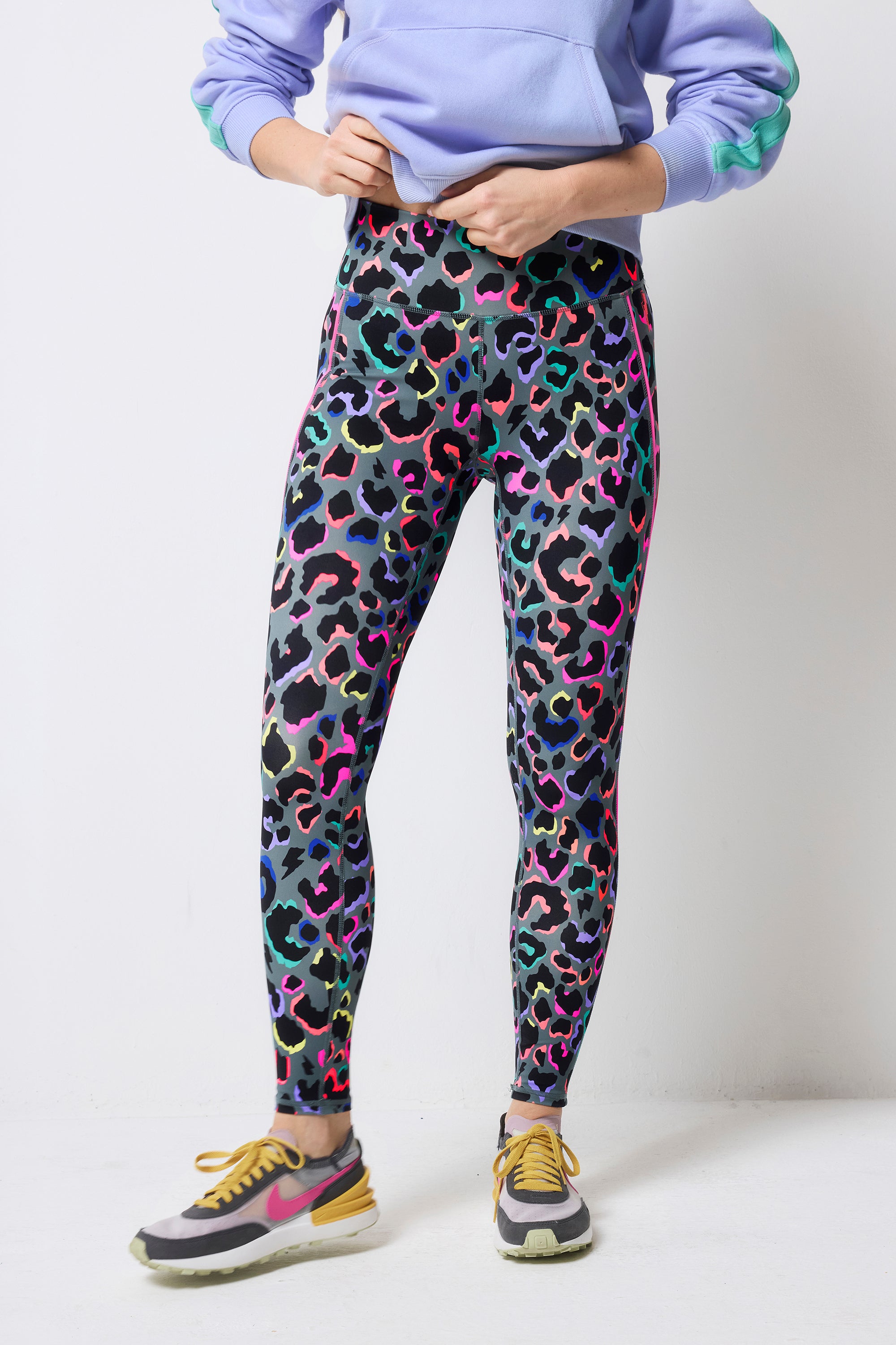 Go from studio to street in prints that perform. Our dark khaki with rainbow shadow leopard and lightning bolt print gym leggings are designed with sculpting four-way stretch fabric and a flattering high-rise waistband. Crafted to cinch and lift in all the right places, these leggings are set to be the show-stopping heroes of your activewear wardrobe.
