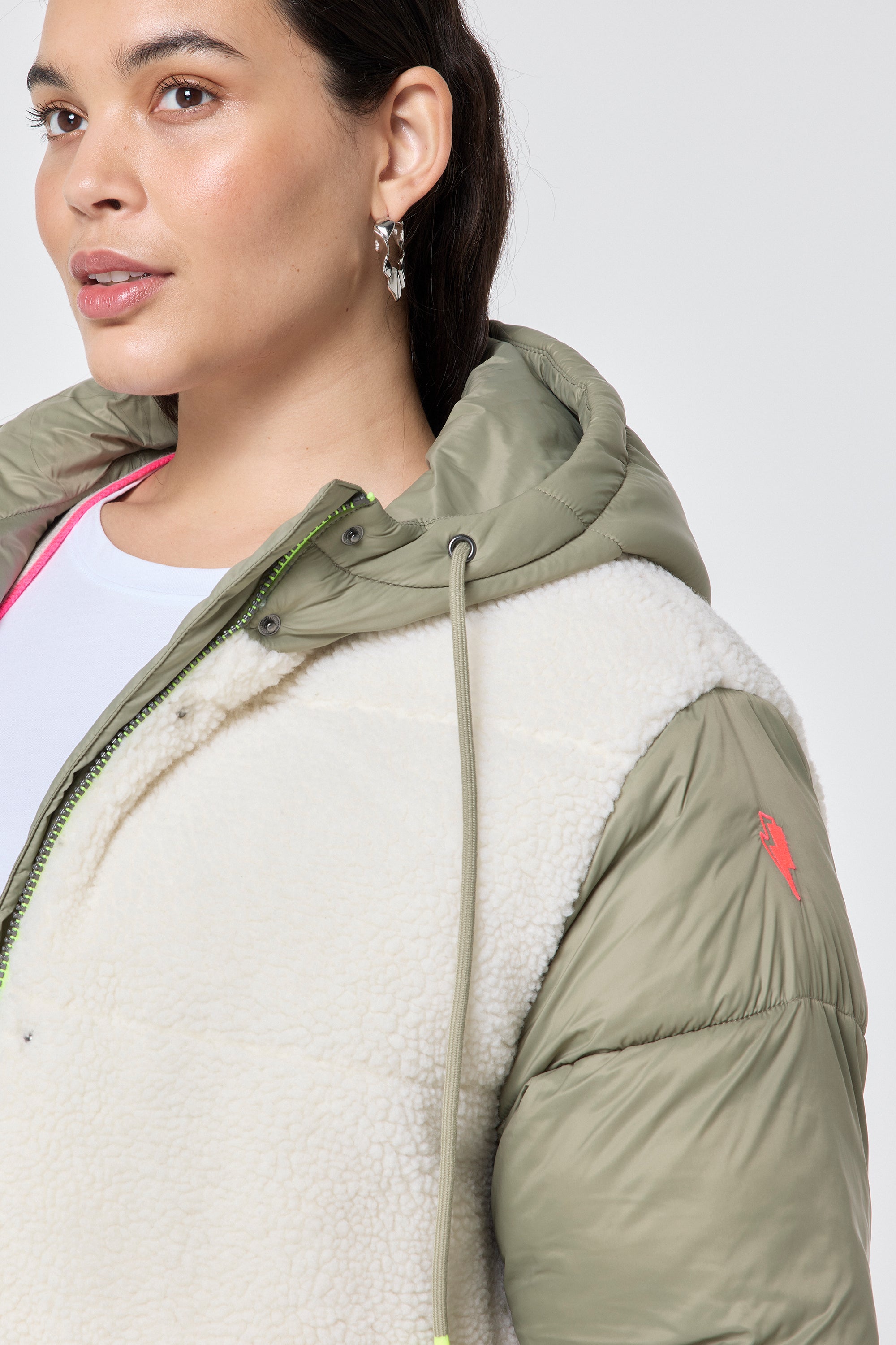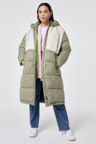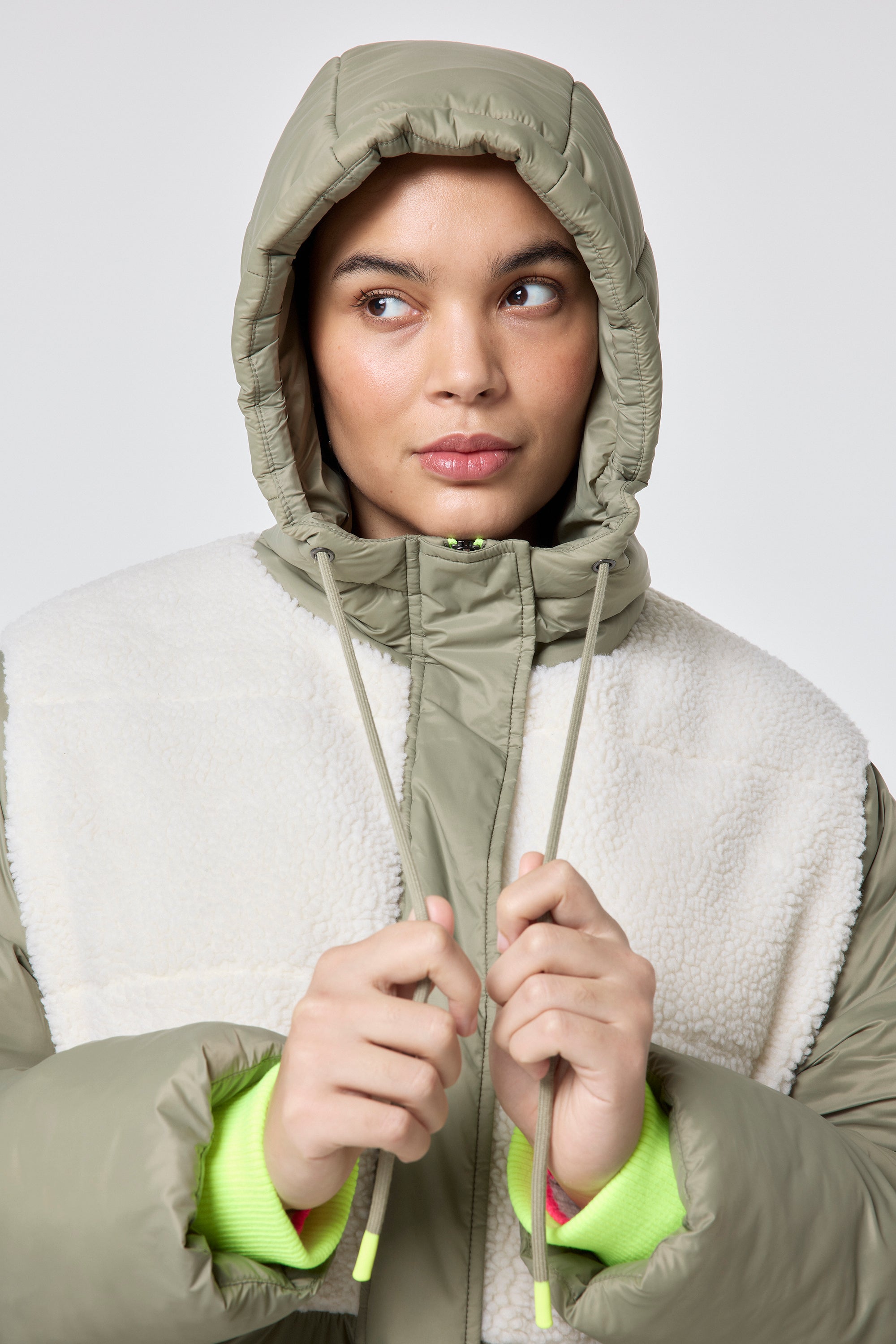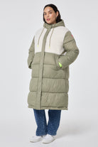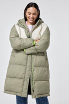 Take cover and cosy up in this khaki quilted longline puffer coat, your Autumn/Winter wardrobe staple. Adorned with borg detail, the long length style can be layered over your loungewear, jumpers and jeans or dresses to keep you warm and stylish all day long.