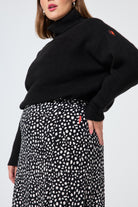Our black with white cheetah and lightning bolt print side split skirt is a statement making pick that can be amped up for special occasions or pared back with a t-shirt and trainers. It's designed with an elasticated waist on the back for easy comfort.