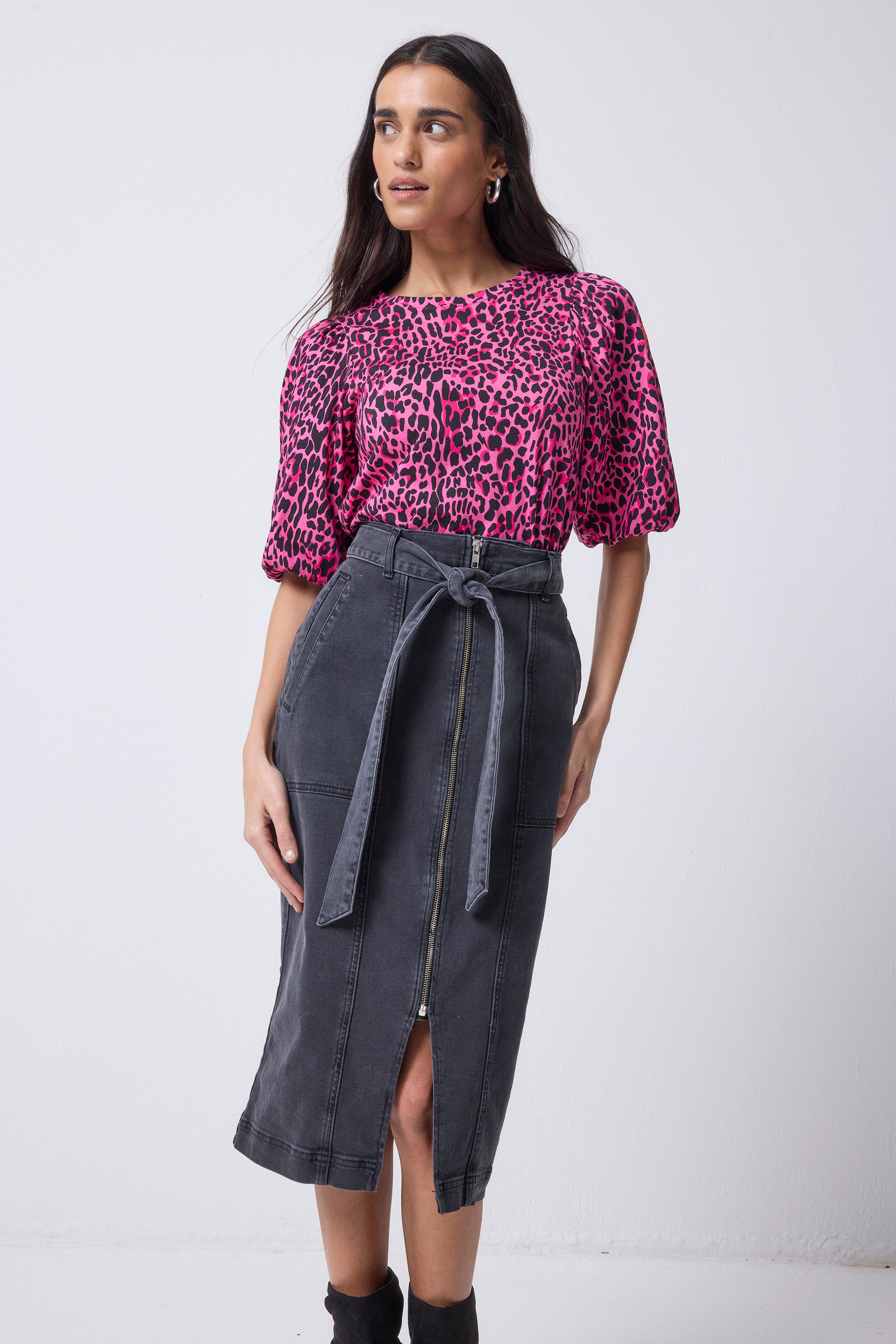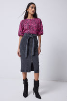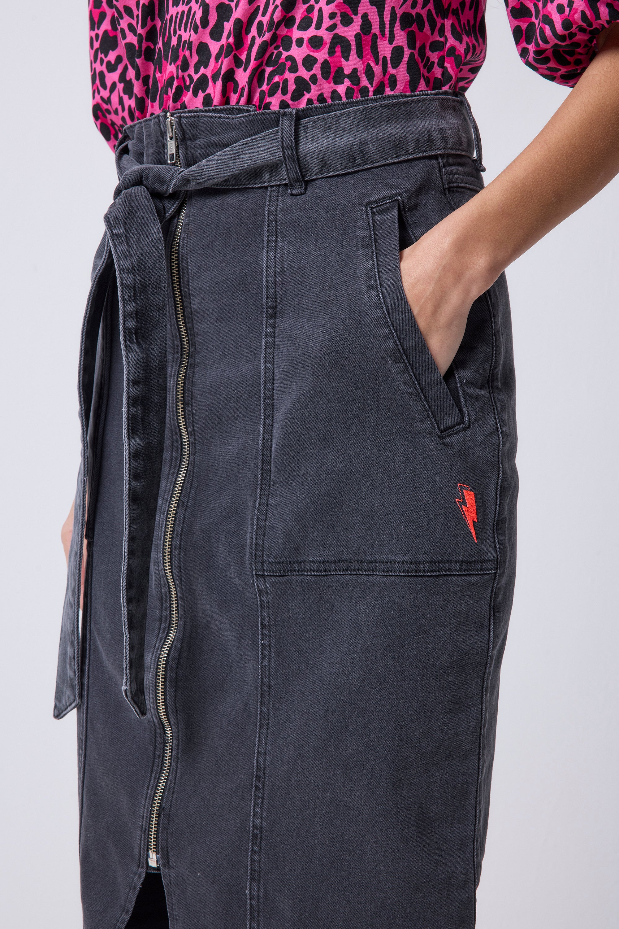 This washed black denim zip detail denim midi skirt is the hero piece of the season - A cool alternative to jeans, with a split at the center front for a flash of leg and easy movement. It's a versatile piece which cinches you in at the waist. Pair with a tee and cardigan or knitted jumper and your favourite trainers for a laid back, stylish look.