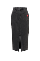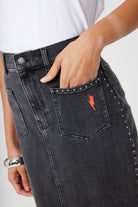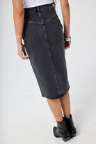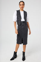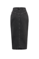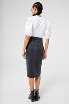 Giving your jeans the day off just got easier. This washed black denim split front midi skirt has both structure and softness making it perfect for every day. With a midi length and stud detail, you can make a statement with any day or evening outfit.