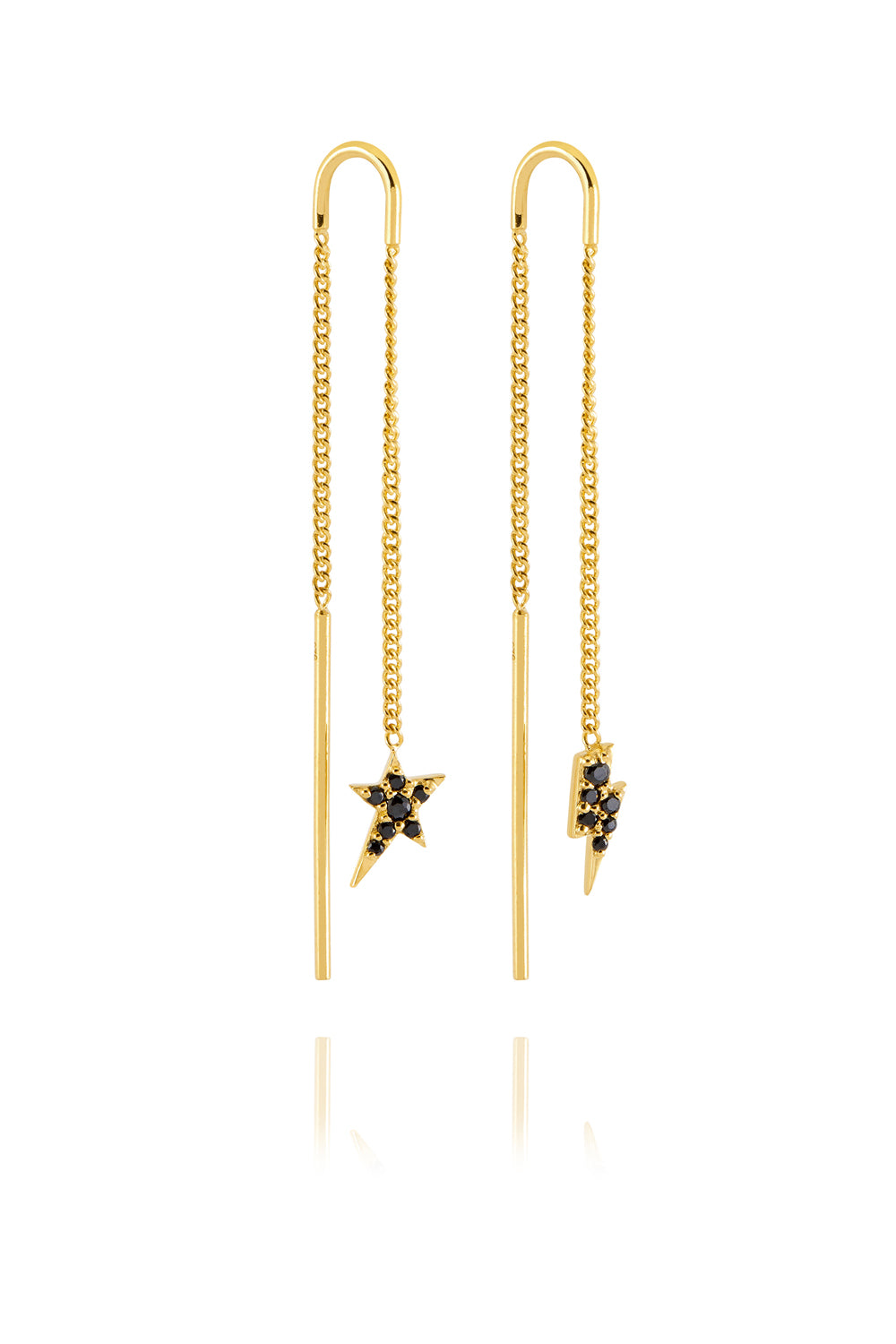 Gold Plated Lightning Bolt & Star Threader Earrings with Black Pavé Detailing