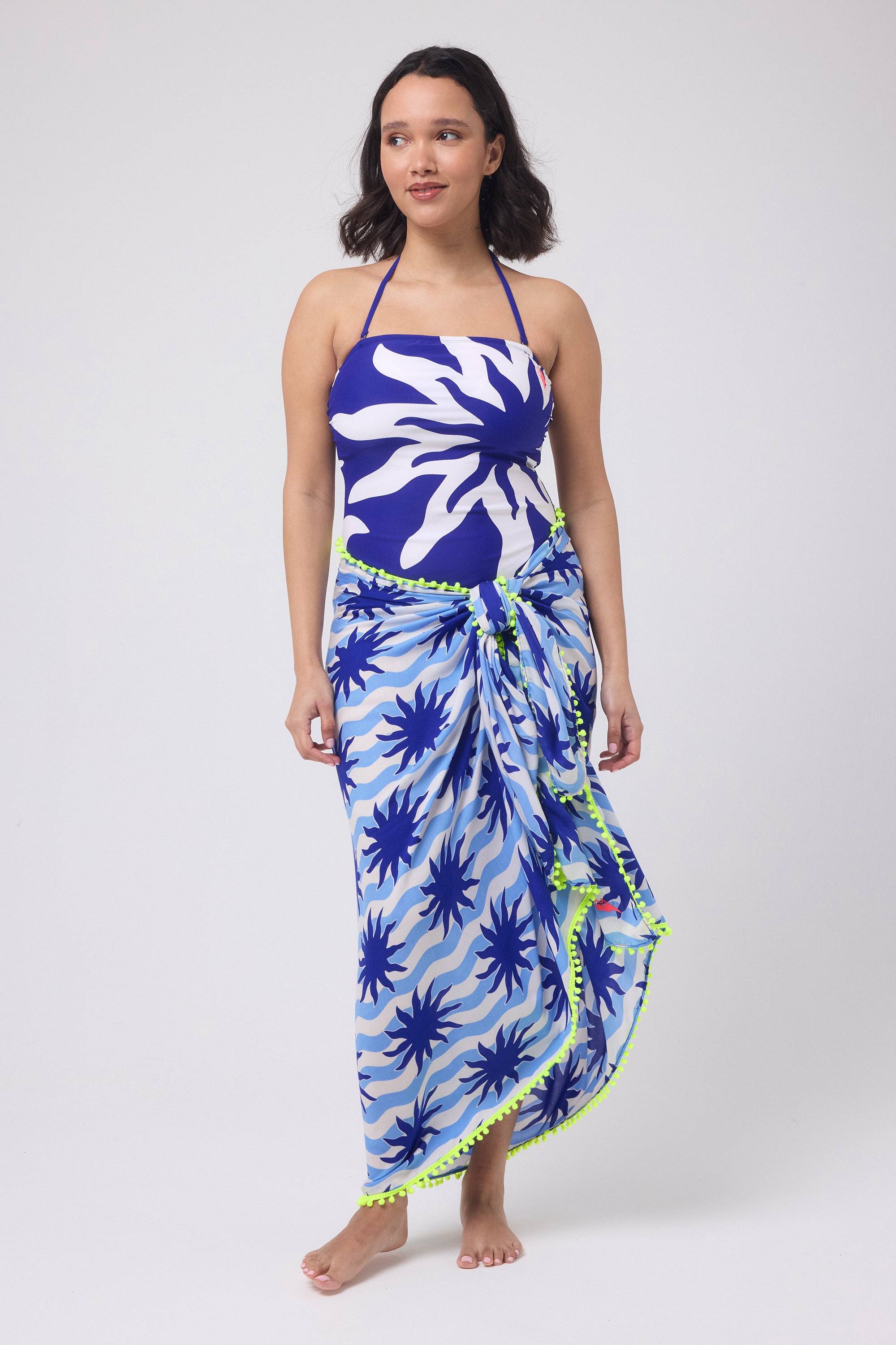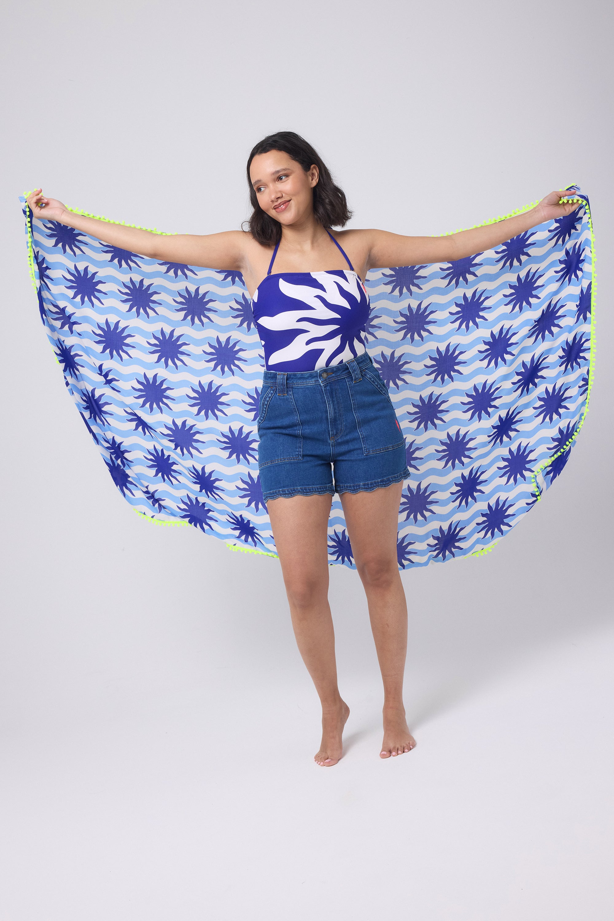 A super-soft, superpower-infused scarf in our blue sunstar print. Featuring a neon yellow pom pom trim and neon pink embroidered lightning bolt Superpower Button.