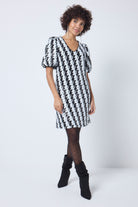 Elevate your style with our black with white lightning bolt sequin short v-neck dress, a fusion of comfort and glamour. The eye-catching dress is easy to slip on and lined with super soft viscose jersey. This isn't just a dress, it's a statement and perfect for partying day or night.