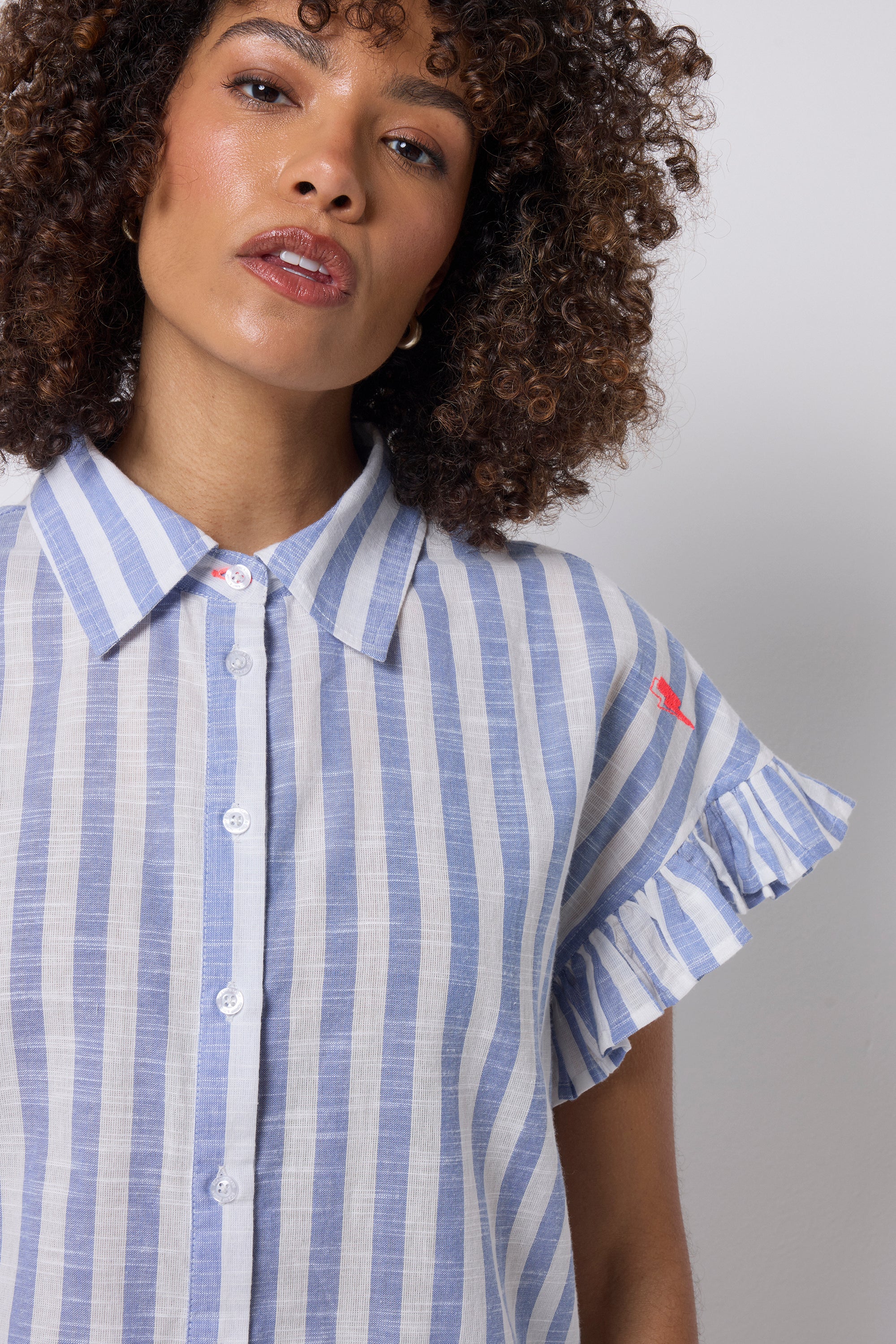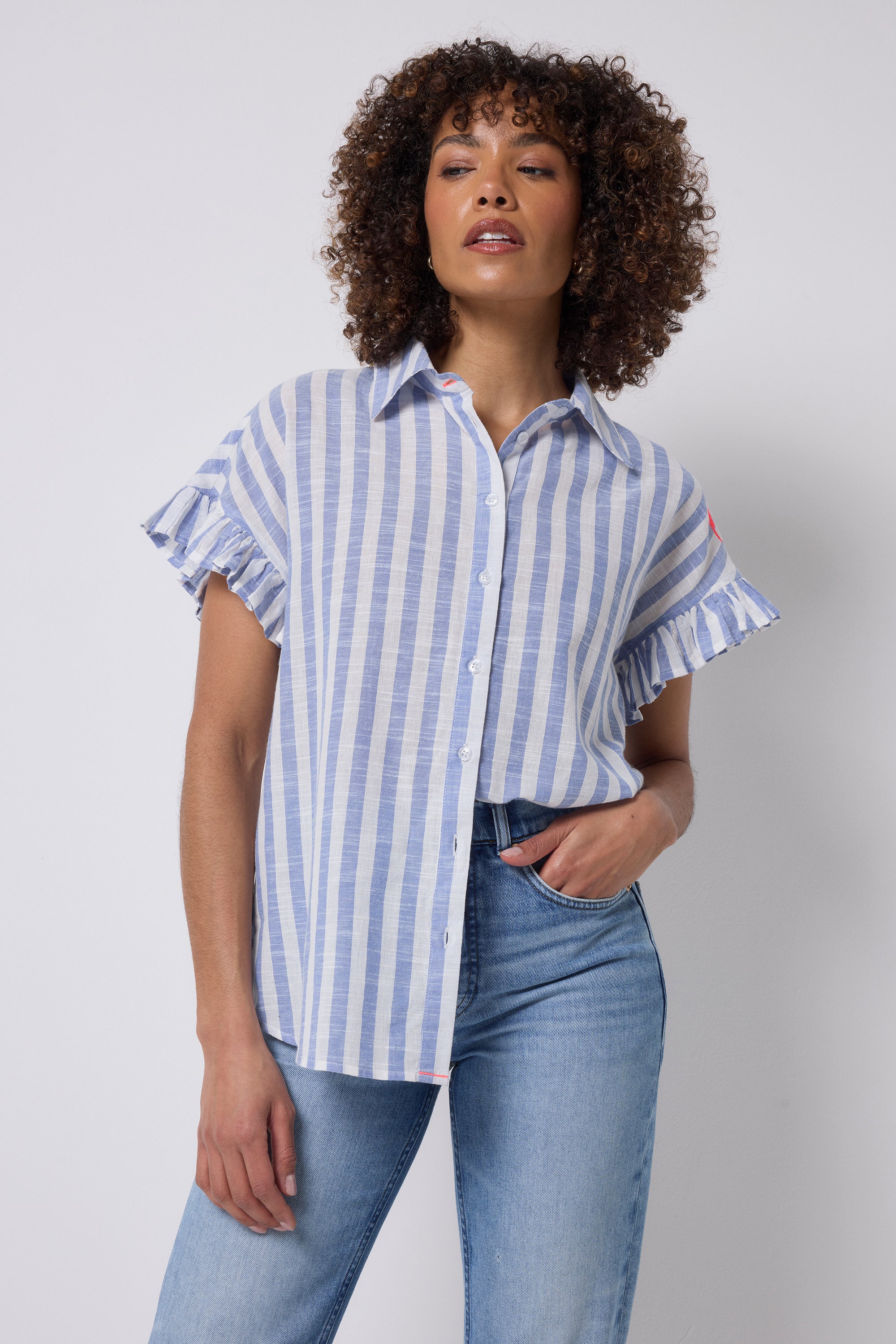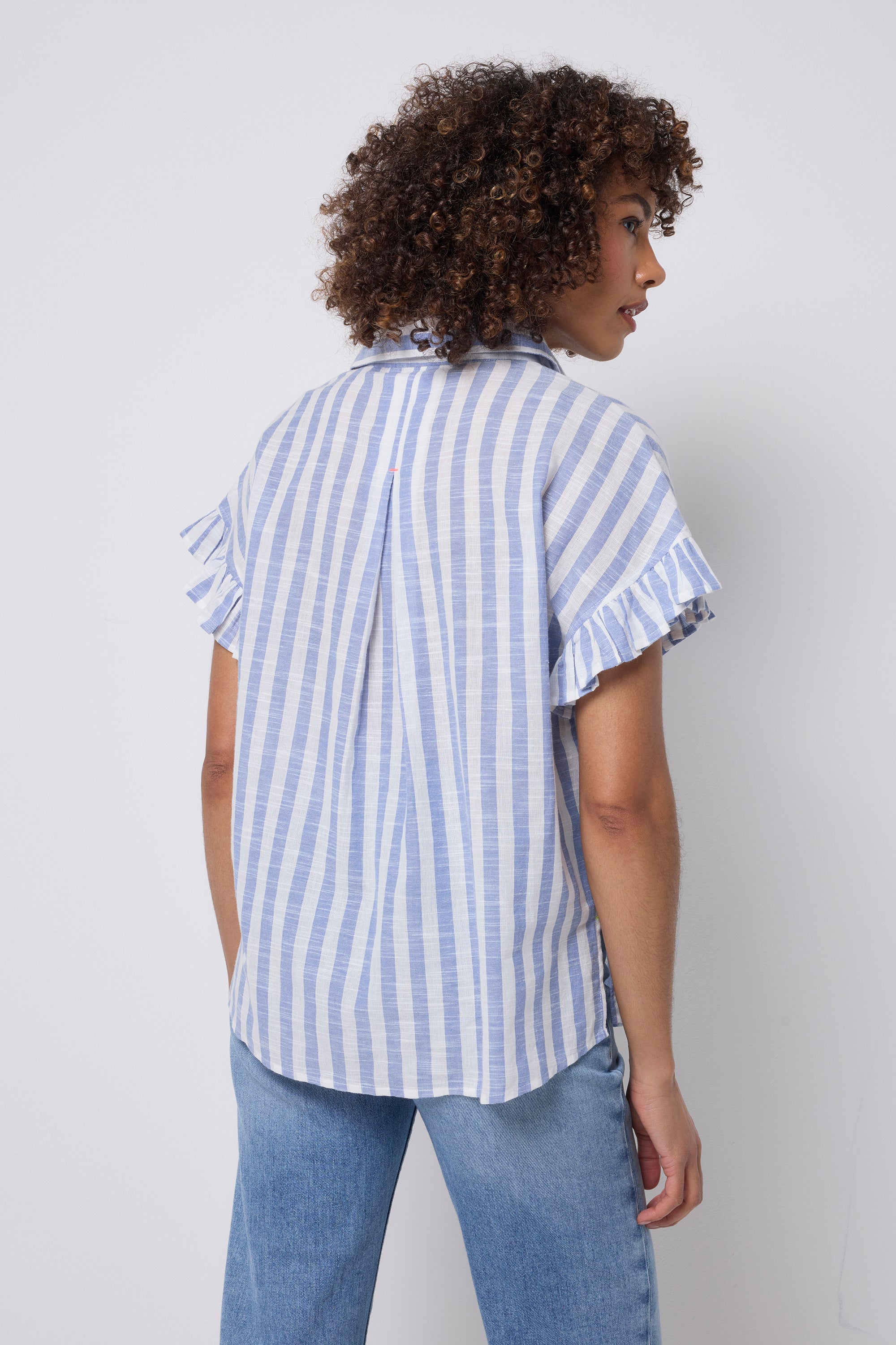 Blue and White Stripe Frill Sleeve Shirt
