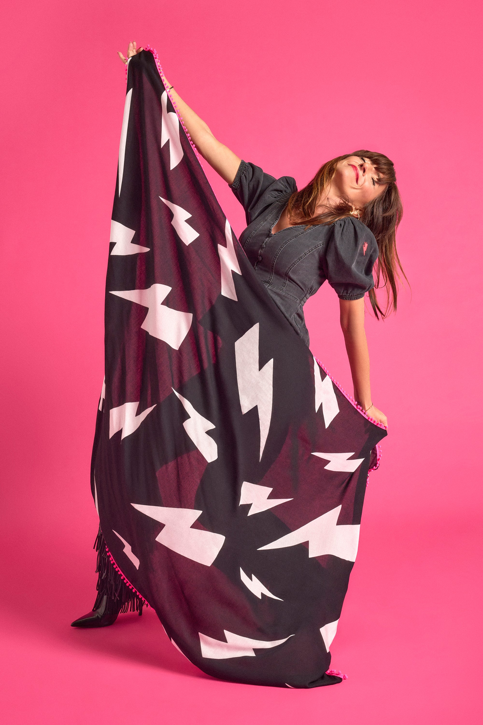 A super-soft, superpower-infused scarf in our black with white large bolt print. Featuring a neon pink pom pom trim and neon pink embroidered lightning bolt Superpower Button. Made by our founder, Jo, in collaboration with TV presenter, author and women’s health advocate Davina McCall.