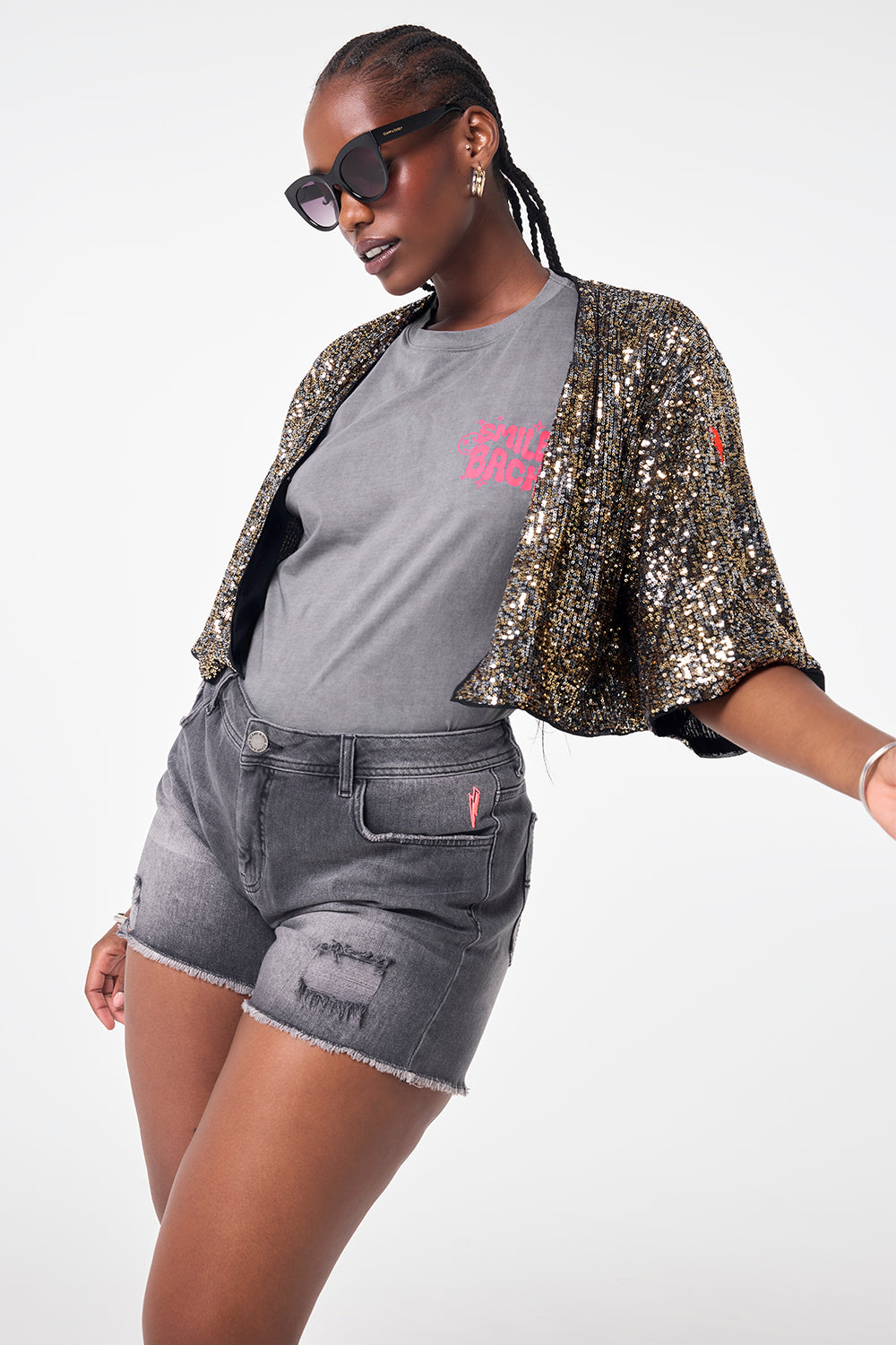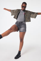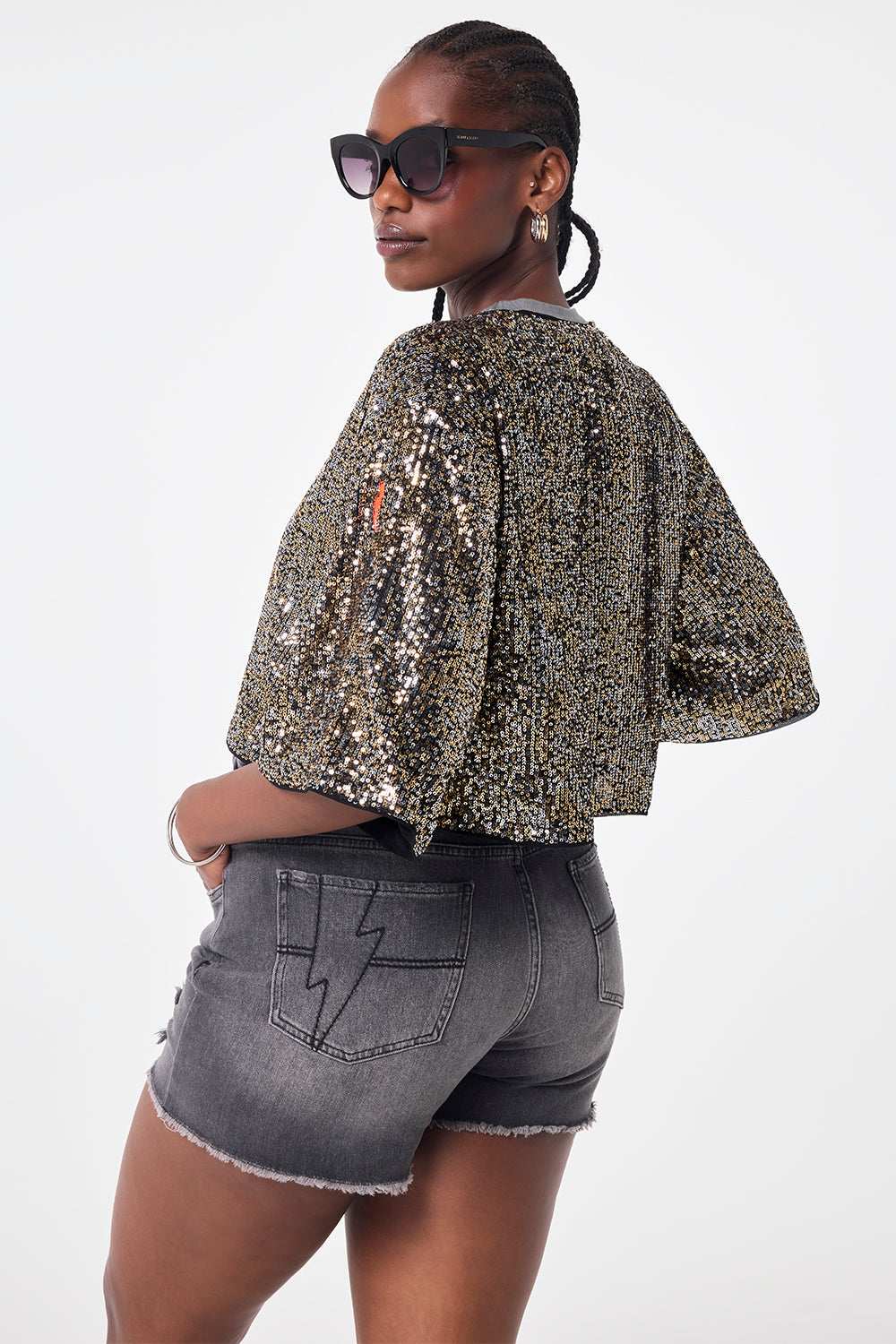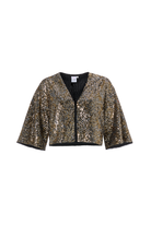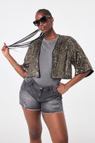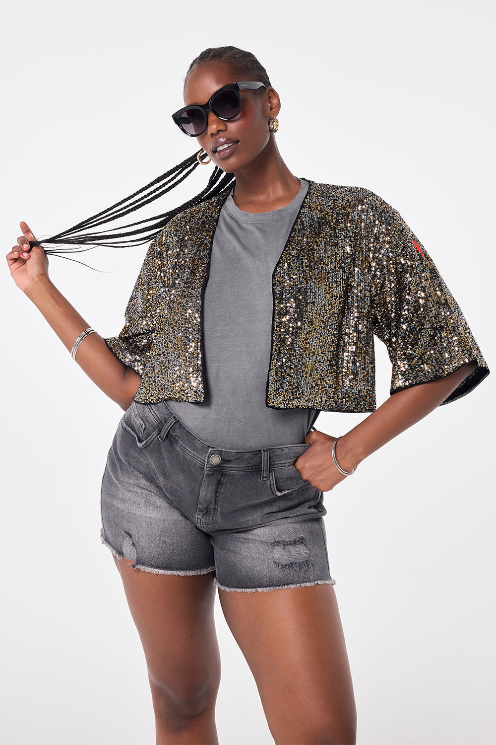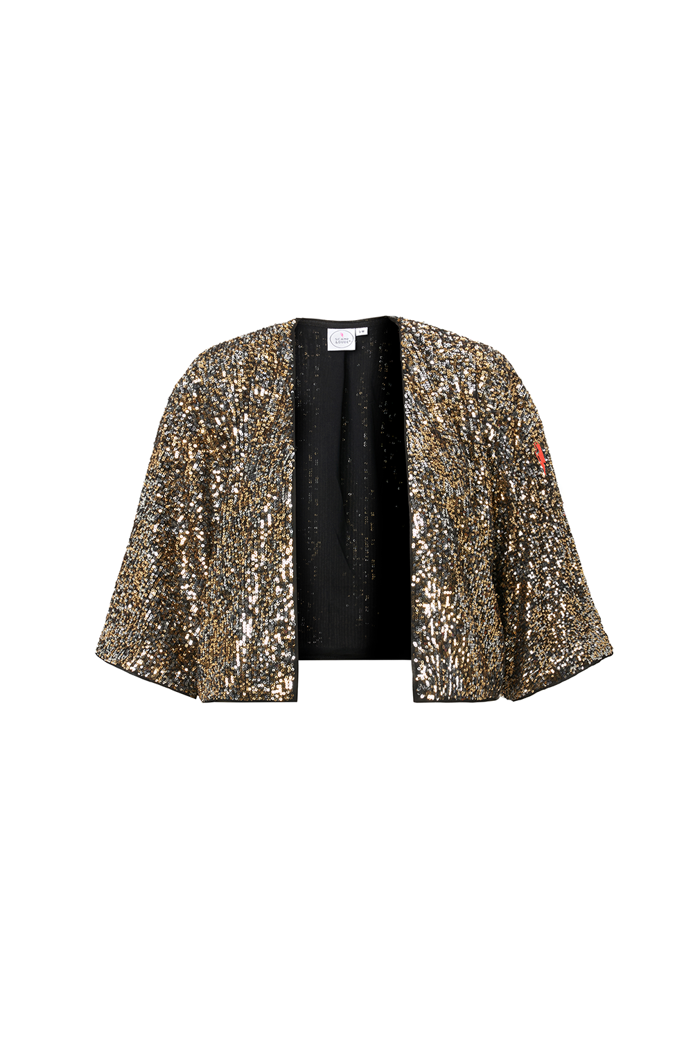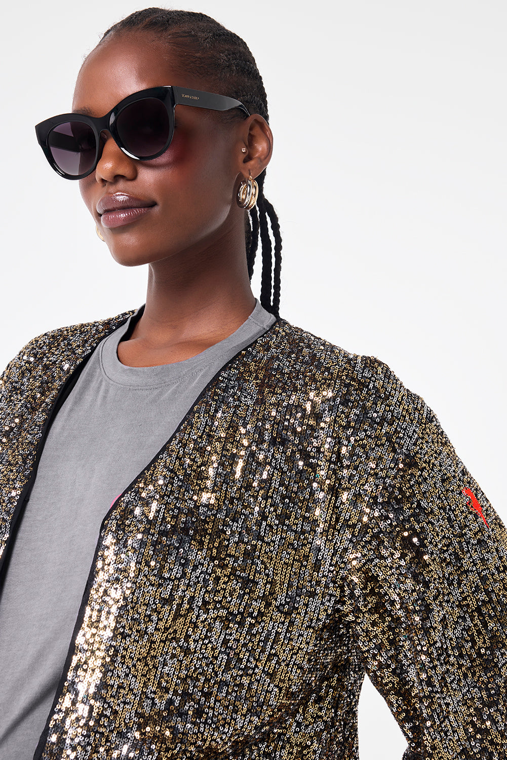 Add a luxurious layer to your outfits this season with this gold with silver sequin cropped jacket, which is a simple way to elevate your look. Designed with all-over clustered sequins to create a super sparkly finish, it's the perfect piece for styling over shorts and a top or a dress for added glitz and glam this season.