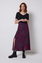 Spruce up your skirts collection with this grey with pink leopard ray and lightning bolt print split front skirt. This statement making piece can be amped up for special occasions or dressed down easily. It's designed with an elasticated waist on the back for easy comfort.
