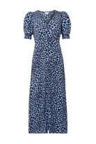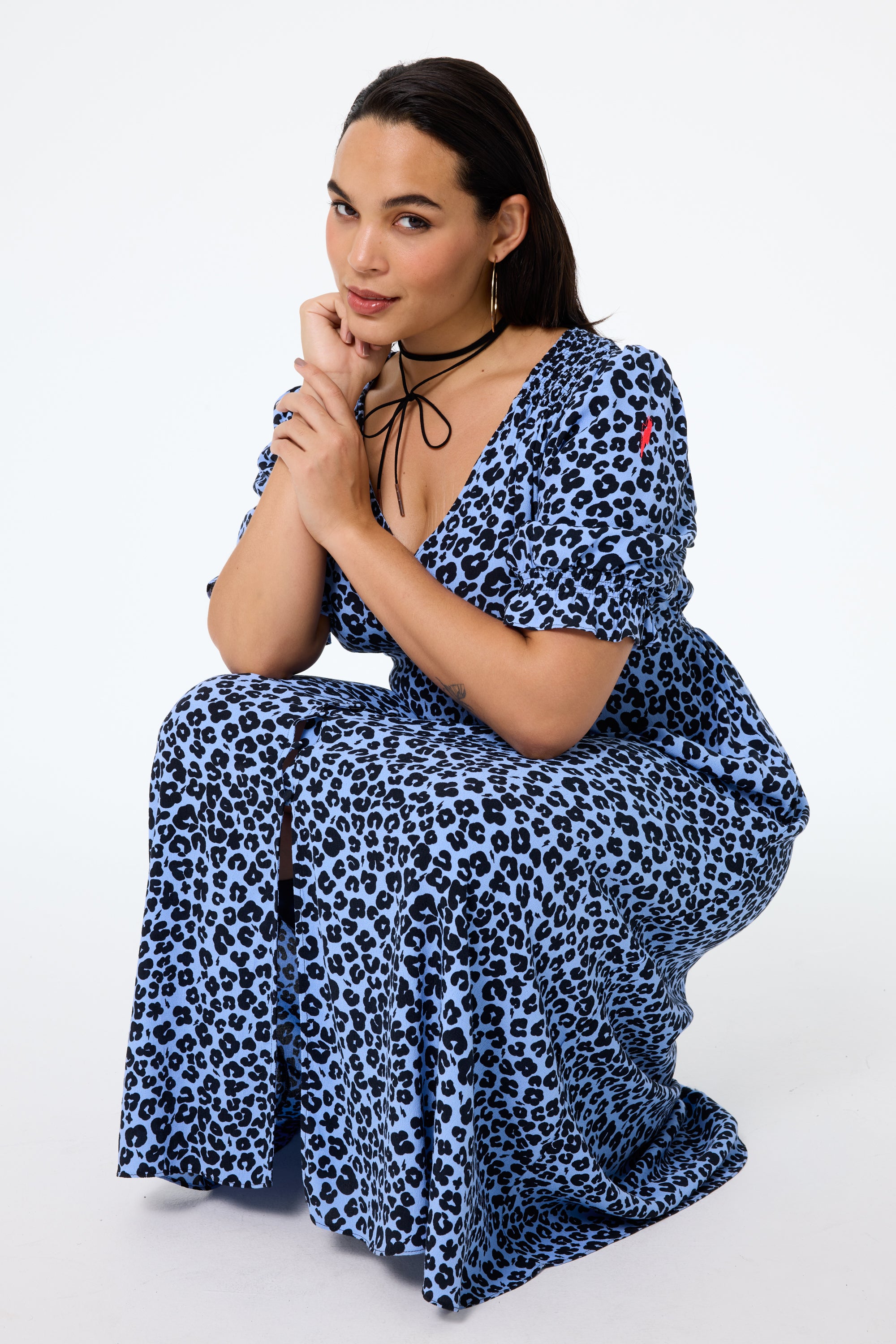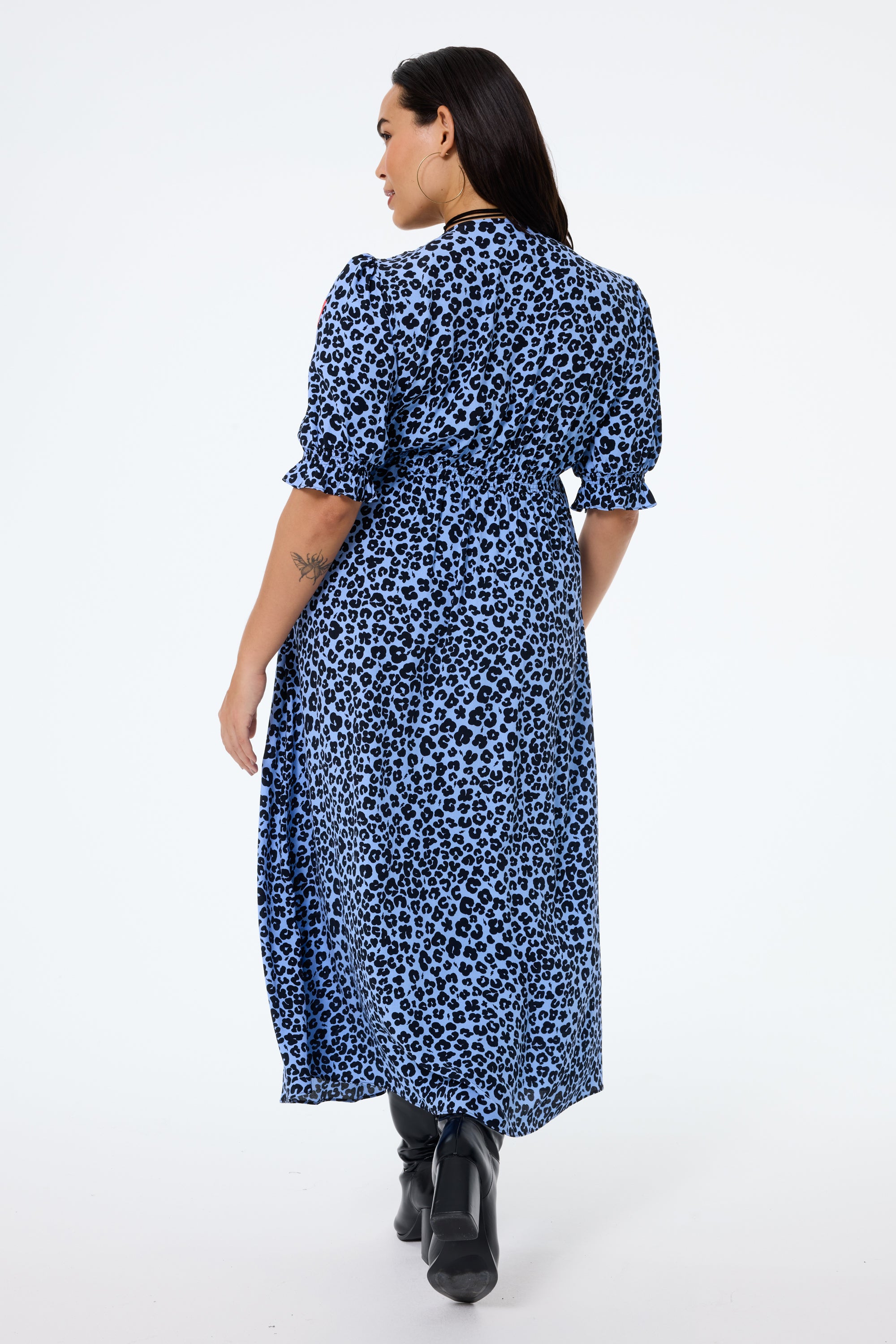 Our blue with black shadow leopard and lightning bolt flute sleeve midi tea dress will make a joyful addition to your wardrobe. Made in a soft viscose crepe fabric, the midi length dress features a universally flattering v-neckline and short blouson sleeves with frill at the cuff.