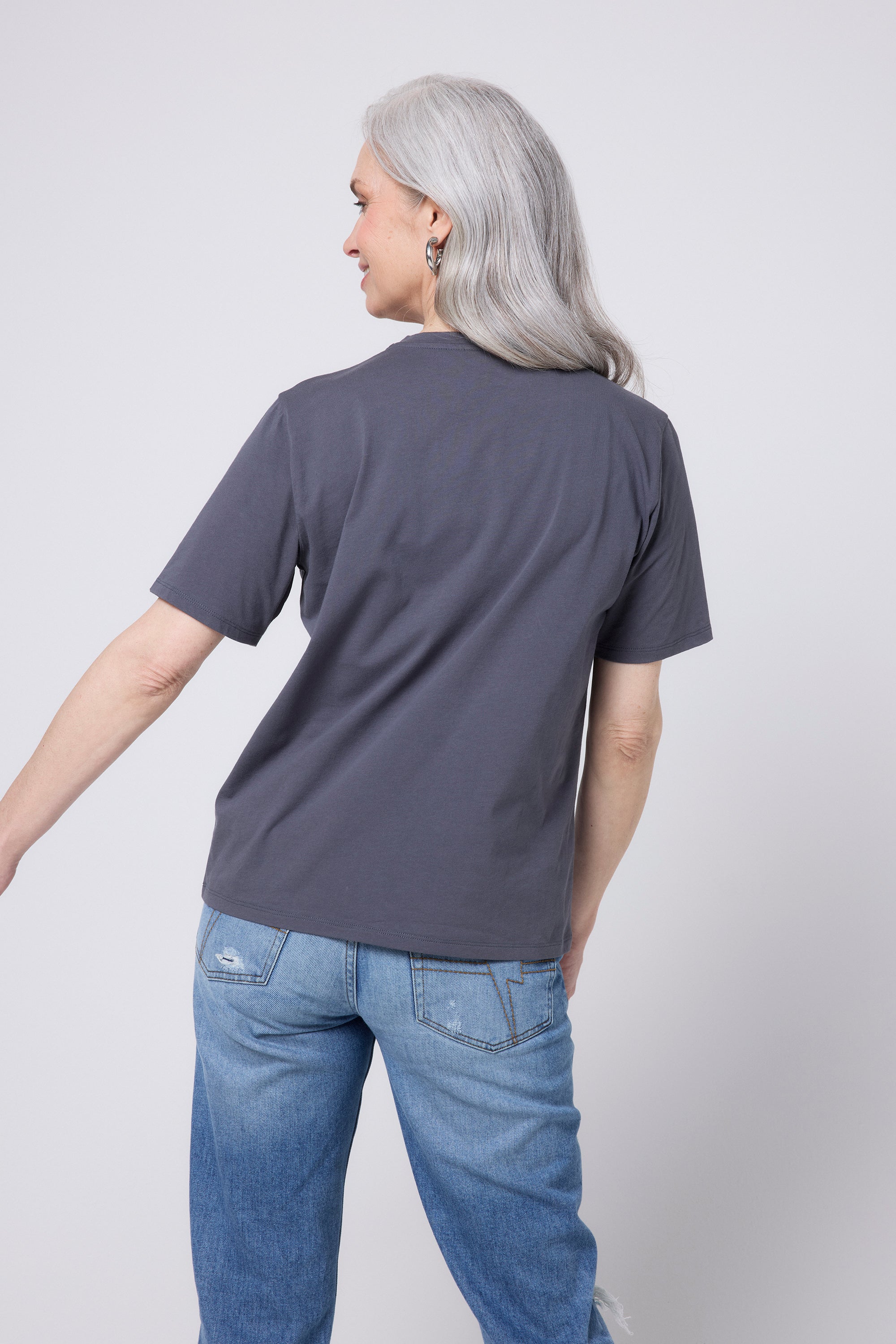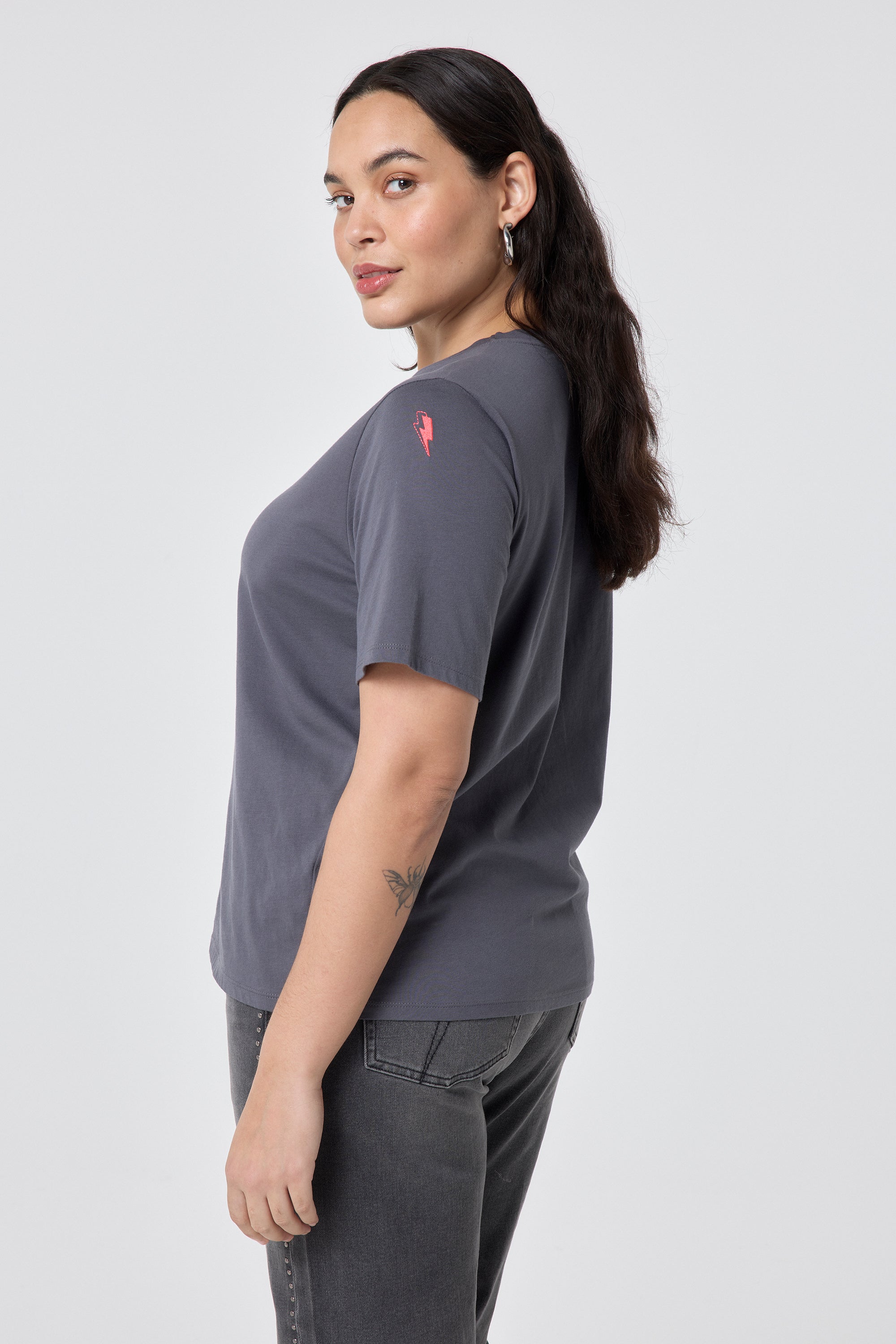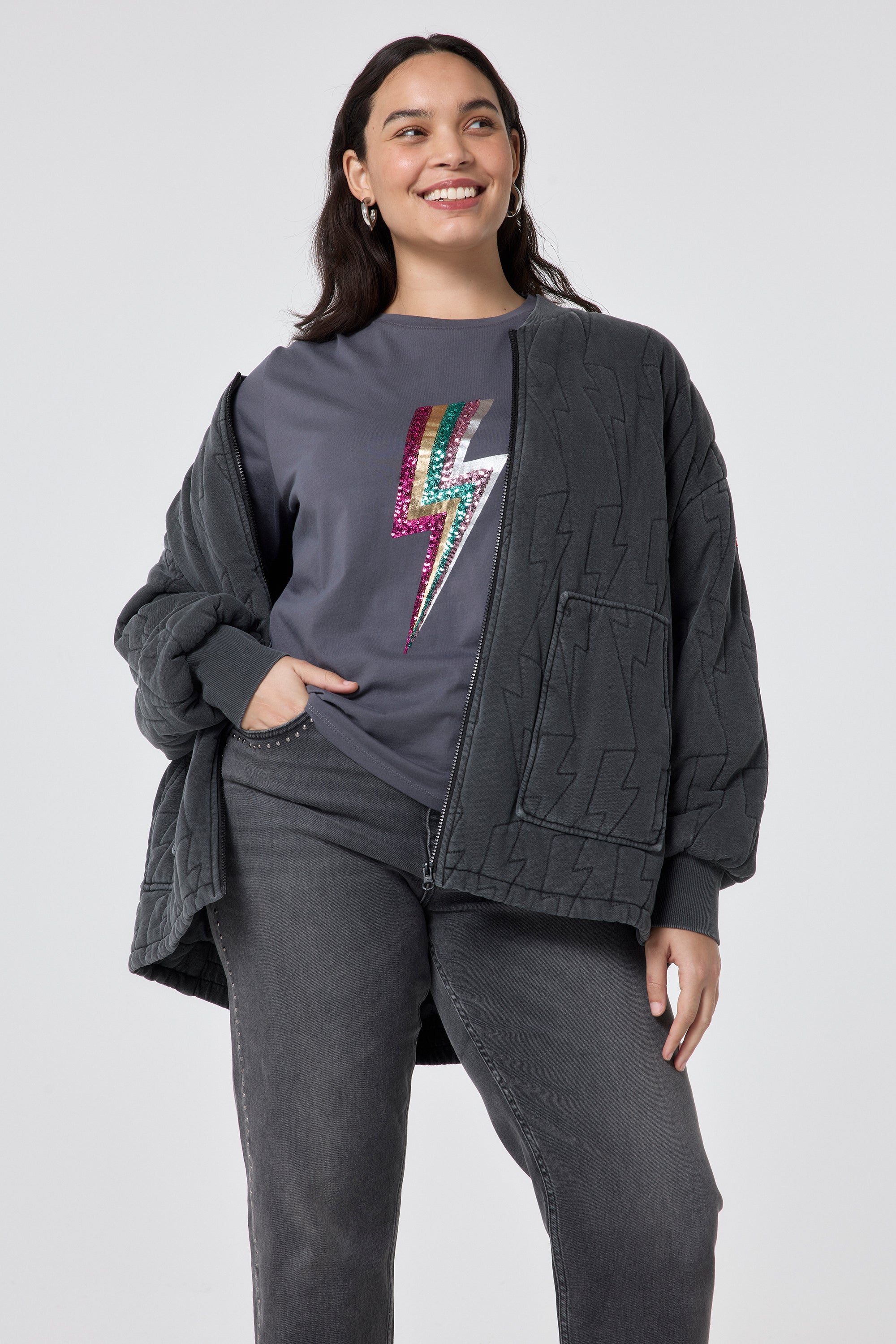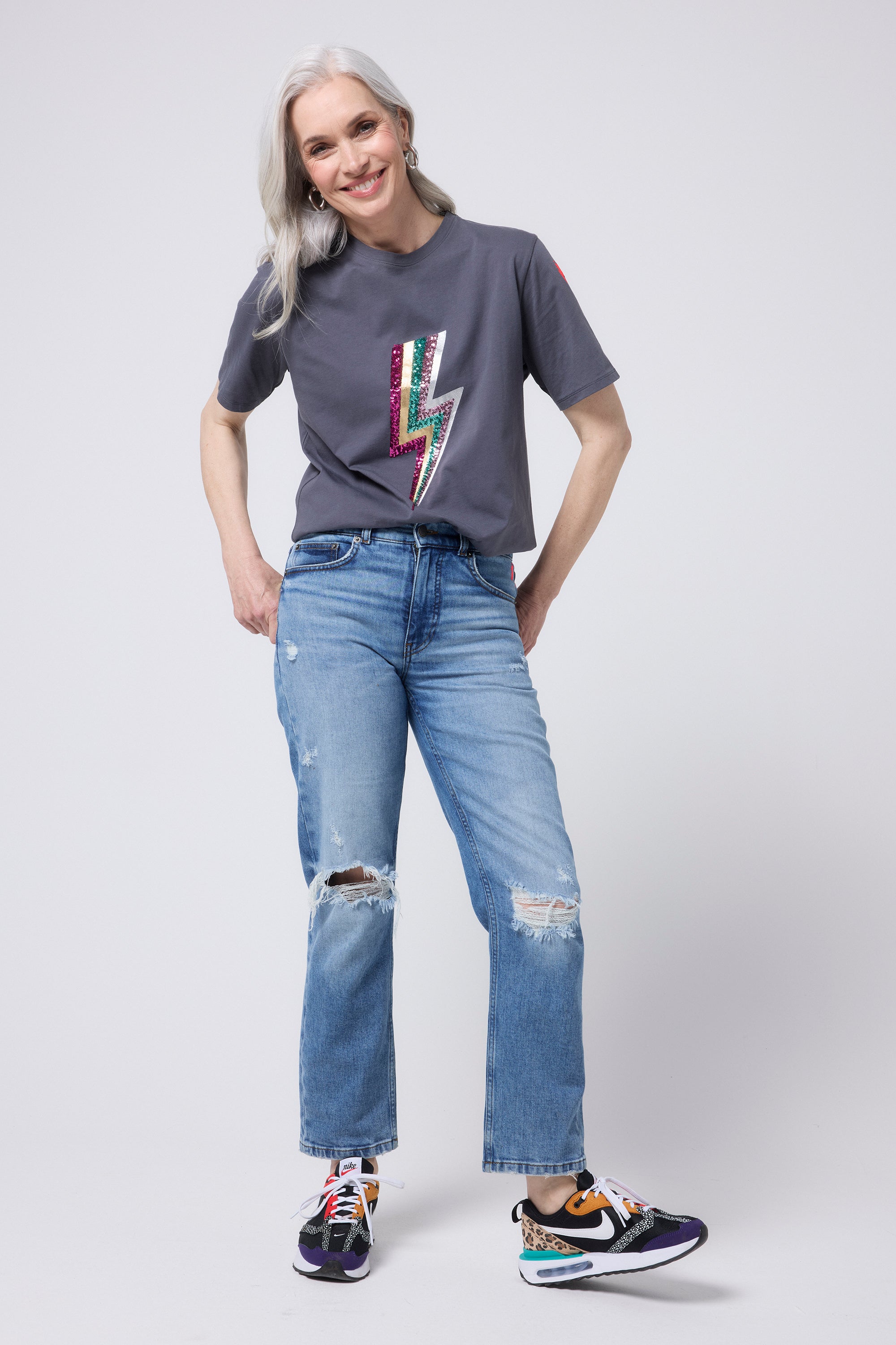 Our grey T-shirt with multi coloured sequin and foil lightning bolt on the front will become your off-duty staple. It's stylish, comfy and filled with superpowers. Complete the look with a pair of flattering Scamp & Dude jeans.