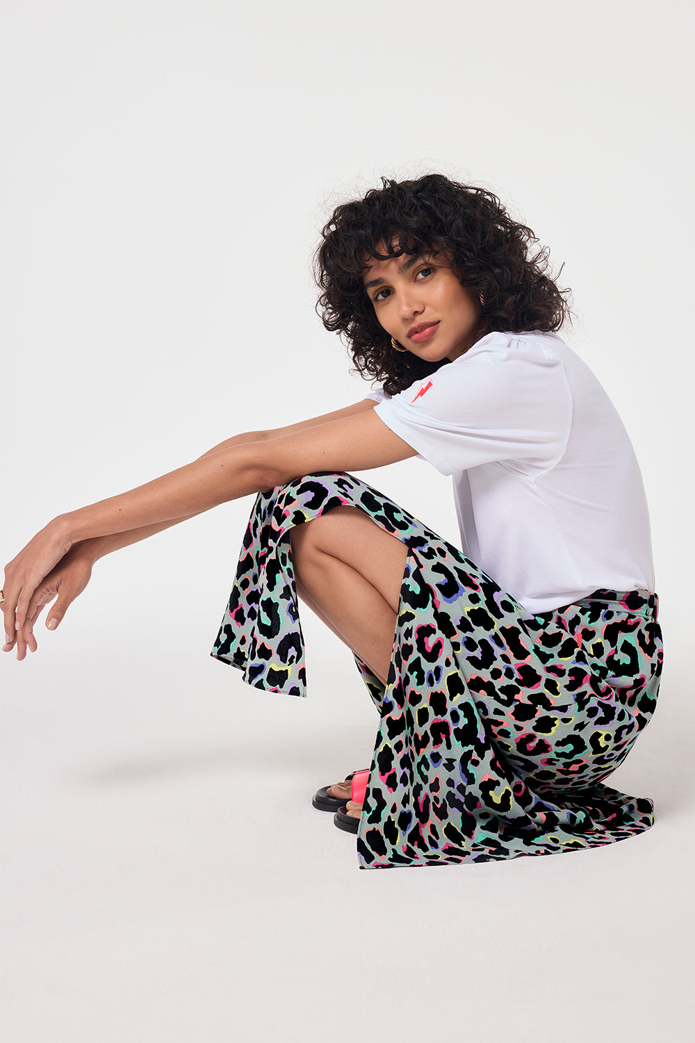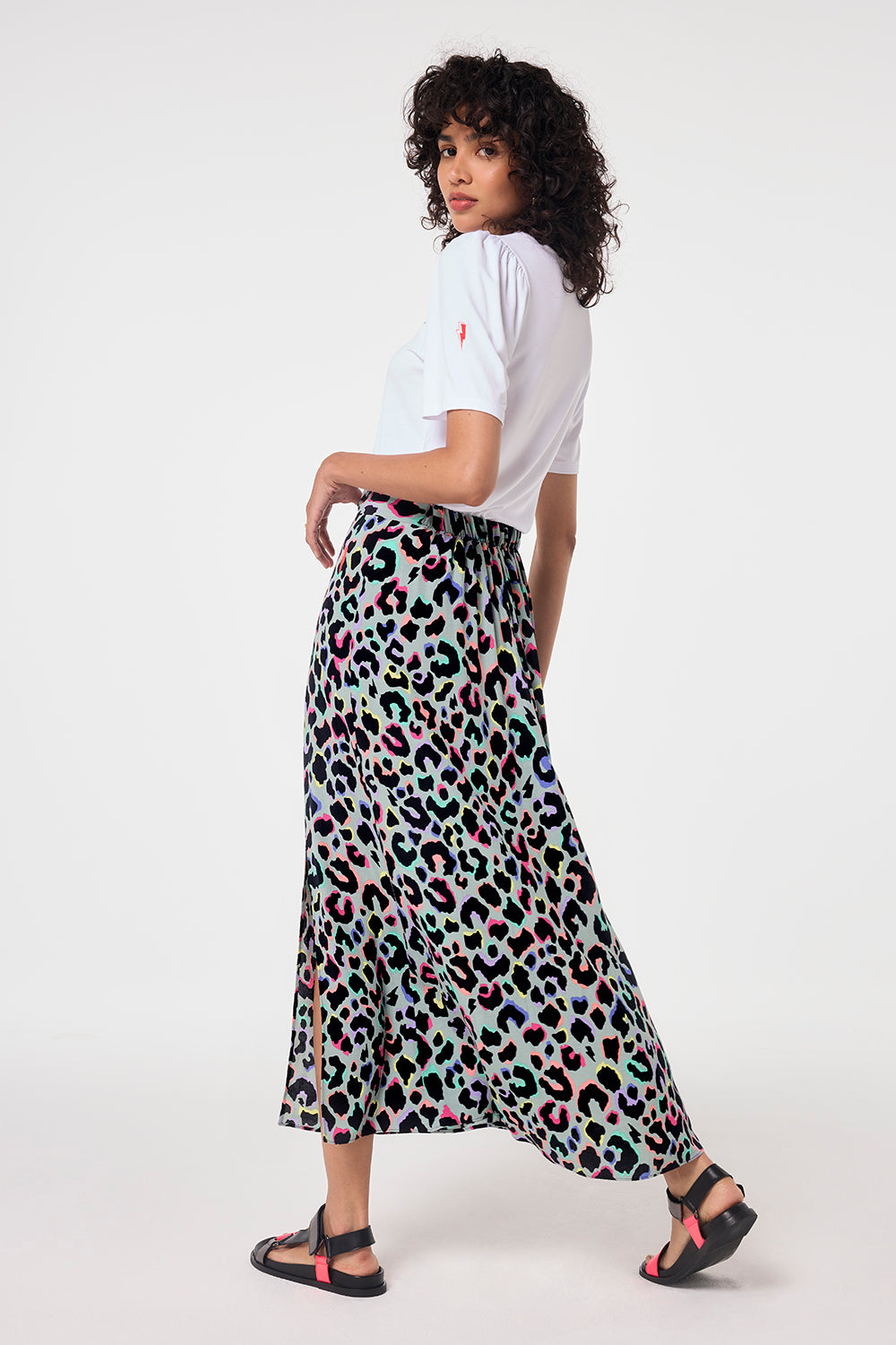 Our pale khaki with rainbow shadow leopard and lightning bolt print split front skirt is a statement making pick that can be amped up for special occasions or pared back with a t-shirt and sandals. It's designed with an elasticated waist on the back for easy comfort.