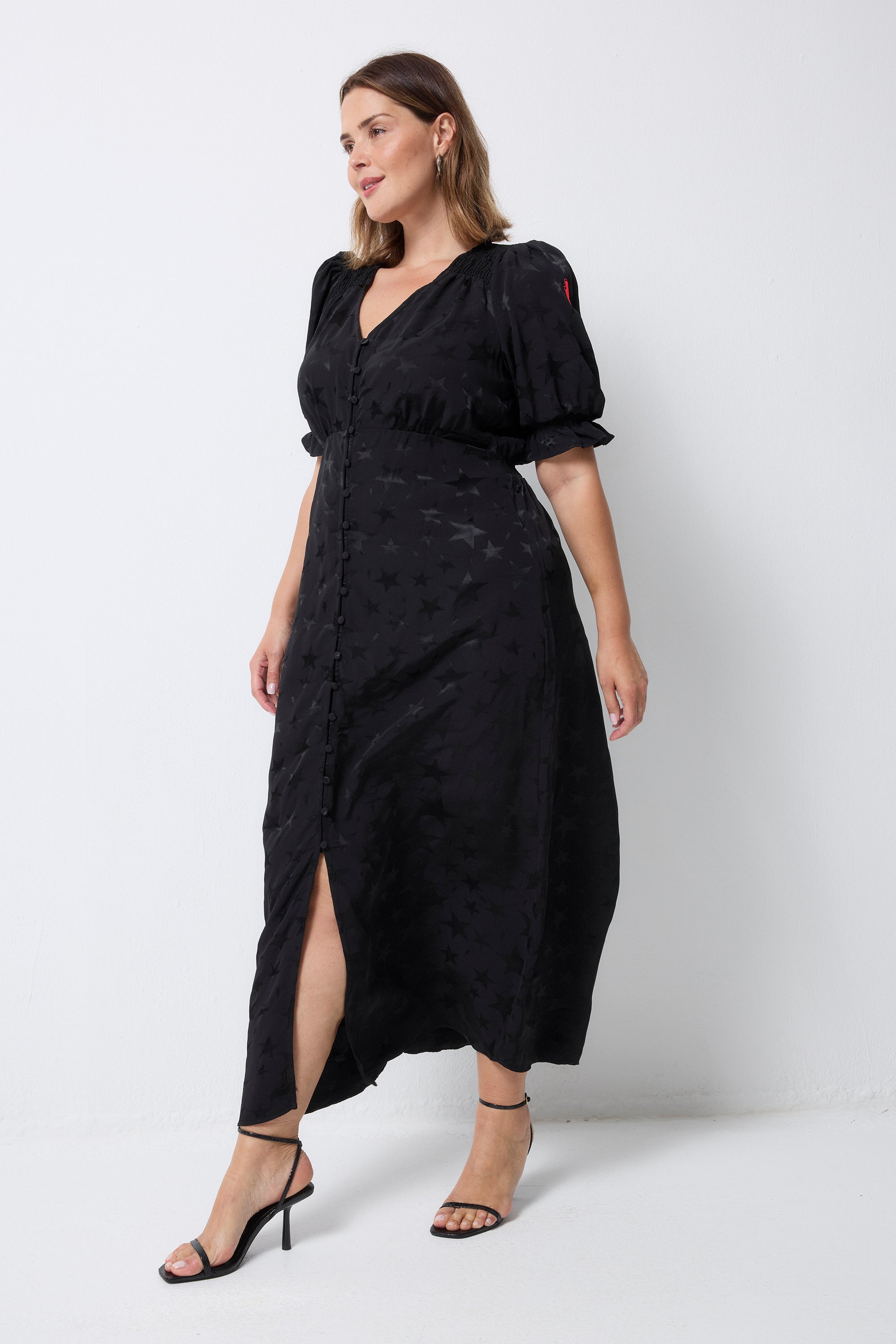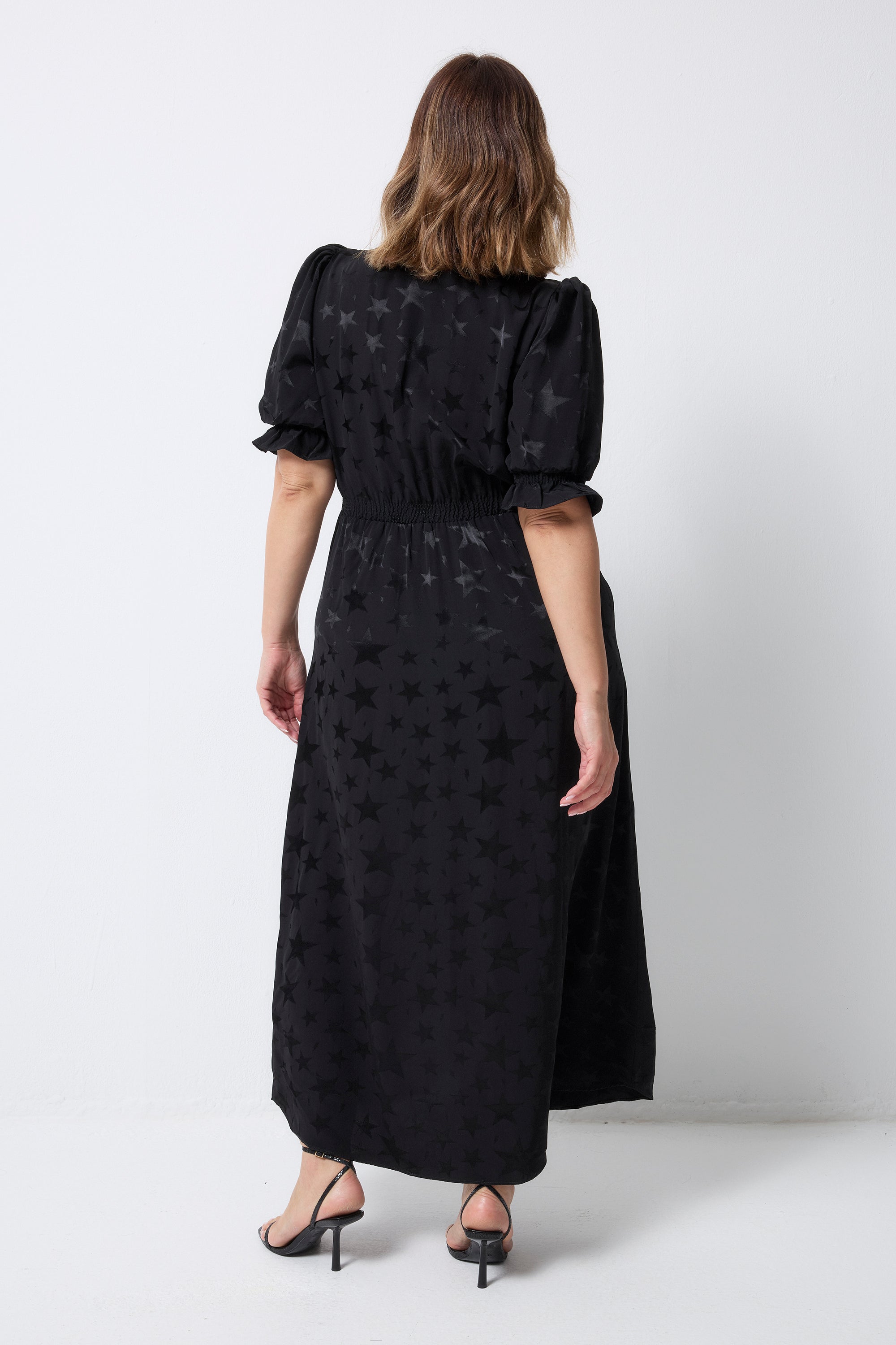 Adorned with stars for a mesmerising finish and elegantly cut to give a feminine silhouette, our black jacquard star and lightning bolt flute sleeve midi tea dress is made from viscose that's beloved for its weightless feel. With a universally flattering v-neckline and short blouson sleeves with a frill at the cuff, this style allows you to showcase its versatility.