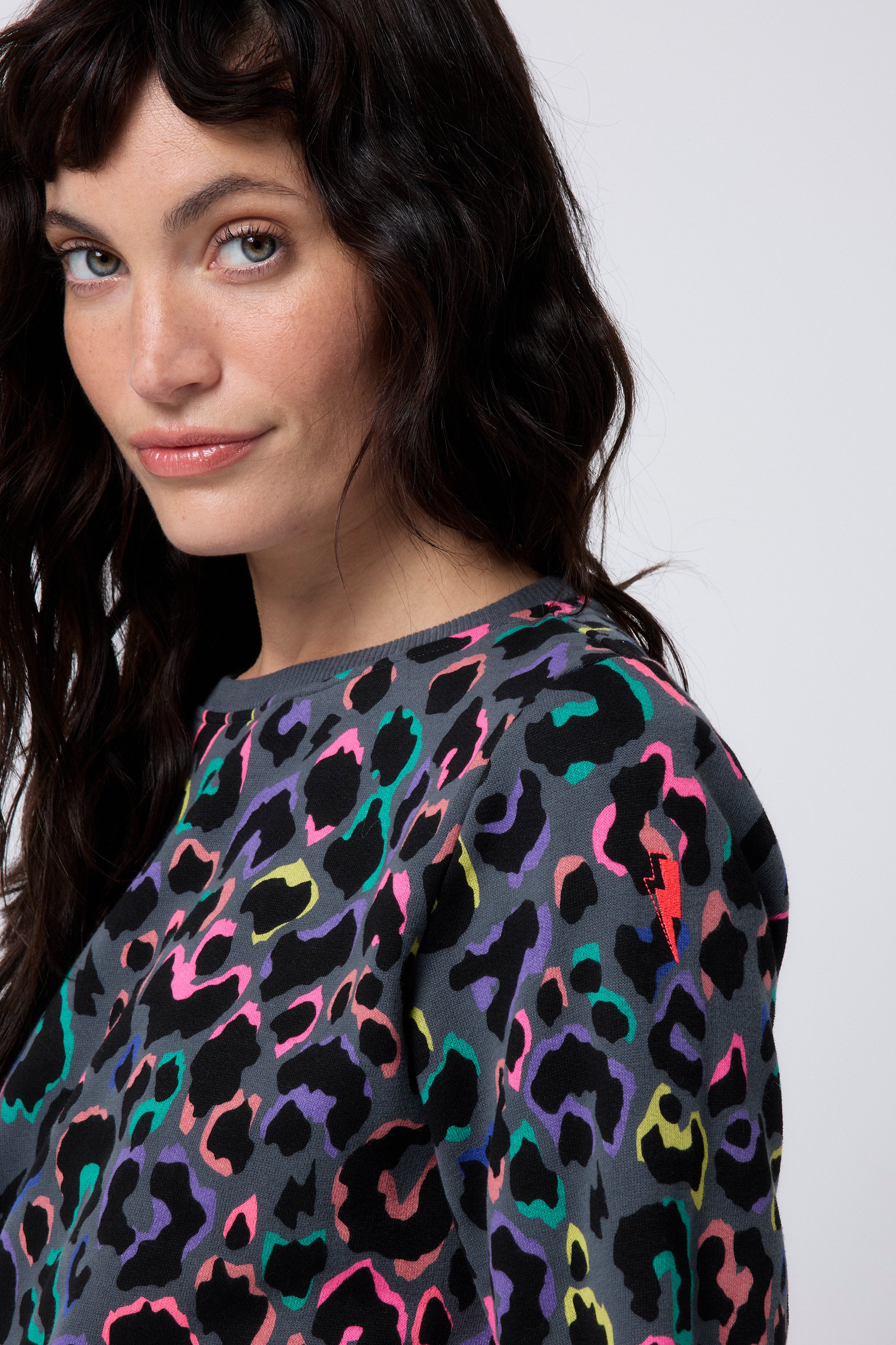 Amp up your casual collection with this grey with rainbow shadow leopard and lightning bolt print classic sweatshirt. The eye-catching design is bound to draw attention wherever you go.