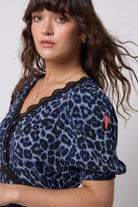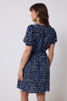 Feel confident in our navy jaguar and lightning bolt lace trim short tea dress. Made in a soft viscose crepe fabric, this versatile short-length dress features a timeless V-neck and short puff sleeves.