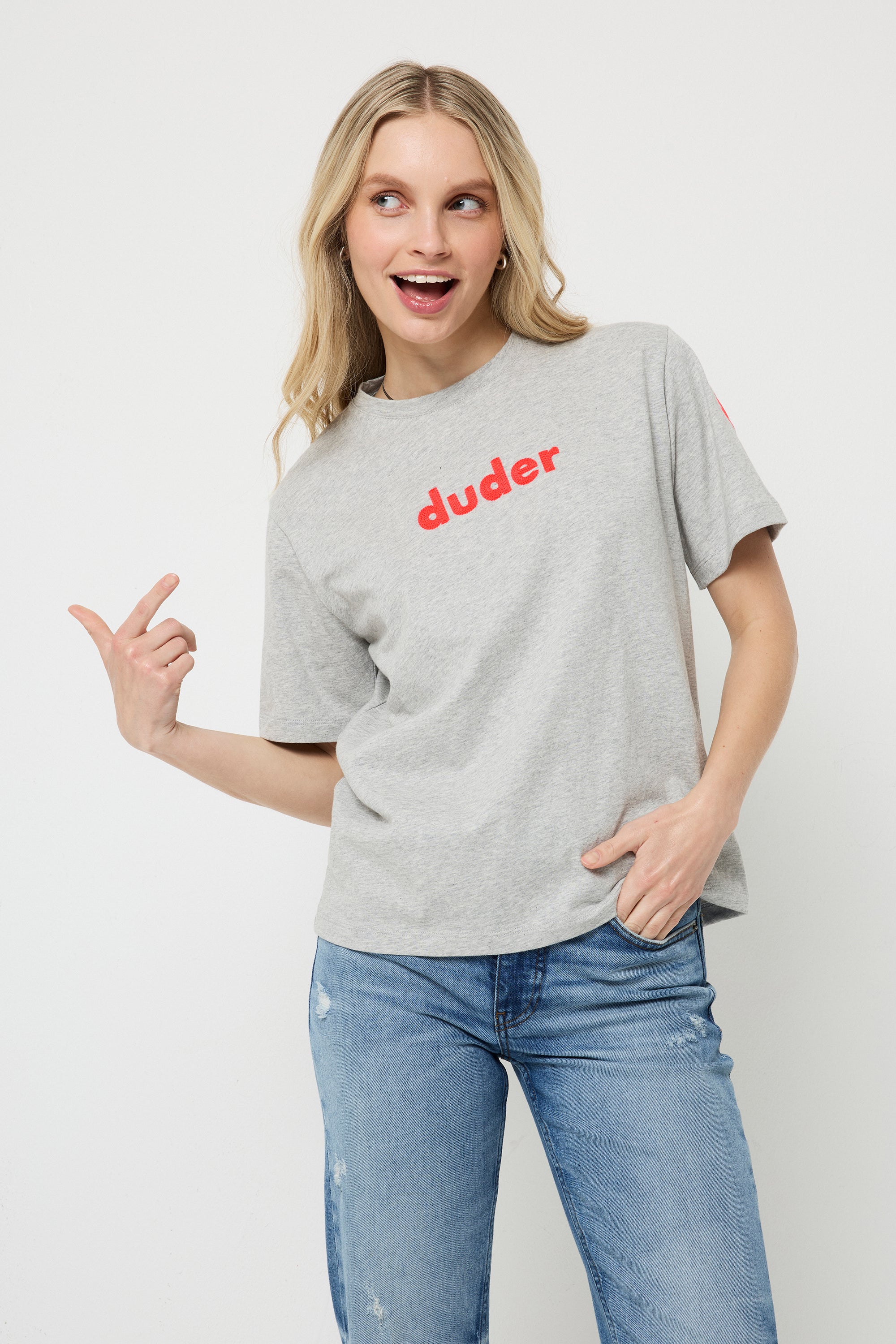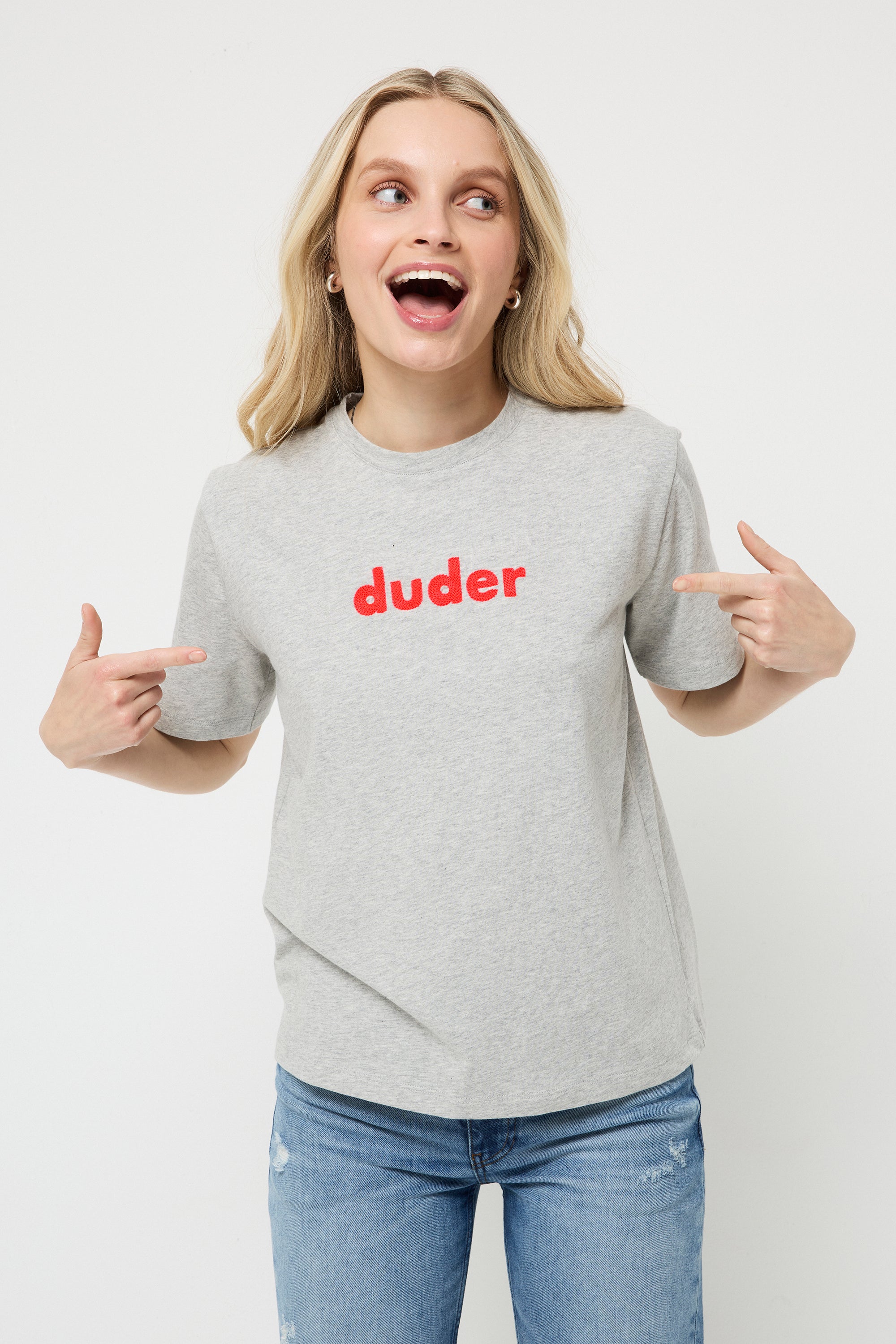 Our grey T-shirt with duder embroidery will become your off-duty staple. It's stylish, comfy and filled with superpowers. Complete the look with a pair of flattering Scamp & Dude jeans.