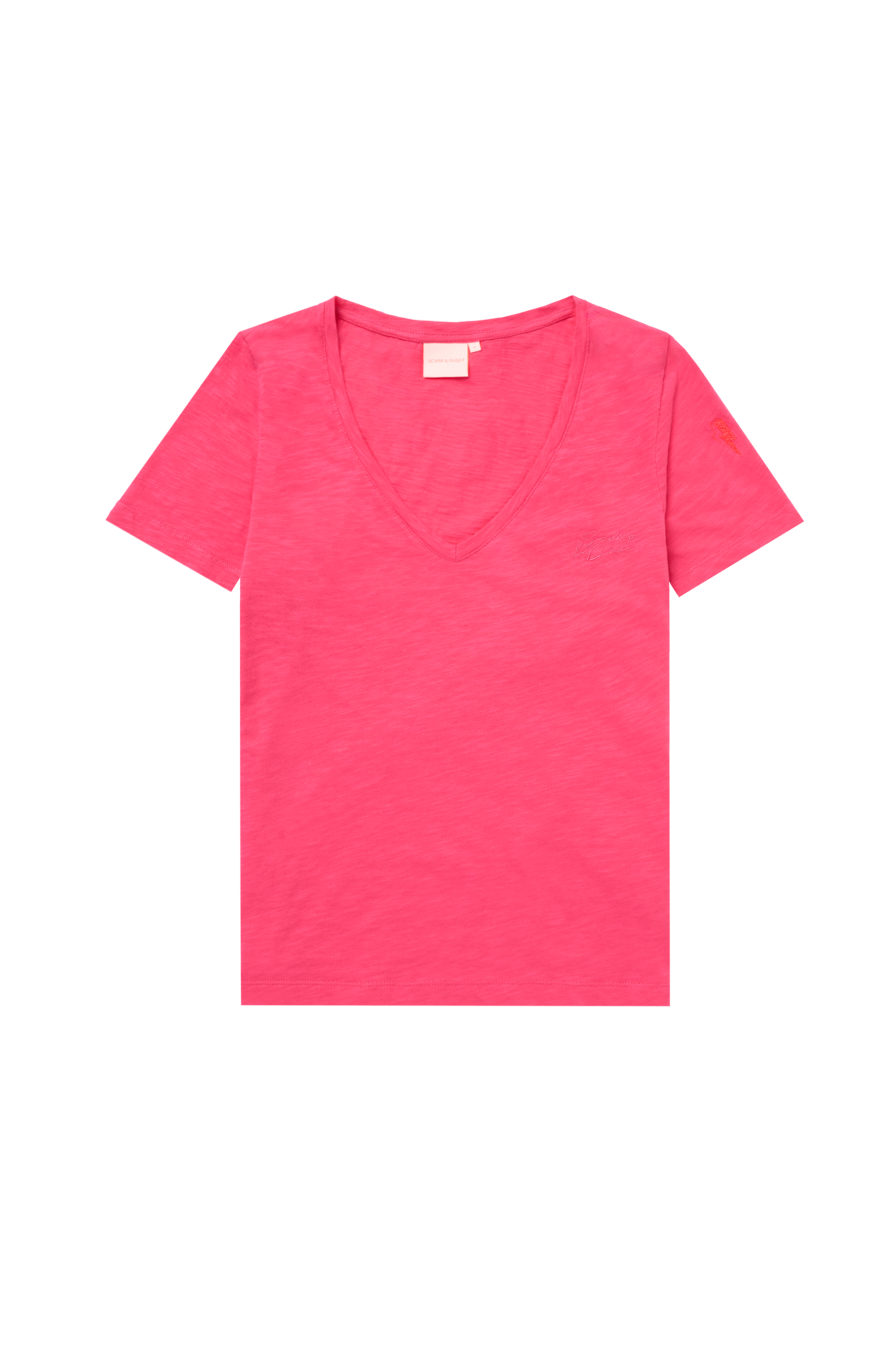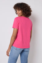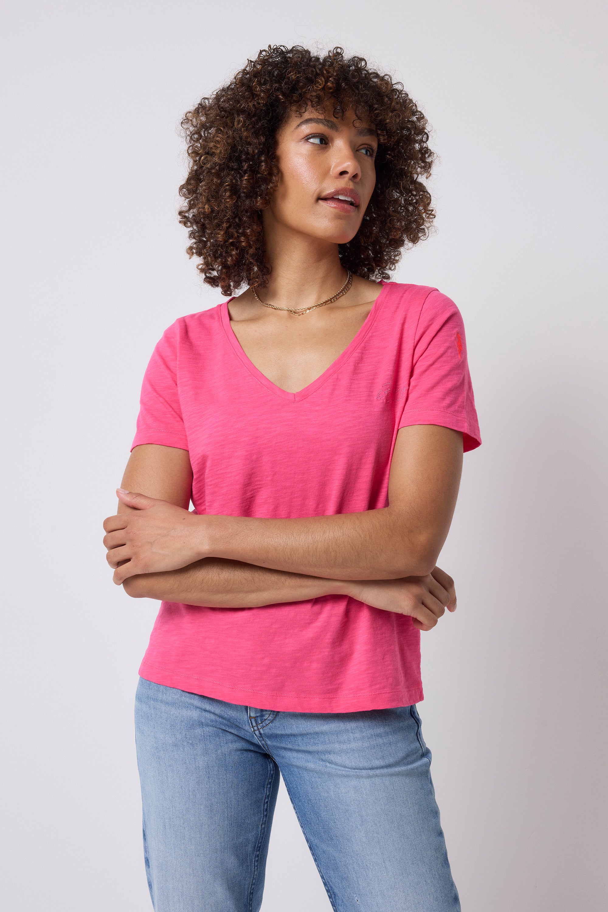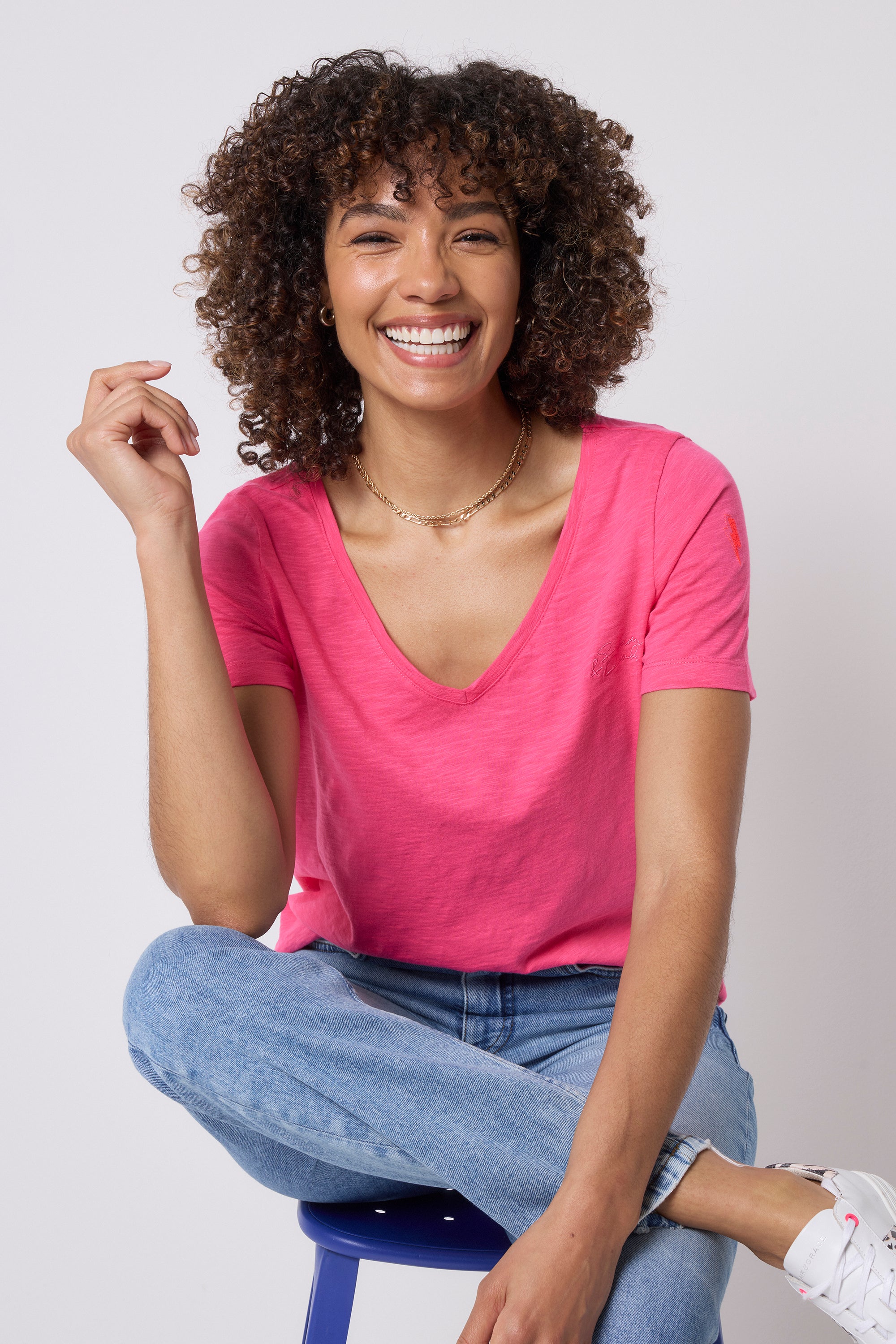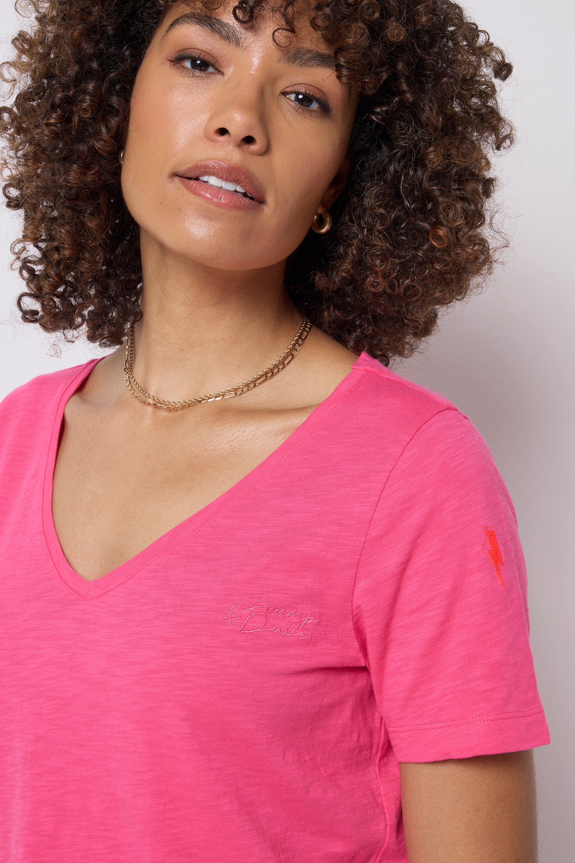 Our pink v-neck T-shirt will become your off-duty staple. It's stylish, comfy and filled with superpowers. Complete the look with a pair of flattering Scamp & Dude jeans.
