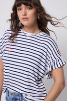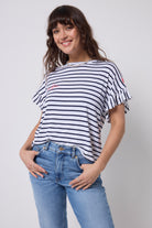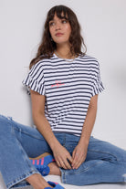Our white T-shirt with navy stripes will become your off-duty staple. It's stylish, comfy and filled with superpowers. Complete the look with a pair of flattering Scamp & Dude jeans.
