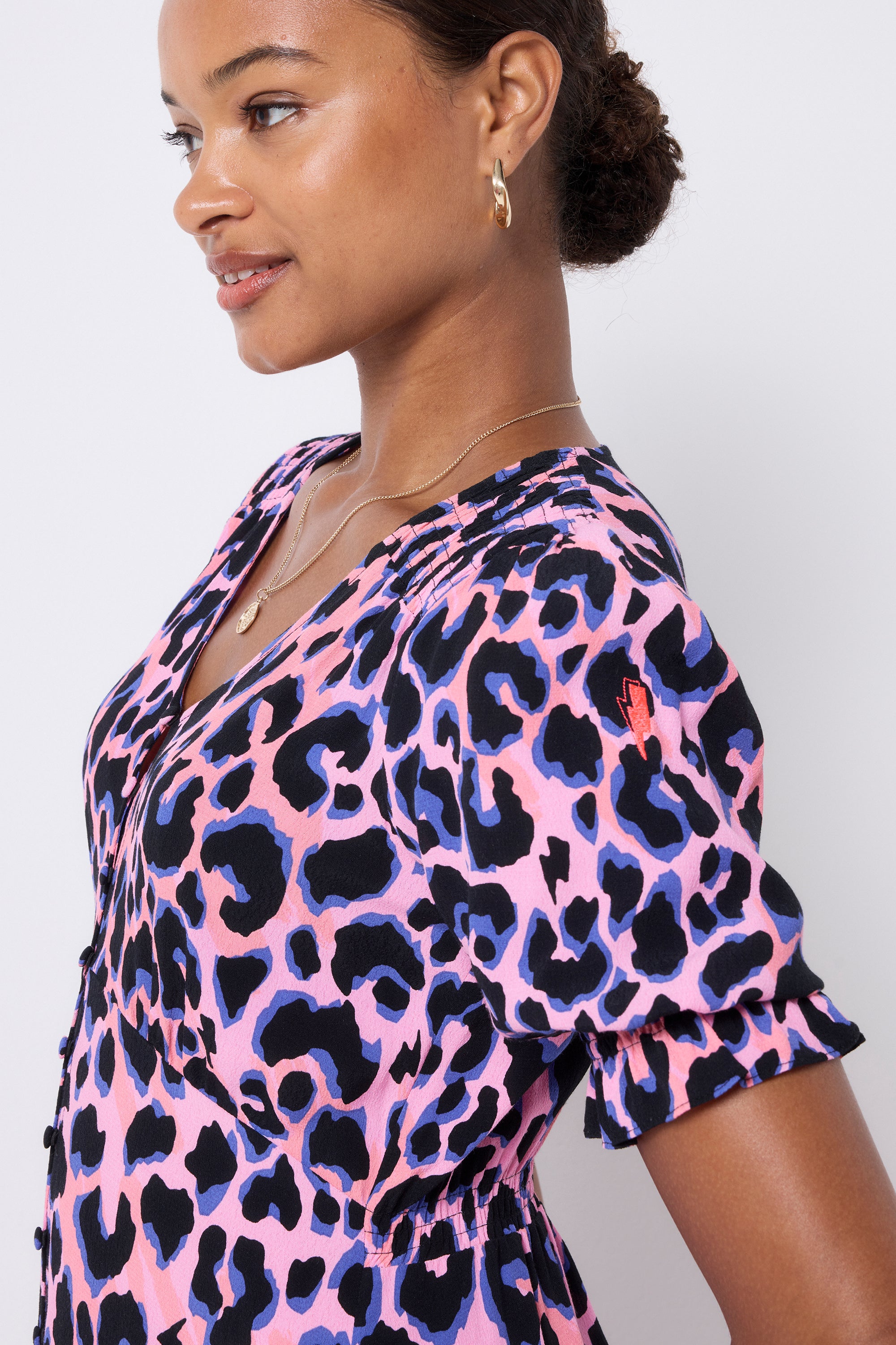 Our bold and brightly coloured pink with blue and black shadow leopard and lightning bolt flute sleeve midi tea dress is a must have this season. Made in a soft viscose crepe fabric, this versatile midi-length dress features a timeless V-neck. Team it with trainers for an easy everyday look and heels for an effortless evening outfit.