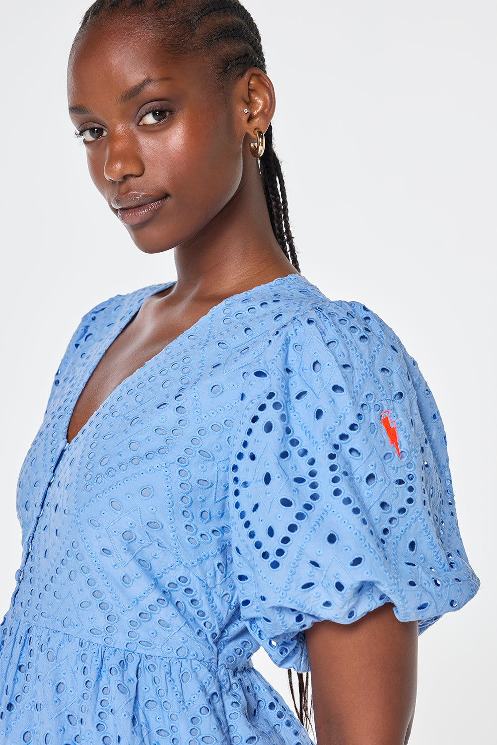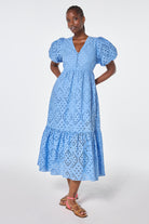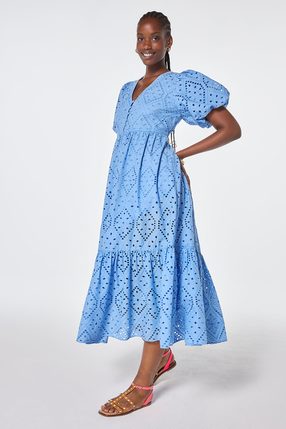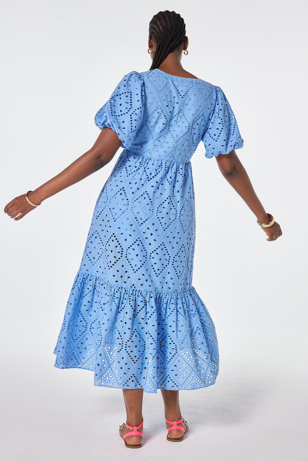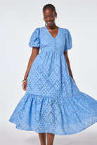 Light Blue Broderie Anglaise Puff Sleeve Midi Dress
