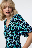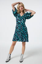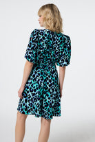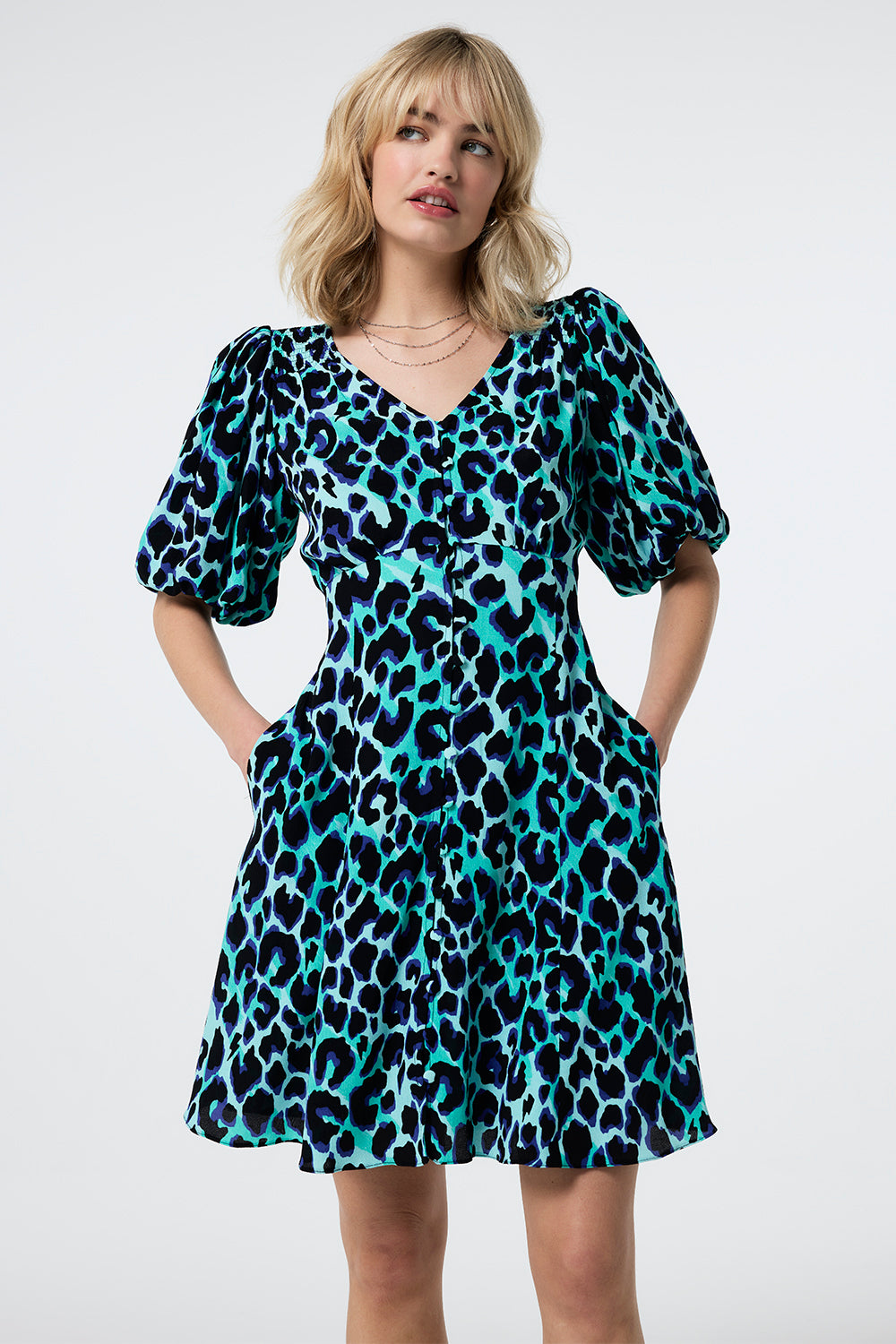 Feel confident in our turquoise, leopard and lightning bolt tea dress. Featuring a timeless v-neck, short puff sleeves and cut to a mini length, style yours for the day with trainers or evening plans with heels.