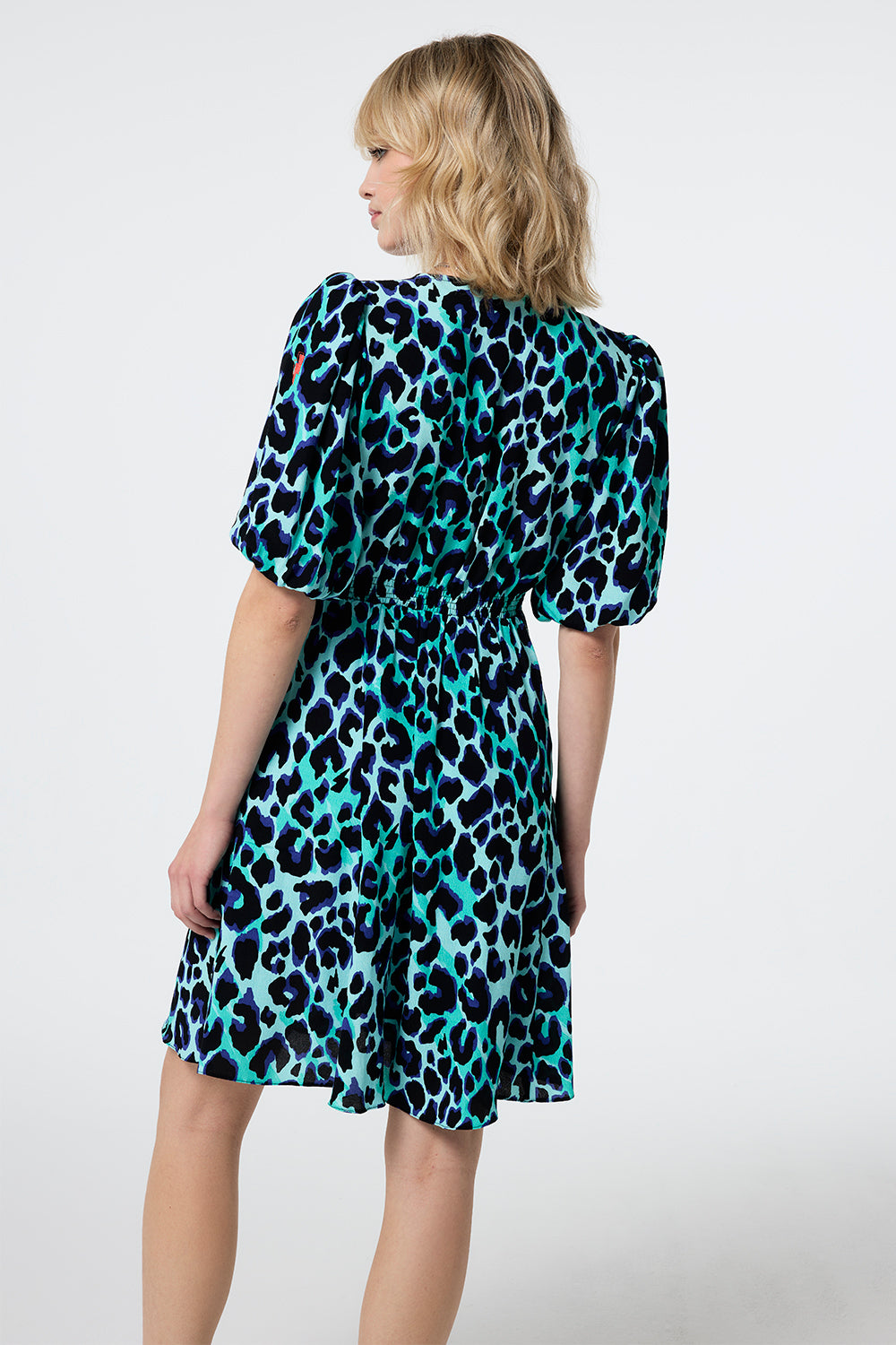 Turquoise with Black and Blue Shadow Leopard Puff Sleeve Short Tea Dress