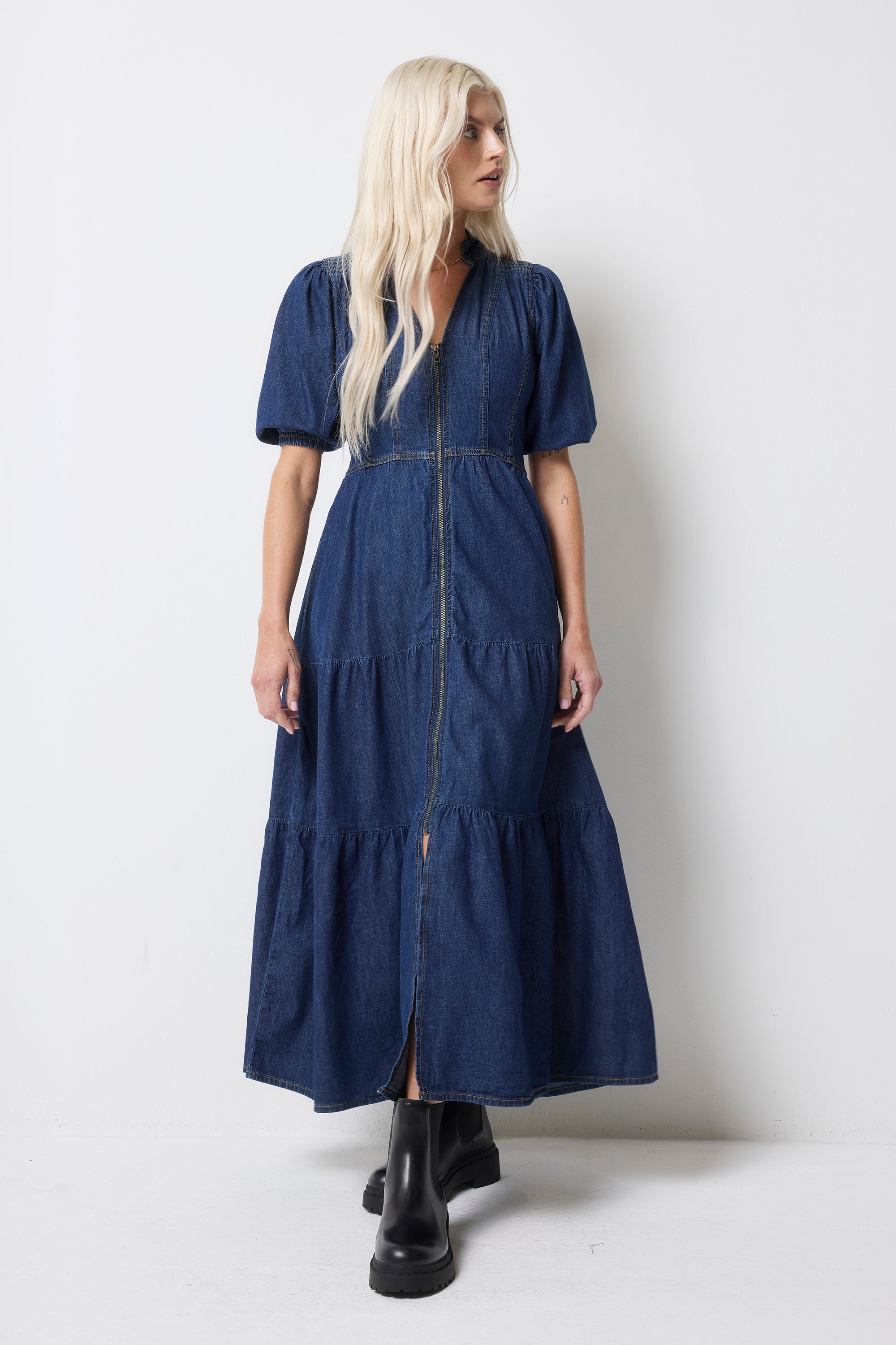 Authentic Indigo Zip Detail Tiered Midi Denim Dress