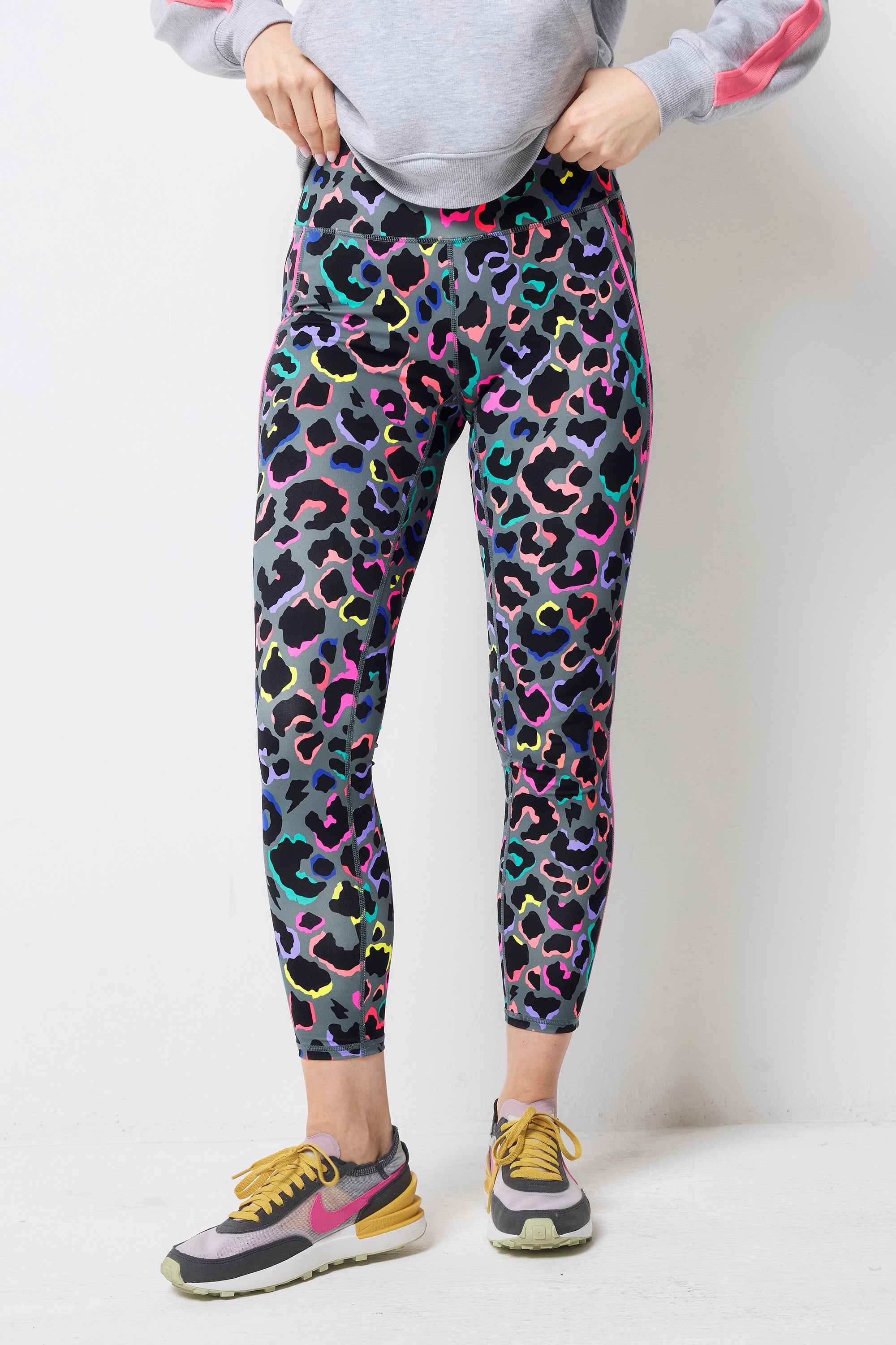 Go from studio to street in prints that perform. Our dark khaki with rainbow shadow leopard and lightning bolt print gym leggings are designed with sculpting four-way stretch fabric and a flattering high-rise waistband. Crafted to cinch and lift in all the right places, these leggings are set to be the show-stopping heroes of your activewear wardrobe.