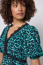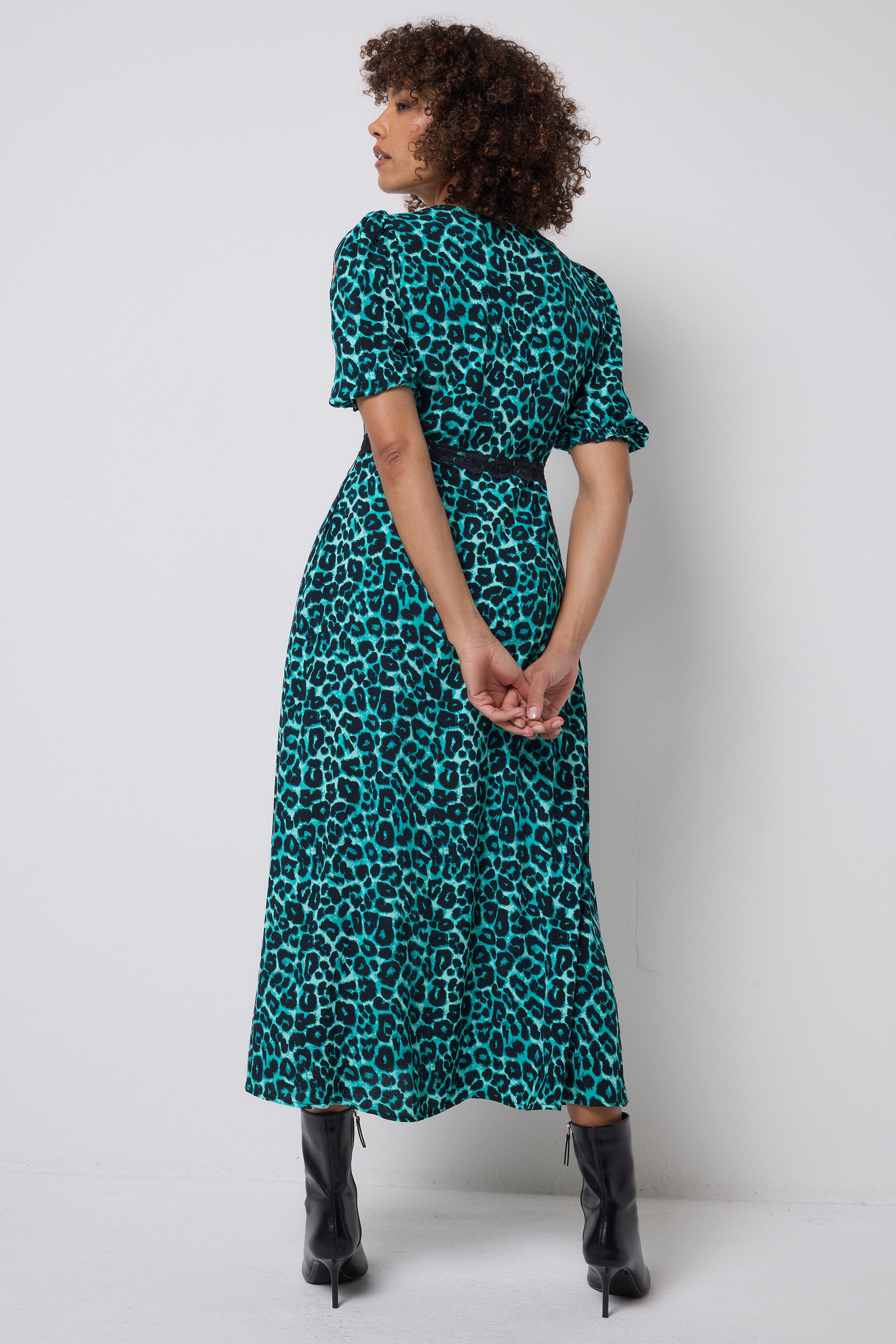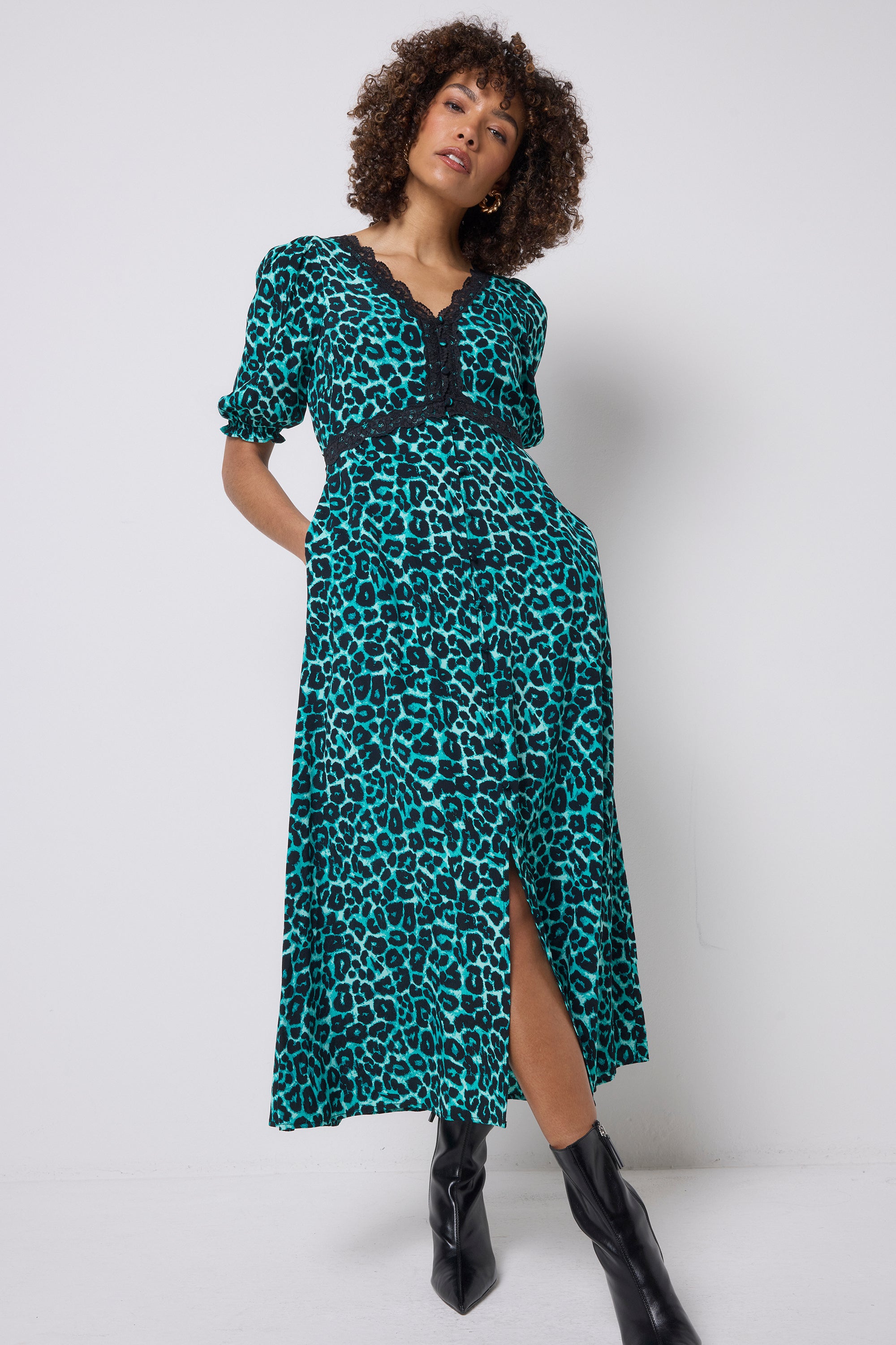 Bold and beautiful, this green jaguar with lace trim dress will make a joyful addition to your wardrobe. Featuring a universally flattering V-neck, short puff sleeves and a classic midi length, style yours with trainers for the day and heeled boots for evening plans.