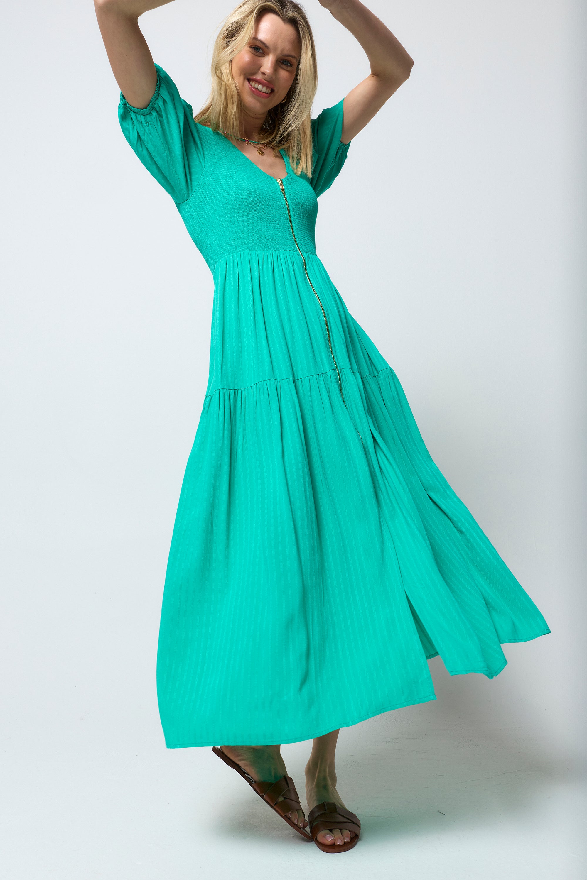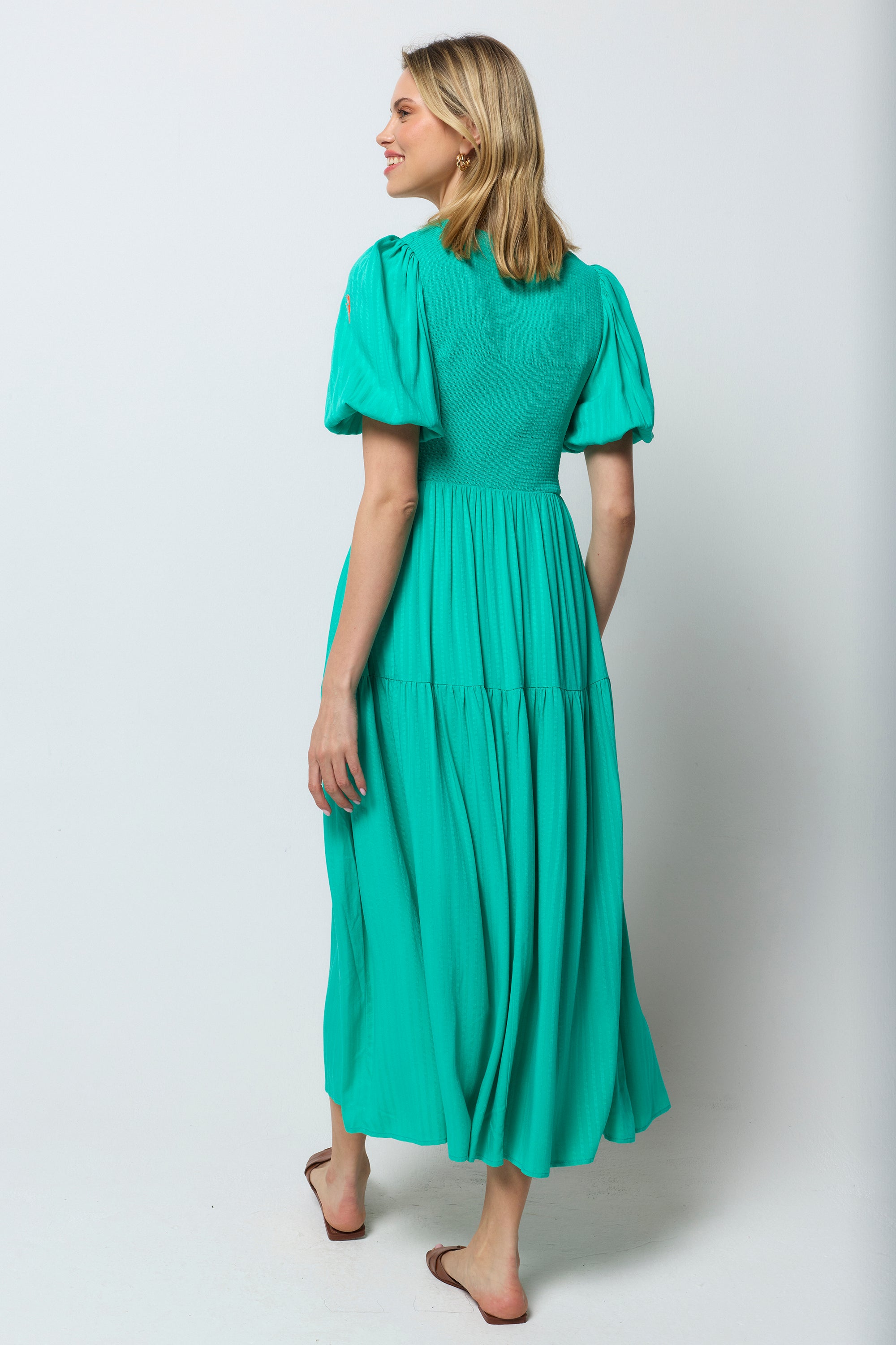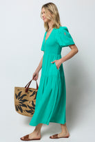 This green midi dress is destined to be a favourite in your wardrobe. It's finished with pretty short blouson sleeves and a tiered skirt for an added touch of style.