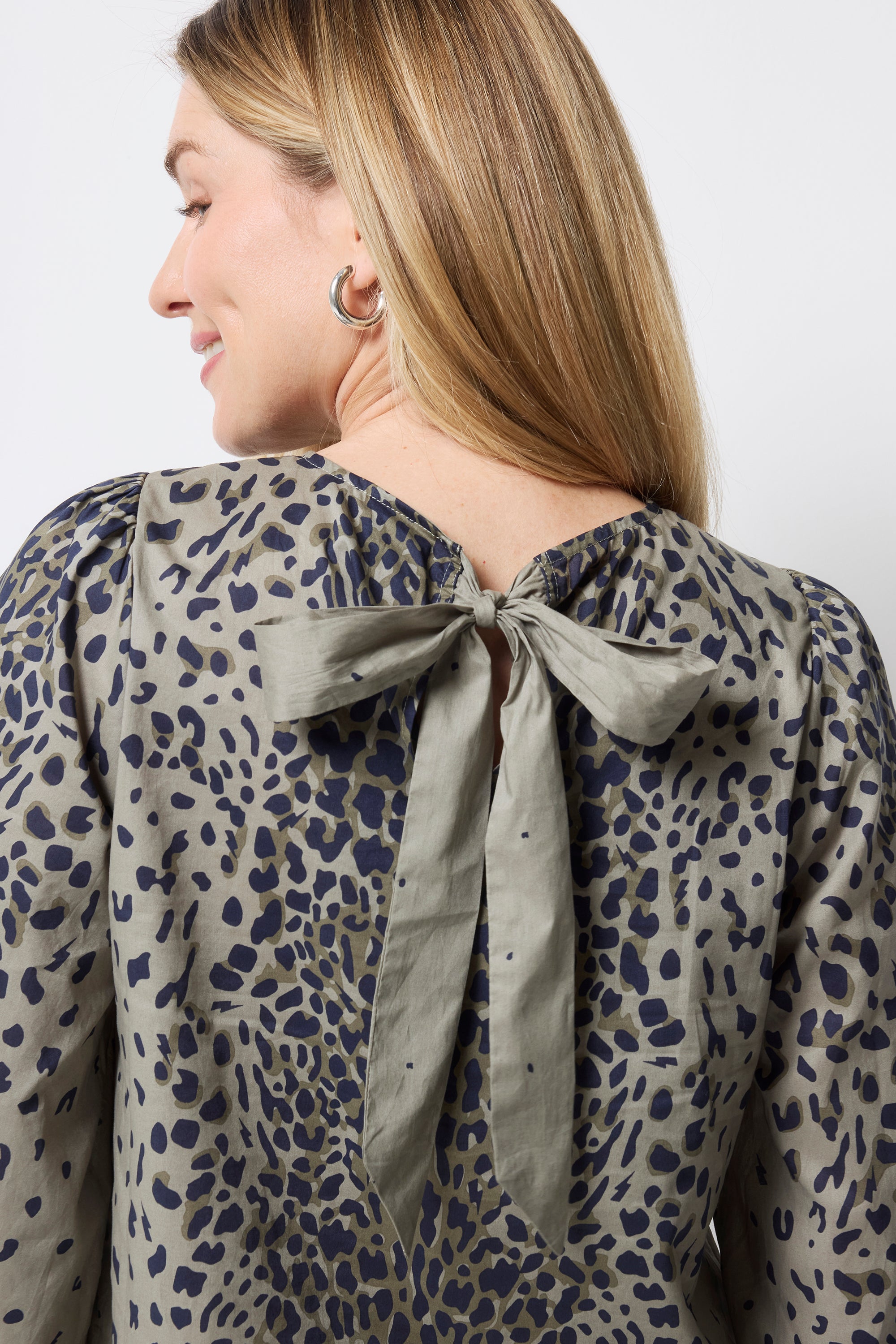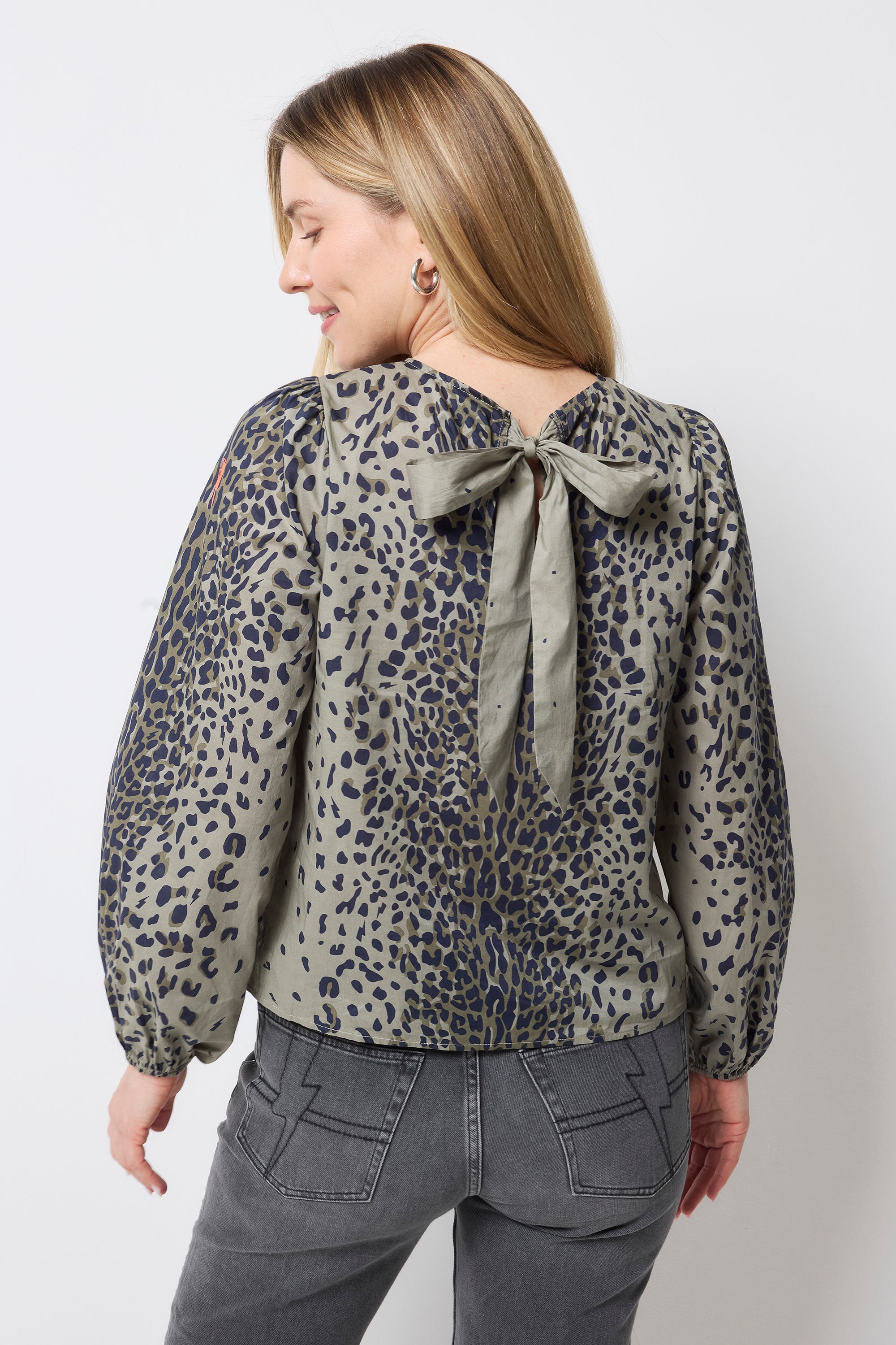 Our khaki with black wild leopard blouse is made from super-soft cotton and has wild leopard engineered placement print. It comes with a statement tie at the back. It's the ultimate in day to night versatility, wear it to easily nail the 'jeans and a nice top' look.
